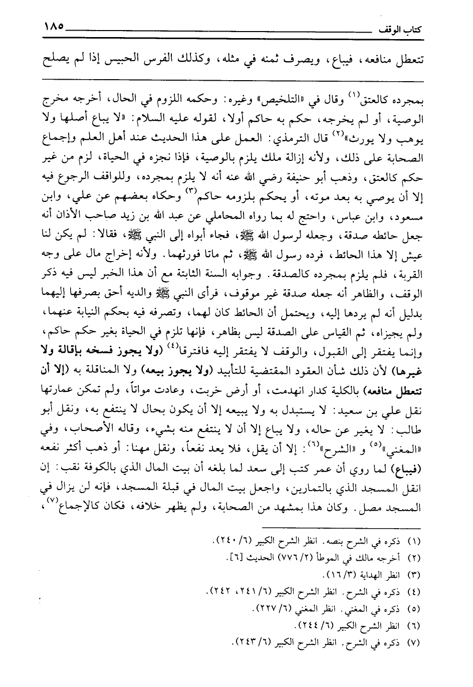 ـــــــــــــــــــــــــــــQبِمُجَرَّدِهِ كَالْعِتْقِ، وَقَالَ فِي " التَّلْخِيصِ " وَغَيْرِهِ: وَحُكْمُهُ اللُّزُومُ فِي الْحَالِ، أَخْرَجَهُ مَخْرَجَ الْوَصِيَّةِ أَوْ لَمْ يُخْرِجْهُ، حَكَمَ بِهِ حَاكِمٌ أَوْ لَا؛ لِقَوْلِهِ - عَلَيْهِ السَّلَامُ -: «لَا يُبَاعُ أَصْلُهَا، وَلَا يُوهَبُ، وَلَا يُورَثُ» . قَالَ التِّرْمِذِيُّ: الْعَمَلُ عَلَى هَذَا الْحَدِيثِ عِنْدَ أَهْلِ الْعِلْمِ، وَإِجْمَاعُ الصَّحَابَةِ عَلَى ذَلِكَ، وَلِأَنَّهُ إِزَالَةُ مِلْكٍ يَلْزَمُ بِالْوَصِيَّةِ، فَإِذَا نَجَزَهُ فِي الْحَيَاةِ لَزِمَ مِنْ غَيْرِ حُكْمٍ كَالْعِتْقِ، وَذَهَبَ أَبُو حَنِيفَةَ - رَضِيَ اللَّهُ عَنْهُ - أَنَّهُ لَا يَلْزَمُ بِمُجَرَّدِهِ، وَلِلْوَاقِفِ الرُّجُوعُ فِيهِ إِلَّا أَنْ يُوصِيَ بِهِ بَعْدَ مَوْتِهِ، أَوْ يَحْكُمَ بِلُزُومِهِ حَاكِمٌ، وَحَكَاهُ بَعْضُهُمْ عَنْ عَلِيٍّ، وَابْنِ مَسْعُودٍ، وَابْنِ عَبَّاسٍ، وَاحْتَجَّ لَهُ بِمَا رَوَاهُ الْمَحَامِلِيُّ «عَنْ عَبْدِ اللَّهِ بْنِ زَيْدٍ صَاحِبِ الْأَذَانِ أَنَّهُ جَعَلَ حَائِطَهُ صَدَقَةً، وَجَعَلَهُ لِرَسُولِ اللَّهِ - صَلَّى اللَّهُ عَلَيْهِ وَسَلَّمَ - فَجَاءَ أَبَوَاهُ إِلَى النَّبِيِّ - صَلَّى اللَّهُ عَلَيْهِ وَسَلَّمَ - فَقَالَا: لَمْ يَكُنْ لَنَا عَيْشٌ إِلَّا هَذَا الْحَائِطُ، فَرَدَّهُ رَسُولُ اللَّهِ - صَلَّى اللَّهُ عَلَيْهِ وَسَلَّمَ - ثُمَّ مَاتَا فَوَرِثَهُمَا» ؛ وَلِأَنَّهُ إِخْرَاجُ مَالٍ عَلَى وَجْهِ الْقُرْبَةِ فَلَمْ يَلْزَمْ بِمُجَرَّدِهِ كَالصَّدَقَةِ، وَجَوَابُهُ السُّنَّةُ الثَّابِتَةُ، مَعَ أَنَّ هَذَا الْخَبَرَ لَيْسَ فِيهِ ذِكْرُ الْوَقْفِ، وَالظَّاهِرُ أَنَّهُ جَعَلَهُ صَدَقَةً غَيْرَ مَوْقُوفٍ، فَرَأَى النَّبِيُّ - صَلَّى اللَّهُ عَلَيْهِ وَسَلَّمَ - وَالِدَيْهِ أَحَقَّ بِصَرْفِهَا إِلَيْهِمَا، بِدَلِيلِ أَنَّهُ لَمْ يَرُدَّهَا إِلَيْهِ، وَيَحْتَمِلُ أَنَّ الْحَائِطَ كَانَ لَهُمَا، وَتَصَرُّفُهُ فِيهِ بِحُكْمِ النِّيَابَةِ عَنْهُمَا، وَلَمْ يُجِيزَاهُ، ثُمَّ الْقِيَاسُ عَلَى الصَّدَقَةِ لَيْسَ بِظَاهِرٍ، فَإِنَّهَا تَلْزَمُ فِي الْحَيَاةِ بِغَيْرِ حُكْمِ حَاكِمٍ، وَإِنَّمَا يَفْتَقِرُ إِلَى الْقَبُولِ، وَالْوَقْفُ لَا يَفْتَقِرُ إِلَيْهِ، فَافْتَرَقَا، (وَلَا يَجُوزُ فَسْخُهُ بِإِقَالَةٍ وَلَا غَيْرِهَا) ؛ لِأَنَّ ذَلِكَ شَأْنُ الْعُقُودِ الْمُقْتَضِيَةِ لِلتَّأْبِيدِ (وَلَا يَجُوزُ بَيْعُهُ) وَلَا الْمُنَاقَلَةُ بِهِ (إِلَّا أَنْ تَتَعَطَّلَ مَنَافِعُهُ) بِالْكُلِّيَّةِ، كَدَارٍ انْهَدَمَتْ، أَوْ أَرْضٍ خَرِبَتْ، وَعَادَتْ مَوَاتًا، وَلَمْ تُمْكِنْ عِمَارَتُهَا، نَقَلَ عَلِيُّ بْنُ سَعِيدٍ: لَا يَسْتَبْدِلُ بِهِ وَلَا يَبِيعُهُ إِلَّا أَنْ يَكُونَ بِحَالٍ لَا يَنْتَفِعُ بِهِ، وَنَقَلَ أَبُو طَالِبٍ: لَا يُغَيَّرُ عَنْ حَالِهِ، وَلَا يُبَاعُ إِلَّا أَنْ لَا يَنْتَفِعَ مِنْهُ بِشَيْءٍ، وَقَالَهُ الْأَصْحَابُ، وَفِي " الْمُغْنِي " وَ " الشَّرْحِ " إِلَّا أَنْ يَقِلَّ فَلَا يُعَدُّ نَفْعًا، وَنَقَلَ مُهَنَّا: أَوْ ذَهَبَ أَكْثَرُ نَفْعِهِ (فَيُبَاعُ) ؛ لِمَا رُوِيَ أَنَّ عُمَرَ كَتَبَ إِلَى سَعْدٍ لَمَّا بَلَغَهُ أَنَّ بَيْتَ الْمَالِ الَّذِي بِالْكُوفَةِ نُقِبَ: أَنِ انْقُلِ الْمَسْجِدَ الَّذِي بِالتَّمَارِينِ، وَاجْعَلْ بَيْتَ الْمَالِ فِي قِبْلَةِ الْمَسْجِدِ، فَإِنَّهُ لَنْ يَزَالَ فِي الْمَسْجِدِ مُصَلٍّ، وَكَانَ هَذَا بِمَشْهَدٍ مِنَ الصَّحَابَةِ، وَلَمْ يَظْهَرْ خِلَافُهُ، فَكَانَ كَالْإِجْمَاعِ،
