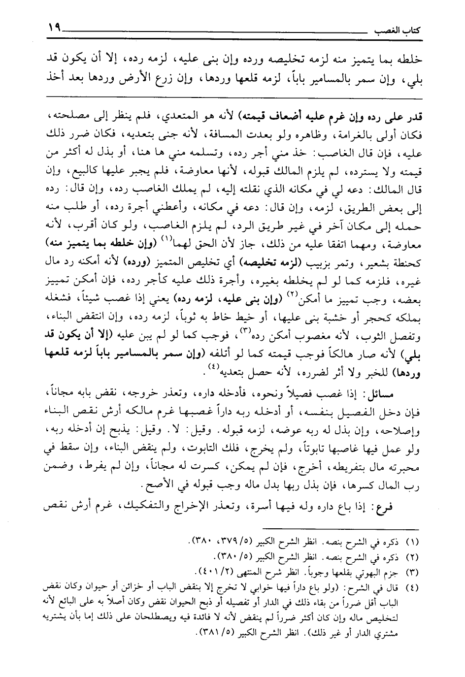 ـــــــــــــــــــــــــــــQقَدَرَ عَلَى رَدِّهِ، وَإِنْ غَرِمَ عَلَيْهِ أَضْعَافَ قِيمَتِهِ) لِأَنَّهُ هُوَ الْمُتَعَدِّي فَلَمْ يَنْظُرْ إِلَى مَصْلَحَتِهِ، فَكَانَ أَوْلَى بِالْغَرَامَةِ، وَظَاهِرُهُ وَلَوْ بَعُدَتِ الْمَسَافَةُ؛ لِأَنَّهُ جَنَى بِتَعَدِّيهِ، فَكَانَ ضَرَرُ ذَلِكَ عَلَيْهِ، فَإِنْ قَالَ الْغَاصِبُ: خُذْ مِنِّي أَجْرَ رَدِّهِ، وَتَسَلَّمْهُ مِنِّي هَاهُنَا، أَوْ بَذَلَ لَهُ أَكْثَرَ مِنْ قِيمَتِهِ وَلَا يَسْتَرِدُّهُ لَمْ يَلْزَمِ الْمَالِكَ قَبُولُهُ؛ لِأَنَّهَا مُعَاوَضَةٌ فَلَمْ يُجْبَرْ عَلَيْهَا كَالْبَيْعِ، وَإِنْ قَالَ الْمَالِكُ: دَعْهُ لِي فِي مَكَانِهِ الَّذِي نَقَلْتَهُ إِلَيْهِ، لَمْ يَمْلِكِ الْغَاصِبُ رَدَّهُ، وَإِنْ قَالَ: رُدَّهُ إِلَى بَعْضِ الطَّرِيقِ، لَزِمَهُ، وَإِنْ قَالَ: دَعْهُ فِي مَكَانِهِ وَأَعْطِنِي أُجْرَةَ رَدِّهِ، أَوْ طَلَبَ مِنْهُ حَمْلَهُ إِلَى مَكَانٍ آخَرَ فِي غَيْرِ طَرِيقِ الرَّدِّ لَمْ يُلْزَمِ الْغَاصِبُ وَلَوْ كَانَ أَقْرَبَ؛ لِأَنَّهُ مُعَاوَضَةٌ، وَمَهْمَا اتَّفَقَا عَلَيْهِ مِنْ ذَلِكَ جَازَ؛ لِأَنَّ الْحَقَّ لَهُمَا (وَإِنْ خَلَطَهُ بِمَا يَتَمَيَّزُ مِنْهُ) كَحِنْطَةٍ بِشَعِيرٍ، وَتَمْرٍ بِزَبِيبٍ (لَزِمَهُ تَخْلِيصُهُ) أَيْ تَخْلِيصُ الْمُتَمَيِّزِ (وَرَدُّهُ) لِأَنَّهُ أَمْكَنَهُ رَدُّ مَالِ غَيْرِهِ، فَلَزِمَهُ كَمَا لَوْ لَمْ يَخْلِطْهُ بِغَيْرِهِ، وَأُجْرَةُ ذَلِكَ عَلَيْهِ كَأَجْرِ رَدِّهِ، فَإِنْ أَمْكَنَ تَمْيِيزُ بَعْضِهِ وَجَبَ تَمْيِيزُ مَا أَمْكَنَ (وَإِنْ بَنَى عَلَيْهِ لَزِمَهُ رَدُّهُ) يَعْنِي إِذَا غَصَبَ شَيْئًا، فَشَغَلَهُ بِمُلْكِهِ كَحَجَرٍ أَوْ خَشَبَةٍ بَنَى عَلَيْهَا، أَوْ خَيْطٍ خَاطَ بِهِ ثَوْبًا، لَزِمَهُ رَدُّهُ وَإِنِ انْتُقِضَ الْبِنَاءُ، وَتُفُصِّلَ الثَّوْبُ؛ لِأَنَّهُ مَغْصُوبٌ أَمْكَنَ رَدُّهُ فَوَجَبَ كَمَا لَوْ لَمْ يُبْنَ عَلَيْهِ (إِلَّا أَنْ يَكُونَ قَدْ بَلِيَ) لِأَنَّهُ صَارَ هَالِكًا فَوَجَبَ قِيمَتُهُ كَمَا لَوْ أَتْلَفَهُ (وَإِنْ سَمَّرَ بِالْمَسَامِيرِ بَابًا لَزِمَهُ قَلْعُهَا وَرَدُّهَا) لِلْخَبَرِ، وَلَا أَثَرَ لِضَرَرِهِ؛ لِأَنَّهُ حَصَلَ بِتَعَدِّيهِ.