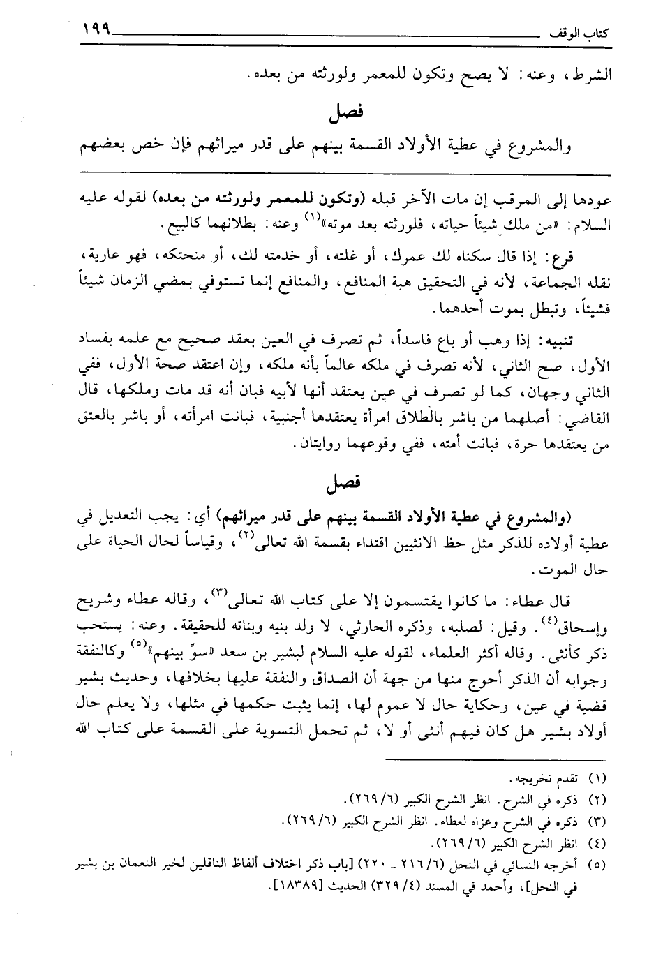 فَصْلٌ (وَالْمَشْرُوعُ فِي عَطِيَّةِ الْأَوْلَادِ الْقِسْمَةُ بَيْنَهُمْ عَلَى قَدْرِ مِيرَاثِهِمْ) أَيْ يَجِبُ التَّعْدِيلُ فِي عَطِيَّةِ أَوْلَادِهِ لِلذَّكَرِ مِثْلُ حَظِّ الْأُنْثَيَيْنِ اقْتِدَاءً بِقِسْمَةِ اللَّهِ تَعَالَى، وَقِيَاسًا لِحَالِ الْحَيَاةِ عَلَى حَالِ الْمَوْتِ، قَالَ عَطَاءٌ: مَا كَانُوا يَقْتَسِمُونَ إِلَّا عَلَى كِتَابِ اللَّهِ تَعَالَى، وَقَالَهُ عَطَاءٌ، وَشُرَيْحٌ، وَإِسْحَاقُ، وَقِيلَ: لِصُلْبِهِ، وَذَكَرَهُ الْحَارِثِيُّ، لَا وَلَدَ بَنِيهِ وَبَنَاتِهِ لِلْحَقِيقَةِ، وَعَنْهُ: يُسْتَحَبُّ ذَكَرٌ كَأُنْثَى، وَقَالَهُ أَكْثَرُ الْعُلَمَاءِ؛ لِقَوْلِهِ - عَلَيْهِ السَّلَامُ - لِبَشِيرِ بْنِ سَعْدٍ: «سَوِّ بَيْنَهُمْ» ، وَكَالنَّفَقَةِ، وَجَوَابُهُ أَنَّ الذَّكَرَ أَحْوَجُ مِنْهَا مِنْ جِهَةِ أَنَّ الصَّدَاقَ وَالنَّفَقَةَ عَلَيْهِ بِخِلَافِهَا، وَحَدِيثُ بَشِيرٍ قَضِيَّةٌ فِي عَيْنٍ، وَحِكَايَةُ حَالٍ لَا عُمُومَ لَهَا إِنَّمَا يَثْبُتُ حُكْمُهَا فِي مِثْلِهَا، وَلَا يُعْلَمُ حَالُ أَوْلَادِ بَشِيرٍ هَلْ كَانَ فِيهِمْ أُنْثَى أَوْ لَا، ثُمَّ تُحْمَلُ التَّسْوِيَةُ عَلَى الْقِسْمَةِ عَلَى كِتَابِ اللَّهِ