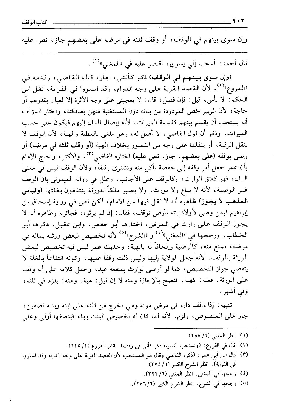 (وَإِنْ سَوَّى بَيْنَهُمْ فِي الْوَقْفِ) ذَكَرٌ كَأُنْثَى، جَازَ، قَالَهُ الْقَاضِي، وَقَدَّمَهُ فِي " الْفُرُوعِ "؛ لِأَنَّ الْقَصْدَ الْقُرْبَةُ عَلَى وَجْهِ الدَّوَامِ، وَقَدِ اسْتَوَوْا فِي الْقَرَابَةِ، نَقَلَ ابْنُ الْحَكَمِ: لَا بَأْسَ، قِيلَ: فَإِنْ فَضَّلَ، قَالَ: لَا يُعْجِبُنِي عَلَى وَجْهِ الْأَثَرَةِ إِلَّا لِعَيَّالٍ بِقَدْرِهِمْ أَوْ حَاجَةٍ؛ لِأَنَّ الزُّبَيْرَ خَصَّ الْمَرْدُودَةَ مِنْ بَنَاتِهِ دُونَ الْمُسْتَغْنِيَةِ مِنْهُنَّ بِصَدَقَتِهِ، وَاخْتَارَ الْمُؤَلَّفُ أَنَّهُ يُسْتَحَبُّ أَنْ يَقْسِمَ بَيْنَهُمْ كَقِسْمَةِ الْمِيرَاثِ؛ لِأَنَّهُ إِيصَالُ الْمَالِ إِلَيْهِمْ، فَيَكُونُ عَلَى حَسَبِ الْمِيرَاثِ، وَذَكَرَ أَنَّ قَوْلَ الْقَاضِي لَا أَصْلَ لَهُ، وَهُوَ مُلْغًى بِالْعَطِيَّةِ وَالْهِبَةِ؛ لِأَنَّ الْوَقْفَ لَا يَنْقُلُ الرَّقَبَةَ، أَوْ يَنْقُلُهَا عَلَى وَجْهٍ مِنَ الْقُصُورِ بِخِلَافِ الْهِبَةِ (أَوْ وَقَفَ ثُلُثَهُ فِي مَرَضِهِ) أَوْ وَصَّى بِوَقْفِهِ (عَلَى بَعْضِهِمْ - جَازَ، نَصَّ عَلَيْهِ) اخْتَارَهُ الْقَاضِي وَالْأَكْثَرُ، وَاحْتَجَّ الْإِمَامُ بِأَنَّ عُمَرَ جَعَلَ أَمْرَ وَقْفِهِ إِلَى حَفْصَةَ تَأْكُلُ مِنْهُ وَتَشْتَرِي رَقِيقًا، وَلِأَنَّ الْوَقْفَ لَيْسَ فِي مَعْنَى الْمَالِ فَهُوَ كَعِتْقِ الْوَارِثِ وَكَالْوَقْفِ عَلَى الْأَجَانِبِ، وَعَلَّلَ فِي رِوَايَةِ الْمَيْمُونِيِّ بِأَنَّ الْوَقْفَ غَيْرُ الْوَصِيَّةِ؛ لِأَنَّهُ لَا يُبَاعُ، وَلَا يُورَثُ، وَلَا يَصِيرُ مِلْكًا لِلْوَرَثَةِ يَنْتَفِعُونَ بِغَلَّتِهَا (وَقِيَاسُ الْمَذْهَبِ: لَا يَجُوزُ) ، ظَاهِرُهُ أَنَّهُ لَا نَقْلَ فِيهَا عَنِ الْإِمَامِ، لَكِنْ نَصَّ فِي رِوَايَةِ إِسْحَاقَ بْنِ إِبْرَاهِيمَ فِيمَنْ وَصَّى لِأَوْلَادِ بِنْتِهِ بِأَرْضٍ تُوقَفُ، فَقَالَ: إِنْ لَمْ يَرِثُوهُ فَجَائِزٌ، وَظَاهِرُهُ أَنَّهُ لَا يَجُوزُ الْوَقْفُ عَلَى وَارِثٍ فِي الْمَرَضِ، اخْتَارَهَا أَبُو حَفْصٍ وَابْنُ عَقِيلٍ، ذَكَرَهَا أَبُو الْخَطَّابِ، وَرَجَّحَهَا فِي " الْمُغْنِي " وَ " الشَّرْحِ "؛ لِأَنَّهُ تَخْصِيصٌ لِبَعْضِ وَرَثَتِهِ بِمَالِهِ فِي مَرَضِهِ، فَمَنَعَ مِنْهُ كَالْوَصِيَّةِ، وَإِلْحَاقًا لَهُ بِالْهِبَةِ، وَحَدِيثُ عُمَرَ لَيْسَ فِيهِ تَخْصِيصٌ لِبَعْضِ الْوَرَثَةِ بِالْوَقْفِ؛ لِأَنَّهُ جَعَلَ الْوِلَايَةَ إِلَيْهَا، وَلَيْسَ ذَلِكَ وَقْفًا عَلَيْهَا، وَكَوْنُهُ انْتِفَاعًا بِالْغَلَّةِ لَا يَقْتَضِي جَوَازَ التَّخْصِيصِ، كَمَا لَوْ أَوْصَى لِوَارِثٍ بِمَنْفَعَةِ عَبْدٍ، وَحَمَلَ كَلَامَهُ عَلَى أَنَّهُ وَقَفَ عَلَى الْوَرَثَةِ، فَعَنْهُ: كَهِبَةٍ، فَتَصِحُّ بِالْإِجَازَةِ، وَعَنْهُ: لَا إِنْ قِيلَ هِبَةٌ، وَعَنْهُ: يَلْزَمُ فِي ثُلُثِهِ، وَهِيَ أَشْهَرُ.