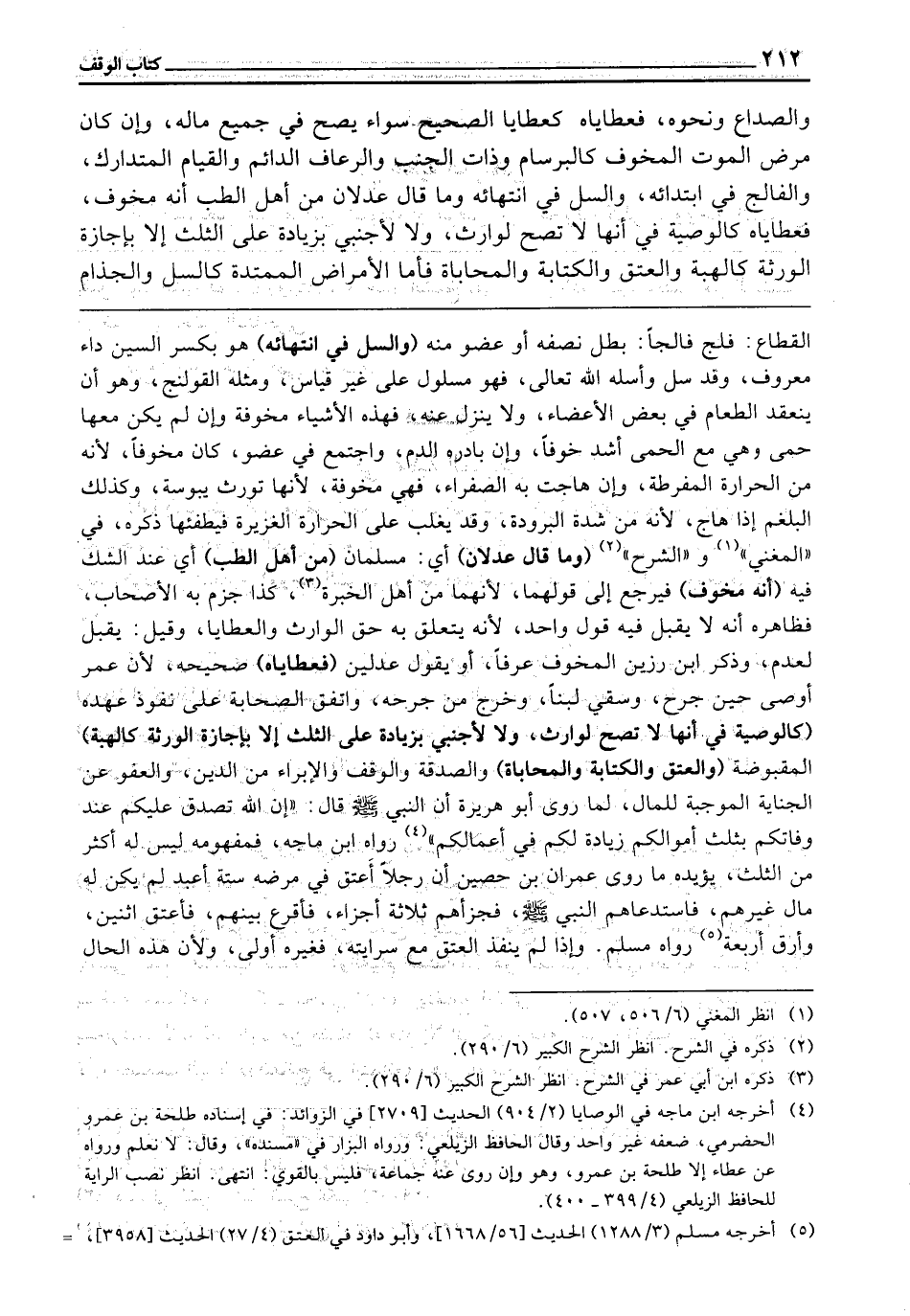 ـــــــــــــــــــــــــــــQالْقَطَّاعِ: فَلَجَ فَالِجًا بَطَلَ نِصْفُهُ أَوْ عُضْوٌ مِنْهُ، (وَالسِّلُّ فِي انْتِهَائِهِ) ، هُوَ - بِكَسْرِ السِّينِ - دَاءٌ مَعْرُوفٌ، وَقَدْ سَلَّ وَأَسَلَّهُ اللَّهُ تَعَالَى فَهُوَ مَسْلُولٌ عَلَى غَيْرِ قِيَاسٍ، وَمِثْلُهُ الْقُولَنْجُ، وَهُوَ أَنْ يَنْعَقِدَ الطَّعَامُ فِي بَعْضِ الْأَعْضَاءِ وَلَا يَنْزِلَ عَنْهُ، فَهَذِهِ الْأَشْيَاءُ مَخُوفَةٌ، وَإِنْ لَمْ يَكُنْ مَعَهَا حُمَّى، وَهِيَ مَعَ الْحُمَّى أَشَدُّ خَوْفًا، وَإِنْ بَادَرَهُ الدَّمُ وَاجْتَمَعَ فِي عُضْوٍ كَانَ مَخُوفًا؛ لِأَنَّهُ مِنَ الْحَرَارَةِ الْمُفْرِطَةِ، وَإِنْ هَاجَتْ بِهِ الصَّفْرَاءُ فَهِيَ مَخُوفَةٌ؛ لِأَنَّهَا تُورِثُ يُبُوسَةً، وَكَذَلِكَ الْبَلْغَمُ إِذَا هَاجَ؛ لِأَنَّهُ مِنْ شِدَّةِ الْبُرُودَةِ، وَقَدْ يَغْلِبُ عَلَى الْحَرَارَةِ الْغَزِيرَةِ فَيُطْفِئُهَا، ذَكَرَهُ فِي " الْمُغْنِي " وَ " الشَّرْحِ " (وَمَا قَالَ عَدْلَانِ) - أَيْ مُسْلِمَانِ - (مِنْ أَهْلِ الطِّبِّ) أَيْ عِنْدِ الشَّكِّ فِيهِ (أَنَّهُ مَخُوفٌ) فَيُرْجَعُ إِلَى قَوْلِهِمَا؛ لِأَنَّهُمَا مِنْ أَهْلِ الْخِبْرَةِ، كَذَا جَزَمَ بِهِ الْأَصْحَابُ، فَظَاهِرُهُ أَنَّهُ لَا يُقْبَلُ فِيهِ قَوْلُ وَاحِدٍ؛ لِأَنَّهُ يَتَعَلَّقُ بِهِ حَقُّ الْوَارِثِ وَالْعَطَايَا، وَقِيلَ: يُقْبَلُ لِعَدَمٍ، وَذَكَرَ ابْنُ رَزِينٍ الْمَخُوفَ عُرْفًا، أَوْ يَقُولُ عَدْلَيْنِ (فَعَطَايَاهُ) صَحِيحَةٌ؛ لِأَنَّ عُمَرَ أَوْصَى حِينَ جُرِحَ وَسُقِيَ لَبَنًا وَخَرَجَ مِنْ جُرْحِهِ، وَاتَّفَقَ الصَّحَابَةُ عَلَى نُفُوذِ عَهْدِهِ (كَالْوَصِيَّةِ فِي أَنَّهَا لَا تَصِحُّ لِوَارِثٍ وَلَا لِأَجْنَبِيٍّ بِزِيَادَةٍ عَلَى الثُّلُثِ إِلَّا بِإِجَازَةِ الْوَرَثَةِ كَالْهِبَةِ) الْمَقْبُوضَةِ (وَالْعِتْقِ، وَالْكِتَابَةِ، وَالْمُحَابَاةِ) ، وَالصَّدَقَةِ، وَالْوَقْفِ، وَالْإِبْرَاءِ مِنَ الدَّيْنِ، وَالْعَفْوِ عَنِ الْجِنَايَةِ الْمُوجِبَةِ لِلْمَالِ؛ لِمَا رَوَى أَبُو هُرَيْرَةَ أَنَّ النَّبِيَّ - صَلَّى اللَّهُ عَلَيْهِ وَسَلَّمَ - قَالَ: «إِنَّ اللَّهَ تَصَدَّقَ عَلَيْكُمْ عِنْدَ وَفَاتِكُمْ بِثُلُثِ أَمْوَالِكُمْ زِيَادَةً لَكُمْ فِي أَعْمَالِكُمْ» ، رَوَاهُ ابْنُ مَاجَهْ، فَمَفْهُومُهُ لَيْسَ لَهُ أَكْثَرُ مِنَ الثُّلُثِ، يُؤَيِّدُهُ مَا رَوَى عِمْرَانُ بْنُ حُصَيْنٍ «أَنَّ رَجُلًا أَعْتَقَ فِي مَرَضِهِ سِتَّةَ أَعْبُدٍ لَمْ يَكُنْ لَهُ مَالٌ غَيْرُهُمْ فَاسْتَدْعَاهُمُ النَّبِيُّ - صَلَّى اللَّهُ عَلَيْهِ وَسَلَّمَ - فَجَزَّأَهُمْ ثَلَاثَةَ أَجْزَاءٍ، فَأَقْرَعَ بَيْنَهُمْ، فَأَعْتَقَ اثْنَيْنِ وَأَرَقَّ أَرْبَعَةً» رَوَاهُ مُسْلِمٌ، وَإِذَا لَمْ يُنَفَّذِ الْعِتْقُ مَعَ سَرَايَتِهِ فَغَيْرُهُ أَوْلَى، وَلِأَنَّ هَذِهِ الْحَالَ