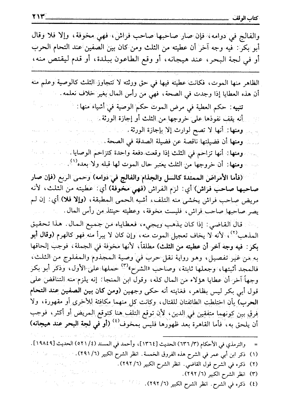 قَالَ الْقَاضِي: إِذَا كَانَ يَذْهَبُ وَيَجِيءُ فَعَطَايَاهُ مِنْ جَمِيعِ الْمَالِ، هَذَا تَحْقِيقُ الْمَذْهَبِ؛ لِأَنَّهُ لَا يُخَافُ تَعْجِيلُ الْمَوْتِ مِنْهُ، وَإِنْ كَانَ لَا يَبْرَأُ مِنْهُ فَهُوَ كَالْهَرِمِ (وَقَالَ أَبُو بَكْرٍ: فِيهِ وَجْهٌ آخَرُ أَنَّ عَطِيَّتَهُ مِنَ الثُّلُثِ) مُطْلَقًا؛ لِأَنَّهَا مَخُوفَةٌ فِي الْجُمْلَةِ، فَوَجَبَ إِلْحَاقُهَا بِهِ مِنْ غَيْرِ تَفْصِيلٍ، وَهُوَ رِوَايَةٌ نَقَلَ حَرْبٌ فِي وَصِيَّةِ الْمَجْذُومِ وَالْمَفْلُوجِ مِنَ الثُّلُثِ، فَالْمَجْدُ أَثْبَتَهَا وَجَعَلَهَا ثَابِتَةً، وَصَاحِبُ " الشَّرْحِ " حَمَلَهَا عَلَى الْأَوَّلِ، وَذَكَرَ أَبُو بَكْرٍ وَجْهًا آخَرَ: أَنَّ عَطَايَا هَؤُلَاءِ مِنَ الْمَالِ كُلِّهِ، وَقَوْلُ ابْنِ الْمُنَجَّا: إِنَّهُ يَلْزَمُ مِنْهُ التَّنَاقُضُ عَلَى قَوْلِ أَبِي بَكْرٍ لَيْسَ بِظَاهِرٍ، فَغَايَتُهُ أَنَّهُ حَكَى وَجْهَيْنِ (وَمَنْ كَانَ بَيْنَ الصَّفَّيْنِ عِنْدَ الْتِحَامِ الْحَرْبِ) بِأَنِ اخْتَلَطَتِ الطَّائِفَتَانِ لِلْقِتَالِ، وَكَانَتْ كُلٌّ مِنْهُمَا مُكَافِئَةً لِلْأُخْرَى أَوْ مَقْهُورَةً، وَلَا فَرْقَ بَيْنَ كَوْنِهِمَا مُتَّفِقَيْنِ فِي الدِّينِ؛ لِأَنَّ تَوَقُّعَ التَّلَفِ هُنَا كَتَوَقُّعِ الْمَرِيضِ أَوْ أَكْثَرَ، فَوَجَبَ أَنْ يُلْحَقَ بِهِ، فَأَمَّا الْقَاهِرَةُ بَعْدَ ظُهُورِهَا فَلَيْسَ بِمَخُوفٍ. (أَوْ فِي لُجَّةِ الْبَحْرِ عِنْدَ هَيَجَانِهِ)