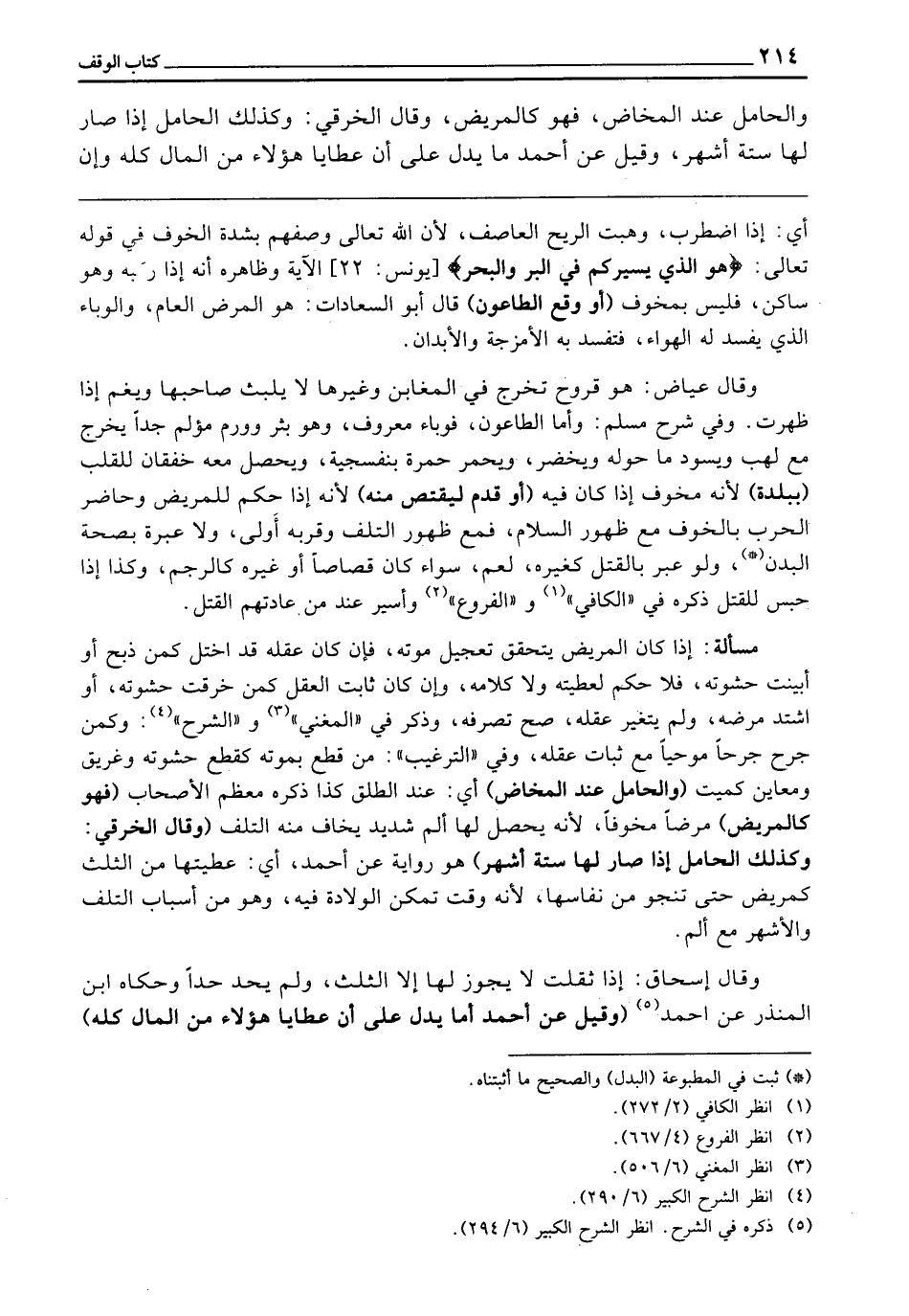 مَسْأَلَةٌ: إِذَا كَانَ الْمَرِيضُ يَتَحَقَّقُ تَعْجِيلَ مَوْتِهِ، فَإِنْ كَانَ عَقْلُهُ قَدِ اخْتَلَّ كَمَنْ ذُبِحَ أَوْ أُبِينَتْ حِشْوَتُهُ فَلَا حُكْمَ لِعَطِيَّتِهِ وَلَا كَلَامِهِ، وَإِنْ كَانَ ثَابِتَ الْعَقْلِ كَمَنْ خُرِقَتْ حِشْوَتُهُ أَوِ اشْتَدَّ مَرَضُهُ وَلَمْ يَتَغَيَّرْ عقله صَحَّ تَصَرُّفُهُ، وَذَكَرَ فِي " الْمُغْنِي " وَ " الشَّرْحِ ": وَكَمَنَ جُرِحَ جُرْحًا مُوحِيًا مَعَ ثَبَاتِ عَقْلِهِ، وَفِي " التَّرْغِيبِ ": مَنْ قُطِعَ بِمَوْتِهِ كَقَطْعِ حِشْوَتِهِ، وَغَرِيقٍ، وَمُعَايَنٍ كَمَيِّتٍ (وَالْحَامِلُ عِنْدَ الْمَخَاضِ) أَيْ عِنْدِ الطَّلْقِ، كَذَا ذَكَرَهُ مُعْظَمُ الْأَصْحَابِ، (فَهُوَ كَالْمَرِيضِ) مَرَضًا مَخُوفًا؛ لِأَنَّهُ يَحْصُلُ لَهَا أَلَمٌ شَدِيدٌ يَخَافُ مِنْهُ التَّلَفَ (وَقَالَ الْخِرَقِيُّ: وَكَذَلِكَ الْحَامِلُ إِذَا صَارَ لَهَا سِتَّةُ أَشْهُرٍ) ، هُوَ رِوَايَةٌ عَنْ أَحْمَدَ، أَيْ عَطِيَّتُهَا مِنَ الثُّلُثِ كَمَرِيضٍ حَتَّى تَنْجُوَ مِنْ نِفَاسِهَا؛ لِأَنَّهُ وَقْتٌ تُمْكِنُ الْوِلَادَةُ فِيهِ، وَهُوَ مِنْ أَسْبَابِ التَّلَفِ، وَالْأَشْهَرُ مَعَ أَلَمٍ.