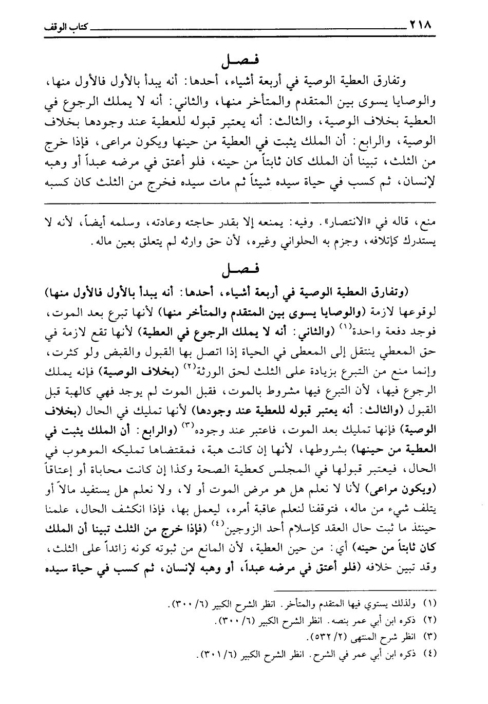 فَصْلٌ وَتُفَارِقُ الْعَطِيَّةُ الْوَصِيَّةَ فِي أَرْبَعَةِ أَشْيَاءَ، أَحَدُهَا: أَنَّهُ يَبْدَأُ بِالْأَوَّلِ فَالْأَوَّلِ مِنْهَا، وَالْوَصَايَا يُسَوَّى بَيْنَ الْمُتَقَدِّمِ وَالْمُتَأَخِّرِ مِنْهَا، وَالثَّانِي: أَنَّهُ لَا يَمْلِكُ الرُّجُوعَ فِي الْعَطِيَّةِ بِخِلَافِ الْوَصِيَّةِ، وَالثَّالِثِ: أَنَّهُ يُعْتَبَرُ قَبُولُهُ لِلْعَطِيَّةِ عِنْدَ وُجُودِهَا بِخِلَافِ الْوَصِيَّةِ، وَالرَّابِعِ: أَنَّ الْمِلْكَ يَثْبُتُ فِي الْعَطِيَّةِ مِنْ حِينِهَا وَيَكُونُ مُرَاعًى، فَإِذَا خَرَجَ مِنَ الثُّلُثِ تَبَيَّنَّا أَنَّ الْمِلْكَ كَانَ ثَابِتًا مِنْ حِينِهِ، فَلَوْ أَعْتَقَ فِي مَرَضِهِ عَبْدًا أَوْ وَهَبَهُ لِإِنْسَانٍ ثُمَّ كَسَبَ فِي حَيَاةِ سَيِّدِهِ شَيْئًا ثُمَّ مَاتَ سَيِّدُهُ فَخَرَجَ مِنَ الثُّلُثِ كَانَ كَسْبُهُ