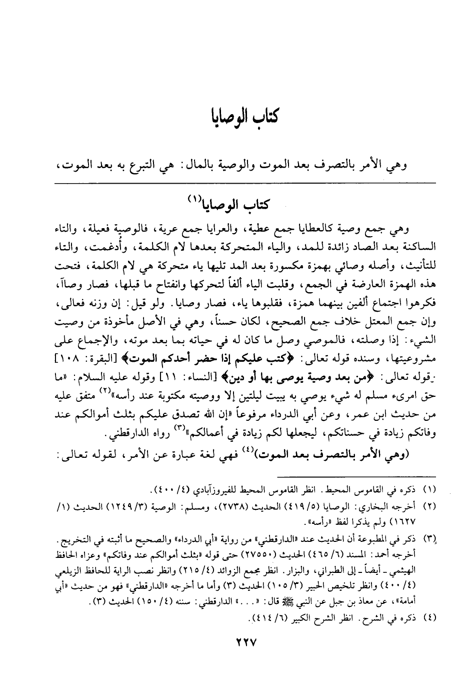 وَهِيَ جَمْعُ وَصِيَّةٍ كَالْعَطَايَا جَمْعِ عَطِيَّةٍ، وَالْعَرَايَا جَمْعِ عَرِيَّةٍ، فَالْوَصِيَّةُ فَعِيلَةٌ، وَالْيَاءُ السَّاكِنَةُ بَعْدَ الصَّادِ زَائِدَةٌ لِلْمَدِّ، وَالْيَاءُ الْمُتَحَرِّكَةُ بَعْدَهَا لَامُ الْكَلِمَةِ، وَأُدْغِمَتْ، وَالتَّاءُ لِلتَّأْنِيثِ، وَأَصْلُهُ وَصَائِي بِهَمْزَةٍ مَكْسُورَةٍ بَعْدَ الْمَدِّ، تَلِيهَا يَاءٌ مُتَحَرِّكَةٌ هِيَ لَامُ الْكَلِمَةِ، فُتِحَتْ هَذِهِ الْهَمْزَةُ الْعَارِضَةُ فِي الْجَمْعِ، وَقُلِبَتِ الْيَاءُ أَلِفًا لِتَحَرُّكِهَا وَانْفِتَاحِ مَا قَبْلَهَا، فَصَارَ وَصَاءَا، فَكَرِهُوا اجْتِمَاعَ أَلِفَيْنِ بَيْنَهُمَا هَمْزَةٌ، فَقَلَبُوهَا يَاءً، فَصَارَ وَصَايَا، وَلَوْ قِيلَ: إِنَّ وَزْنَهُ فَعَالَى، وَإِنَّ جَمْعَ الْمُعْتَلِّ خِلَافُ جَمْعِ الصَّحِيحِ، لَكَانَ حَسَنًا، وَهِيَ فِي الْأَصْلِ مَأْخُوذَةٌ مِنْ وَصَيْتُ الشَّيْءَ: إِذَا وَصَلْتُهُ، فَالْمُوصِي وَصَلَ مَا كَانَ لَهُ فِي حَيَاتِهِ بِمَا بَعْدَ مَوْتِهِ، وَالْإِجْمَاعُ عَلَى مَشْرُوعِيَّتِهَا، وَسَنَدُهُ قَوْله تَعَالَى: {كُتِبَ عَلَيْكُمْ إِذَا حَضَرَ أَحَدَكُمُ الْمَوْتُ} [البقرة: 180] ، وقَوْله تَعَالَى: {مِنْ بَعْدِ وَصِيَّةٍ يُوصَى بِهَا أَوْ دَيْنٍ} [النساء: 12] ؛ وَقَوْلُهُ - عَلَيْهِ السَّلَامُ -: «مَا حَقُّ امْرِئٍ مُسْلِمٍ لَهُ شَيْءٌ يُوصِي بِهِ يَبِيتُ لَيْلَتَيْنِ، إِلَّا وَوَصِيَّتُهُ مَكْتُوبَةٌ عِنْدَ رَأْسِهِ» مُتَّفَقٌ عَلَيْهِ مِنْ حَدِيثِ ابْنِ عُمَرَ، وَعَنْ أَبِي الدَّرْدَاءِ مَرْفُوعًا «إِنَّ اللَّهَ تَصَدَّقَ عَلَيْكُمْ بِثُلُثِ أَمْوَالِكُمْ عِنْدَ وَفَاتِكُمْ زِيَادَةً فِي حَسَنَاتِكُمْ، لِيَجْعَلَهَا لَكُمْ زِيَادَةً فِي أَعْمَالِكُمْ» رَوَاهُ الدَّارَقُطْنِيُّ.