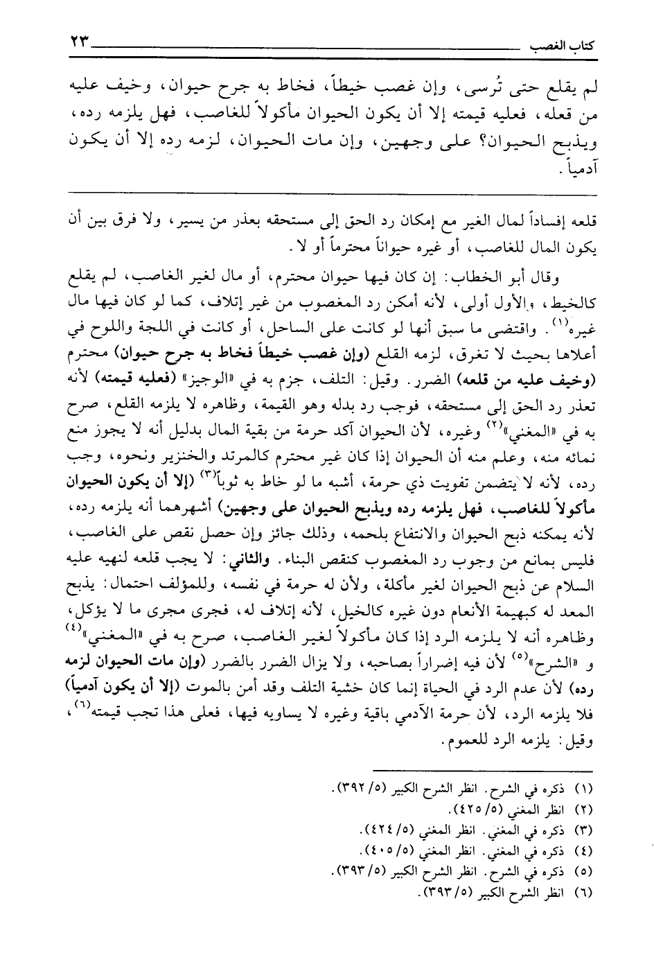 ـــــــــــــــــــــــــــــQقَلْعِهِ إِفْسَادًا لِمَالِ الْغَيْرِ مَعَ إِمْكَانِ رَدِّ الْحَقِّ إِلَى مُسْتَحِقِّهِ بِعُذْرٍ مِنْ يَسِيرٍ، وَلَا فَرْقَ بَيْنَ أَنْ يَكُونَ الْمَالُ لِلْغَاصِبِ أَوْ غَيْرِهِ حَيَوَانًا مُحْتَرَمًا أَوْ لَا. وَقَالَ أَبُو الْخَطَّابِ: إِنْ كَانَ فِيهَا حَيَوَانٌ مُحْتَرَمٌ، أَوْ مَالٌ لِغَيْرِ الْغَاصِبِ لَمْ يُقْلَعْ كَالْخَيْطِ، وَالْأَوَّلُ أَوْلَى؛ لِأَنَّهُ أَمْكَنَ رَدُّ الْمَغْصُوبِ مِنْ غَيْرِ إِتْلَافٍ، كَمَا لَوْ كَانَ فِيهَا مَالُ غَيْرِهِ، وَاقْتَضَى مَا سَبَقَ أَنَّهَا لَوْ كَانَتْ عَلَى السَّاحِلِ، أَوْ كَانَتْ فِي اللُّجَّةِ وَاللَّوْحُ فِي أَعْلَاهَا بِحَيْثُ لَا تَغْرَقُ لَزِمَهُ الْقَلْعُ (وَإِنْ غَصَبَ خَيْطًا فَخَاطَ بِهِ جُرْحَ حَيَوَانٍ) مُحْتَرَمٍ (وَخِيفَ عَلَيْهِ مِنْ قَلْعِهِ) الضَّرَرُ، وَقِيلَ: التَّلَفُ، جُزِمَ بِهِ فِي " الْوَجِيزِ " (فَعَلَيْهِ قِيمَتُهُ) لِأَنَّهُ تَعَذَّرَ رَدُّ الْحَقِّ إِلَى مُسْتَحِقِّهِ، فَوَجَبَ رَدُّ بَدَلِهِ وَهُوَ الْقِيمَةُ، وَظَاهِرُهُ لَا يَلْزَمُهُ الْقَلْعُ صَرَّحَ بِهِ فِي " الْمُغْنِي " وَغَيْرِهِ؛ لِأَنَّ الْحَيَوَانَ آكَدُ حُرْمَةً مِنْ بَقِيَّةِ الْمَالِ بِدَلِيلِ أَنَّهُ لَا يَجُوزُ مَنْعُ نَمَائِهِ مِنْهُ، وَعُلِمَ مِنْهُ أَنَّ الْحَيَوَانَ إِذَا كَانَ غَيْرَ مُحْتَرَمٍ كَالْمُرْتَدِّ، وَالْخِنْزِيرِ وَنَحْوِهِ وَجَبَ رَدُّهُ؛ لِأَنَّهُ لَا يَتَضَمَّنُ تَفْوِيتَ ذِي حُرْمَةٍ أَشْبَهَ مَا لَوْ خَاطَ بِهِ ثَوْبًا (إِلَّا أَنْ يَكُونَ الْحَيَوَانُ مَأْكُولًا لِلْغَاصِبِ، فَهَلْ يَلْزَمُهُ رَدُّهُ، وَيُذْبَحُ الْحَيَوَانُ عَلَى وَجْهَيْنِ) أَشْهُرُهُمَا أَنَّهُ يَلْزَمُهُ رَدُّهُ؛ لِأَنَّهُ يُمْكِنُهُ ذَبْحُ الْحَيَوَانِ، وَالِانْتِفَاعُ بِلَحْمِهِ، وَذَلِكَ جَائِزٌ، وَإِنْ حَصَلَ نَقْصٌ عَلَى الْغَاصِبِ، فَلَيْسَ بِمَانِعٍ مِنْ وُجُوبِ رَدِّ الْمَغْصُوبِ كَنَقْصِ الْبِنَاءِ. وَالثَّانِي: لَا يَجِبُ قَلْعُهُ لِنَهْيِهِ - عَلَيْهِ السَّلَامُ - عَنْ ذَبْحِ الْحَيَوَانِ لِغَيْرِ مَأْكَلَةٍ، وَلِأَنَّ لَهُ حُرْمَةً فِي نَفْسِهِ، وَلِلْمُؤَلِّفِ احْتِمَالٌ: يُذْبَحُ الْمُعَدُّ لَهُ كَبَهِيمَةِ الْأَنْعَامِ دُونَ غَيْرِهِ كَالْخَيْلِ؛ لِأَنَّهُ إِتْلَافٌ لَهُ فَجَرَى مَجْرَى مَا لَا يُؤْكَلُ، وَظَاهِرُهُ أَنَّهُ لَا يَلْزَمُهُ الرَّدُّ إِذَا كَانَ مَأْكُولًا لِغَيْرِ الْغَاصِبِ، صُرِّحَ بِهِ فِي " الْمُغْنِي "، وَ " الشَّرْحِ "؛ لِأَنَّ فِيهِ إِضْرَارًا بِصَاحِبِهِ، وَلَا يُزَالُ الضَّرَرُ بِالضَّرَرِ (وَإِنْ مَاتَ الْحَيَوَانُ لَزِمَهُ رَدُّهُ) لِأَنَّ عَدَمَ الرَّدِّ فِي الْحَيَاةِ إِنَّمَا كَانَ خَشْيَةَ التَّلَفِ، وَقَدْ أُمِنَ بِالْمَوْتِ (إِلَّا أَنْ يَكُونَ آدَمِيًّا) فَلَا يَلْزَمُهُ الرَّدُّ؛ لِأَنَّ حُرْمَةَ الْآدَمِيِّ بَاقِيَةٌ، وَغَيْرُهُ لَا يُسَاوِيهِ فِيهَا، فَعَلَى هَذَا تَجِبُ قِيمَتُهُ، وَقِيلَ: يَلْزَمُهُ الرَّدُّ لِلْعُمُومِ.