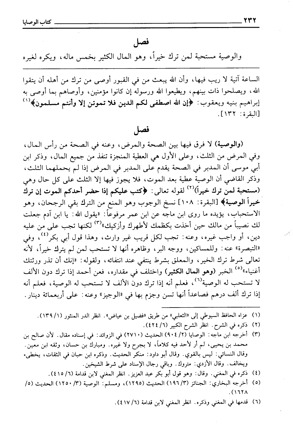 فَصْلٌ (وَالْوَصِيَّةُ) لَا فَرْقَ فِيهَا بَيْنَ الصِّحَّةِ وَالْمَرَضِ، وَعَنْهُ فِي الصِّحَّةِ مِنْ رَأْسِ الْمَالِ، وَفِي الْمَرَضِ مِنَ الثُّلُثِ، وَعَلَى الْأَوَّلِ هِيَ الْعَطِيَّةُ الْمُنْجَزَةُ، تَنْفُذُ مِنْ جَمِيعِ الْمَالِ، وَذَكَرَ ابْنُ أَبِي مُوسَى أَنَّ الْمُدَبَّرَ فِي الصِّحَّةِ يُقَدَّمُ عَلَى الْمُدَبَّرِ فِي الْمَرَضِ إِذَا لَمْ يَحْمِلْهُمَا الثُّلُثُ، وَذَكَرَ الْقَاضِي أَنَّ الْوَصِيَّةَ عَطِيَّةٌ بَعْدَ الْمَوْتِ، فَلَا يَجُوزُ فِيهَا إِلَّا الثُّلُثُ عَلَى كُلِّ حَالٍ، وَهِيَ (مُسْتَحَبَّةٌ لِمَنْ تَرَكَ خَيْرًا) لِقَوْلِهِ تَعَالَى: {كُتِبَ عَلَيْكُمْ إِذَا حَضَرَ أَحَدَكُمُ الْمَوْتُ إِنْ تَرَكَ خَيْرًا الْوَصِيَّةُ} [البقرة: 180] نُسِخَ الْوُجُوبُ، وَهُوَ الْمَنْعُ مِنَ التَّرْكِ بَقِيَ الرُّجْحَانُ، وَهُوَ الِاسْتِحْبَابُ، يُؤَيِّدُهُ مَا رَوَى ابْنُ مَاجَهْ، عَنِ ابْنِ عُمَرَ مَرْفُوعًا: «يَقُولُ اللَّهُ: يَا ابْنَ آدَمَ جَعَلْتُ لَكَ نَصِيبًا مِنْ مَالِكَ حِينَ أَخَذْتُ بِكَظْمِكَ لِأُطَهِّرَكَ وَأُزَكِّيَكَ» لَكِنَّهَا تَجِبُ عَلَى مَنْ عَلَيْهِ دَيْنٌ، أَوْ وَاجِبٌ غَيْرُهُ، وَعَنْهُ تَجِبُ لِكُلِّ قَرِيبٍ غَيْرِ وَارِثٍ، وَهَذَا قَوْلُ أَبِي بَكْرٍ، وَفِي التَّبْصِرَةِ عَنْهُ: وَلِلْمَسَاكِينِ، وَوَجْهِ الْبِرِّ، وَظَاهِرُهُ أَنَّهَا لَا تُسْتَحَبُّ لِمَنْ لَمْ يَتْرُكْ خَيْرًا؛ لِأَنَّهُ تَعَالَى شَرَطَ تَرْكَ الْخَيْرِ، وَالْمُعَلَّقُ بِشَرْطٍ يَنْتَفِي عِنْدَ انْتِفَائِهِ، وَلِقَوْلِهِ: «إِنَّكَ أَنْ تَذَرَ وَرَثَتَكَ أَغْنِيَاءَ» . الْخَبَرَ (وَهُوَ الْمَالُ الْكَثِيرُ) وَاخْتُلِفَ فِي مِقْدَارِهِ، فَعَنْ أَحْمَدَ: إِذَا تَرَكَ دُونَ الْأَلْفِ لَا تُسْتَحَبُّ لَهُ الْوَصِيَّةُ، فَعُلِمَ أَنَّهُ إِذَا تَرَكَ دُونَ الْأَلْفِ لَا تُسْتَحَبُّ لَهُ الْوَصِيَّةُ، فَعُلِمَ أَنَّهُ إِذَا تَرَكَ أَلْفَ دِرْهَمٍ فَصَاعِدًا أَنَّهَا تُسَنُّ، وَجَزَمَ بِهَا فِي الْوَجِيزِ، وَعَنْهُ: عَلَى أَرْبَعِمِائَةِ دِينَارٍ،