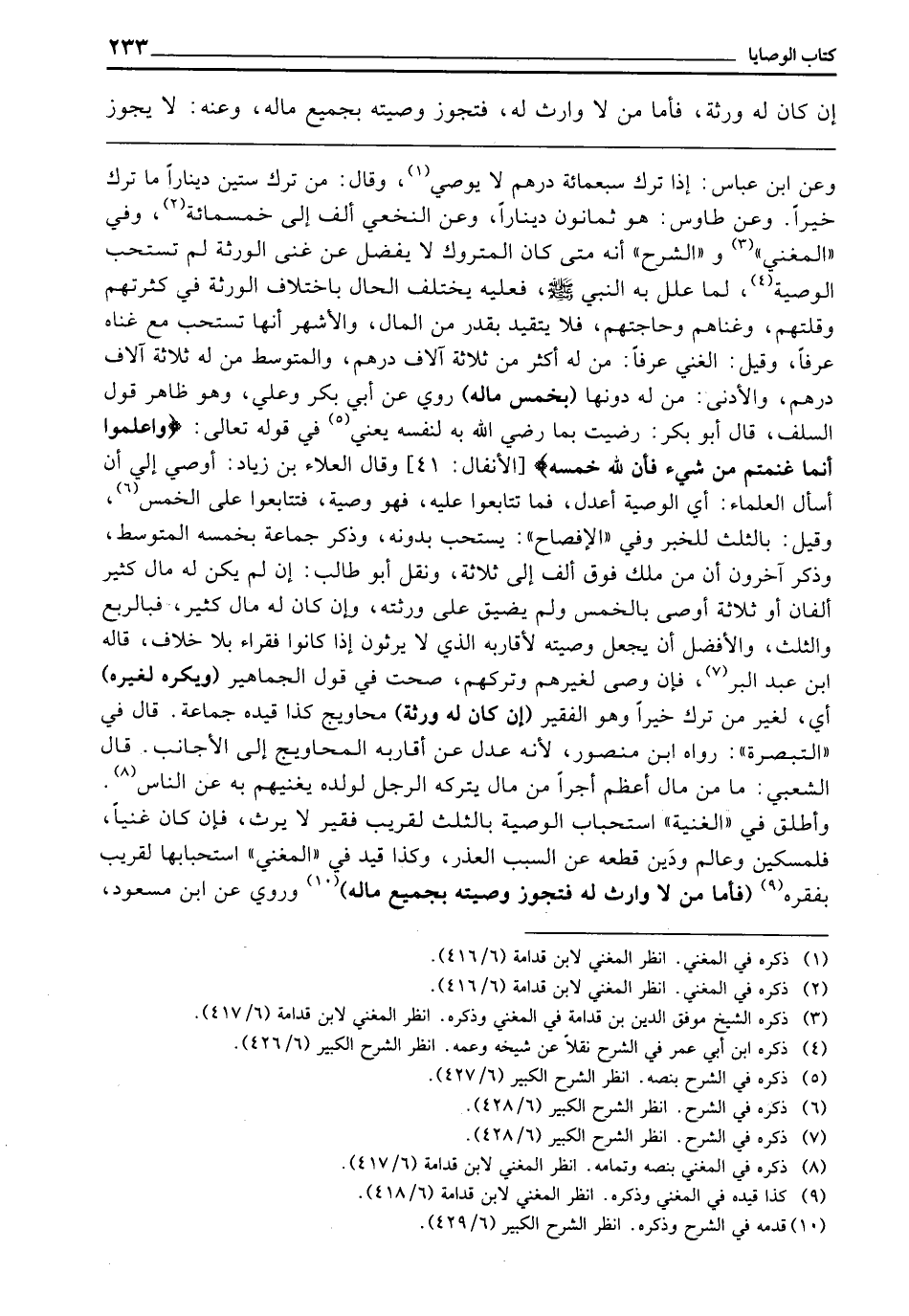 ـــــــــــــــــــــــــــــQوَعَنِ ابْنِ عَبَّاسٍ: إِذَا تَرَكَ سَبْعَمِائَةِ دِرْهَمٍ لَا يُوصِي، وَقَالَ: مَنْ تَرَكَ سِتِّينَ دِينَارًا مَا تَرَكَ خَيْرًا، وَعَنْ طَاوُسٍ: هُوَ ثَمَانُونَ دِينَارًا، وَعَنِ النَّخَعِيِّ: أَلْفٌ إِلَى خَمْسِمِائَةٍ، وَفِي الْمُغْنِي، وَالشَّرْحِ: أَنَّهُ مَتَى كَانَ الْمَتْرُوكُ لَا يَفْضُلُ عَنْ غِنَى الْوَرَثَةِ لَمْ تُسْتَحَبَّ الْوَصِيَّةُ، لِمَا عَلَّلَ بِهِ النَّبِيُّ - صَلَّى اللَّهُ عَلَيْهِ وَسَلَّمَ -، فَعَلَيْهِ يَخْتَلِفُ الْحَالُ بِاخْتِلَافِ الْوَرَثَةِ فِي كَثْرَتِهِمْ وَقِلَّتِهِمْ وَغِنَاهُمْ وَحَاجَتِهِمْ، فَلَا يُتَقَيَّدُ بِقَدْرٍ مِنَ الْمَالِ، وَالْأَشْهَرُ أَنَّهَا تُسْتَحَبُّ مَعَ غِنَاهُ عُرْفًا، وَقِيلَ: الْغَنِيُّ عُرْفًا: مَنْ لَهُ أَكْثَرُ مِنْ ثَلَاثَةِ آلَافِ دِرْهَمٍ، وَالْمُتَوَسِّطُ مَنْ لَهُ ثَلَاثَةُ آلَافِ دِرْهَمٍ، وَالْأَدْنَى مَنْ لَهُ دُونَهَا (بِخُمْسِ مَالِهِ) رُوِيَ عَنْ أَبِي بَكْرٍ وَعَلِيٍّ، وَهُوَ ظَاهِرُ قَوْلِ السَّلَفِ، قَالَ أَبُو بَكْرٍ: رَضِيتُ بِمَا رَضِيَ اللَّهُ بِهِ لِنَفْسِهِ يَعْنِي فِي قَوْله تَعَالَى: {وَاعْلَمُوا أَنَّمَا غَنِمْتُمْ مِنْ شَيْءٍ فَأَنَّ لِلَّهِ خُمُسَهُ} [الأنفال: 41] ؛ وَقَالَ الْعَلَاءُ بْنُ زِيَادٍ: أُوصِي إِلَى أَنْ أَسْأَلَ الْعُلَمَاءَ: أَيُّ الْوَصِيَّةِ أَعْدَلُ، فَمَا تَتَابَعُوا عَلَيْهِ، فَهُوَ وَصِيَّةٌ فَتَتَابَعُوا عَلَى الْخُمْسِ، وَقِيلَ: بِالثُّلُثِ لِلْخَبَرِ، وَفِي الْإِفْصَاحِ: يُسْتَحَبُّ بِدُونِهِ، وَذَكَرَ جَمَاعَةٌ بِخُمْسِهِ الْمُتَوَسِّطَ، وَذَكَرَ آخَرُونَ أَنَّ مَنْ مَلَكَ فَوْقَ أَلْفٍ إِلَى ثَلَاثَةٍ، وَنَقَلَ أَبُو طَالِبٍ: إِنْ لَمْ يَكُنْ لَهُ مَالٌ كَثِيرٌ أَلْفَانِ أَوْ ثَلَاثَةٌ أَوْصَى بِالْخُمْسِ، وَلَمْ يُضَيِّقْ عَلَى وَرَثَتِهِ، وَإِنْ كَانَ لَهُ مَالٌ كَثِيرٌ فَبِالرُّبُعِ وَالثُّلُثِ، وَالْأَفْضَلُ أَنْ يَجْعَلَ وَصِيَّتَهُ لِأَقَارِبِهِ الَّذِينَ لَا يَرِثُونَ إِذَا كَانُوا فُقَرَاءَ بِلَا خِلَافٍ، قَالَهُ ابْنُ عَبْدِ الْبَرِّ، فَإِنْ وَصَّى لِغَيْرِهِمْ وَتَرَكَهُمْ، صَحَّتْ فِي قَوْلِ الْجَمَاهِيرِ (وَيُكْرَهُ لِغَيْرِهِ) أَيْ لِغَيْرِ مَنْ تَرَكَ خَيْرًا، وَهُوَ الْفَقِيرُ (إِنْ كَانَ لَهُ وَرَثَةٌ) مَحَاوِيجُ، كَذَا قَيَّدَهُ جَمَاعَةٌ.