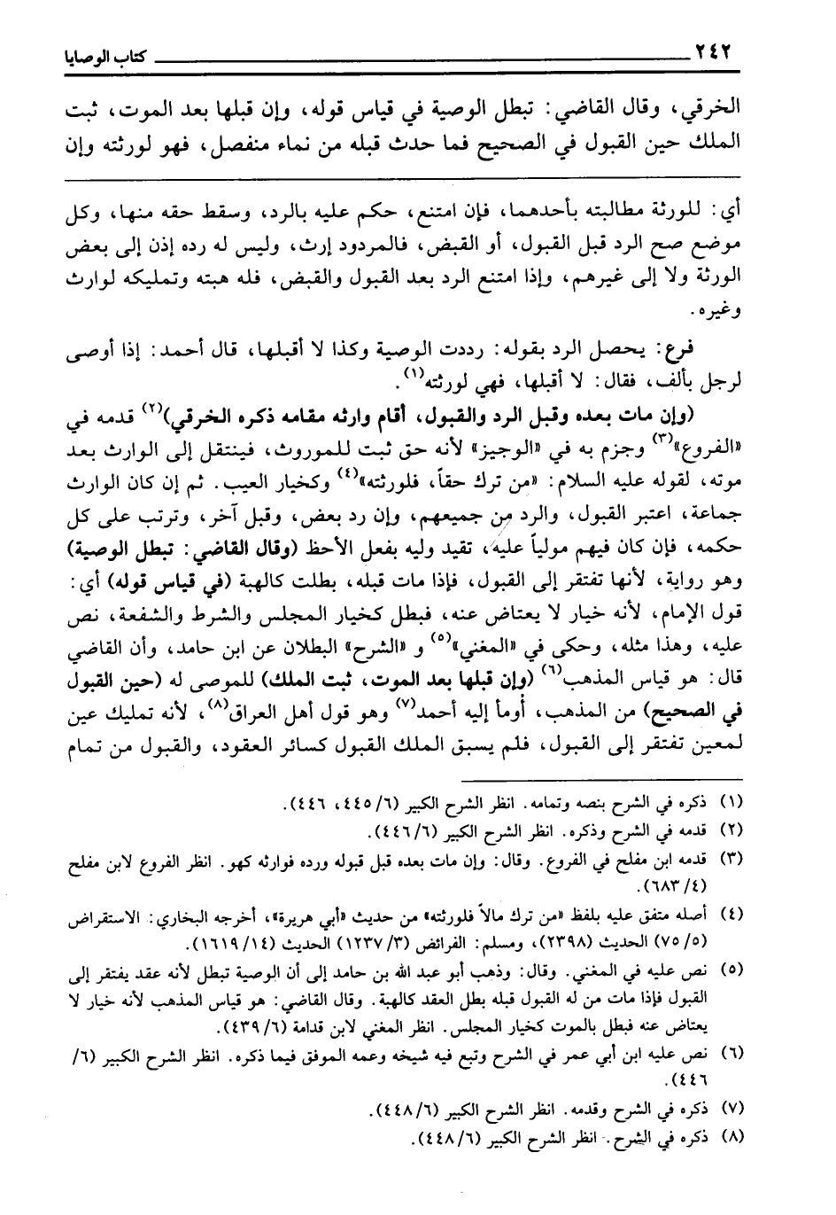 الْخِرَقِيُّ، وَقَالَ الْقَاضِي: تَبْطُلُ الْوَصِيَّةُ فِي قِيَاسِ قَوْلِهِ، وَإِنْ قَبِلَهَا بَعْدَ الْمَوْتِ ثَبَتَ الْمِلْكُ حِينَ الْقَبُولِ فِي الصَّحِيحِ، فَمَا حَدَثَ قَبْلَهُ مِنْ نَمَاءٍ مُنْفَصِلٍ، فَهُوَ لِوَرَثَتِهِ، وَإِنْ