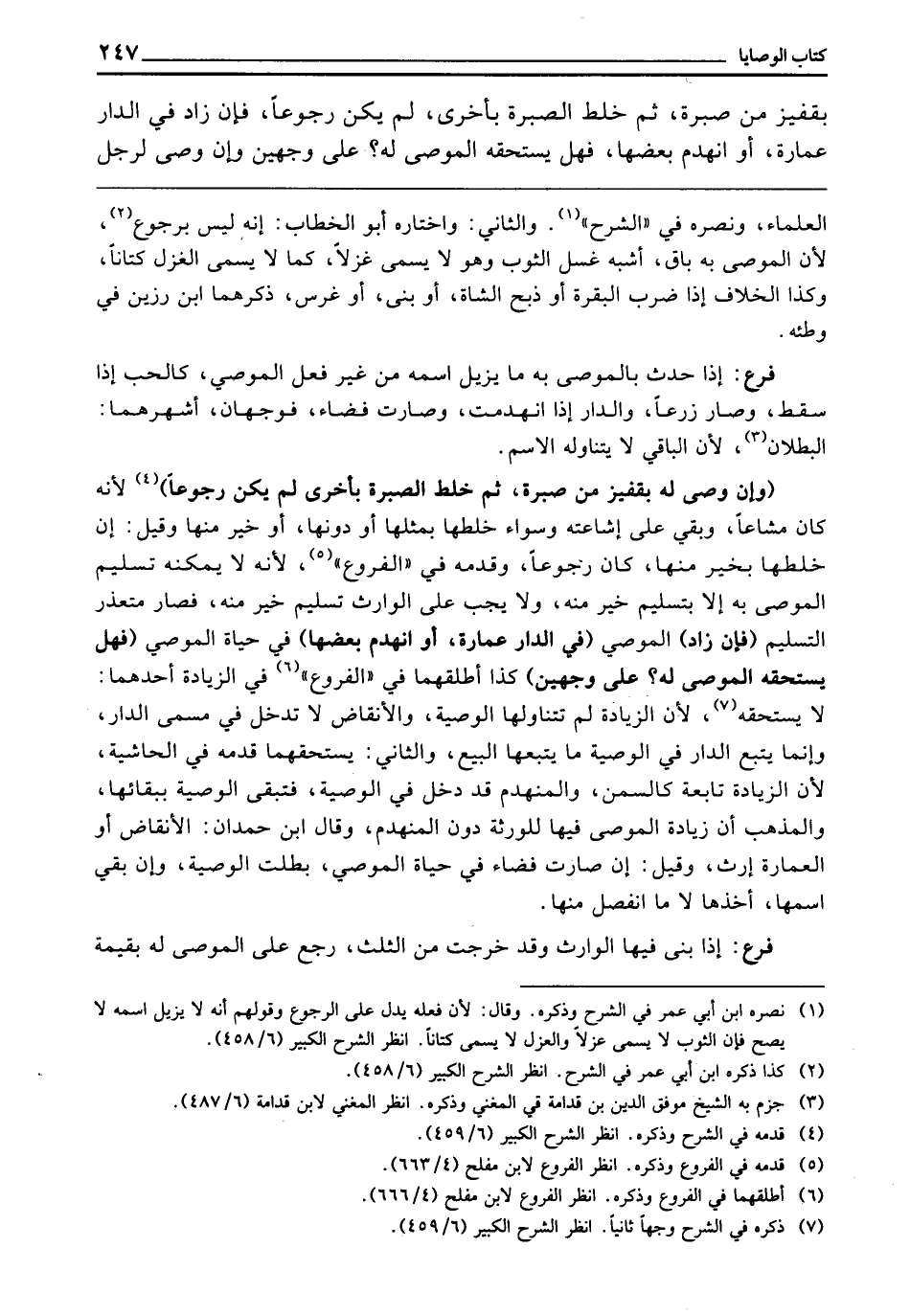 ـــــــــــــــــــــــــــــQالْعُلَمَاءِ، وَنَصَرَهُ فِي الشَّرْحِ، وَالثَّانِي، وَاخْتَارَهُ أَبُو الْخَطَّابِ: إِنَّهُ لَيْسَ بِرُجُوعٍ؛ لِأَنَّ الْمُوصَى بِهِ بَاقٍ أَشْبَهَ غَسْلَ الثَّوْبِ، وَهُوَ لَا يُسَمَّى غَزْلًا، كَمَا لَا يُسَمَّى الْغَزْلُ كِتَّانًا، وَكَذَا الْخِلَافُ إِذَا ضَرَبَ الْبَقَرَةَ، أَوْ ذَبَحَ الشَّاةَ، أَوْ بَنَى، أَوْ غَرَسَ، ذَكَرَهُمَا ابْنُ رَزِينٍ فِي مُوَطَّئِهِ.