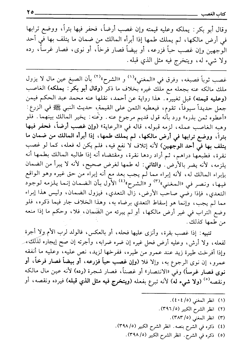 وَقَالَ أَبُو بَكْرٍ: يَمْلِكُهُ وَعَلَيْهِ قِيمَتُهُ. وَإِنْ غَصَبَ أَرْضًا فَحَفَرَ فِيهَا بِئْرًا وَوَضَعَ تُرَابَهَا فِي أَرْضِ مَالِكِهَا لَمْ يَمْلِكْ طَمَّهَا إِذَا أَبْرَأَهُ الْمَالِكُ مِنْ ضَمَانِ مَا يَتْلَفُ بِهَا فِي أَحَدِ الْوَجْهَيْنِ، وَإِنْ غَصَبَ حَبًّا فَزَرَعَهُ، أَوْ بَيْضًا فَصَارَ فَرْخًا، أَوْ نَوًى فَصَارَ غَرْسًا رَدَّهُ وَلَا شَيْءَ لَهُ، وَيَتَخَرَّجُ فِيهِ مِثْلُ الَّذِي قَبْلَهُ