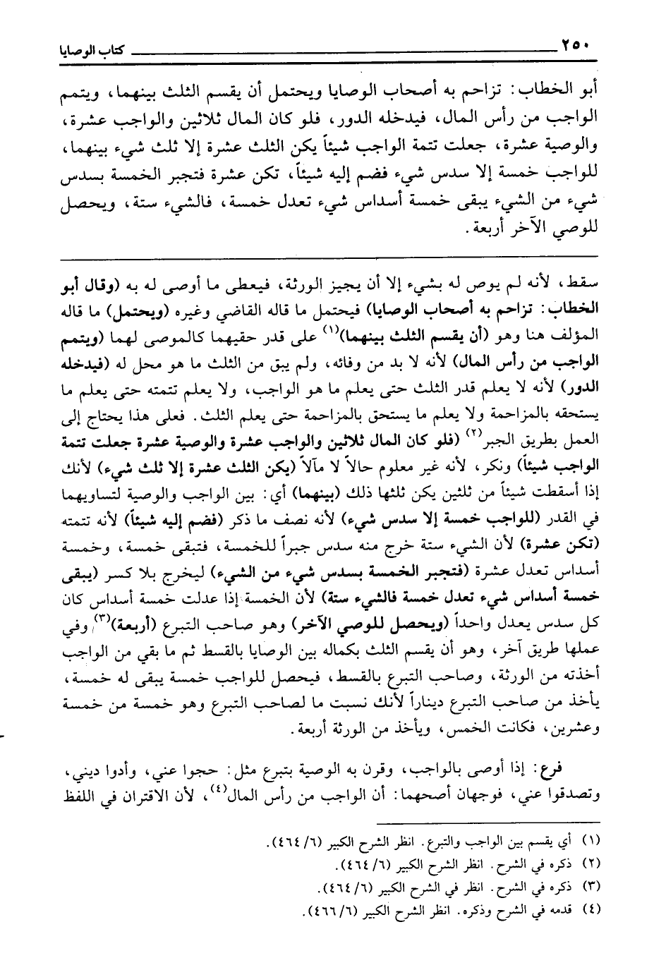 أَبُو الْخَطَّابِ: تُزَاحَمُ بِهِ أَصْحَابُ الْوَصَايَا، وَيُحْتَمَلُ أَنْ يُقْسَمَ الثُّلُثُ بَيْنَهُمَا، وَيُتَمَّمَ الْوَاجِبُ مِنْ رَأْسِ الْمَالِ، فَيَدْخُلُهُ الدَّوْرُ، فَلَوْ كَانَ الْمَالُ ثَلَاثِينَ وَالْوَاجِبُ عَشَرَةً وَالْوَصِيَّةُ عَشَرَةً، جُعِلَتْ تَتِمَّةُ الْوَاجِبِ شَيْئًا يَكُنِ الثُّلُثُ عَشَرَةً إِلَّا ثُلُثَ شَيْءٍ بَيْنَهُمَا، لِلْوَاجِبِ خَمْسَةٌ إِلَّا سُدُسَ شَيْءٍ فَضَمَّ إِلَيْهِ شَيْئًا، تَكُنْ عَشَرَةً، فَتُجْبَرُ الْخَمْسَةُ بِسُدُسِ شَيْءٍ، يَبْقَى خَمْسَةُ أَسْدَاسِ شَيْءٍ تَعْدِلُ خَمْسَةً، فَالشَّيْءُ سِتَّةٌ، وَيَحْصُلُ لِلْوَصِيِّ الْآخَرِ أَرْبَعَةٌ.