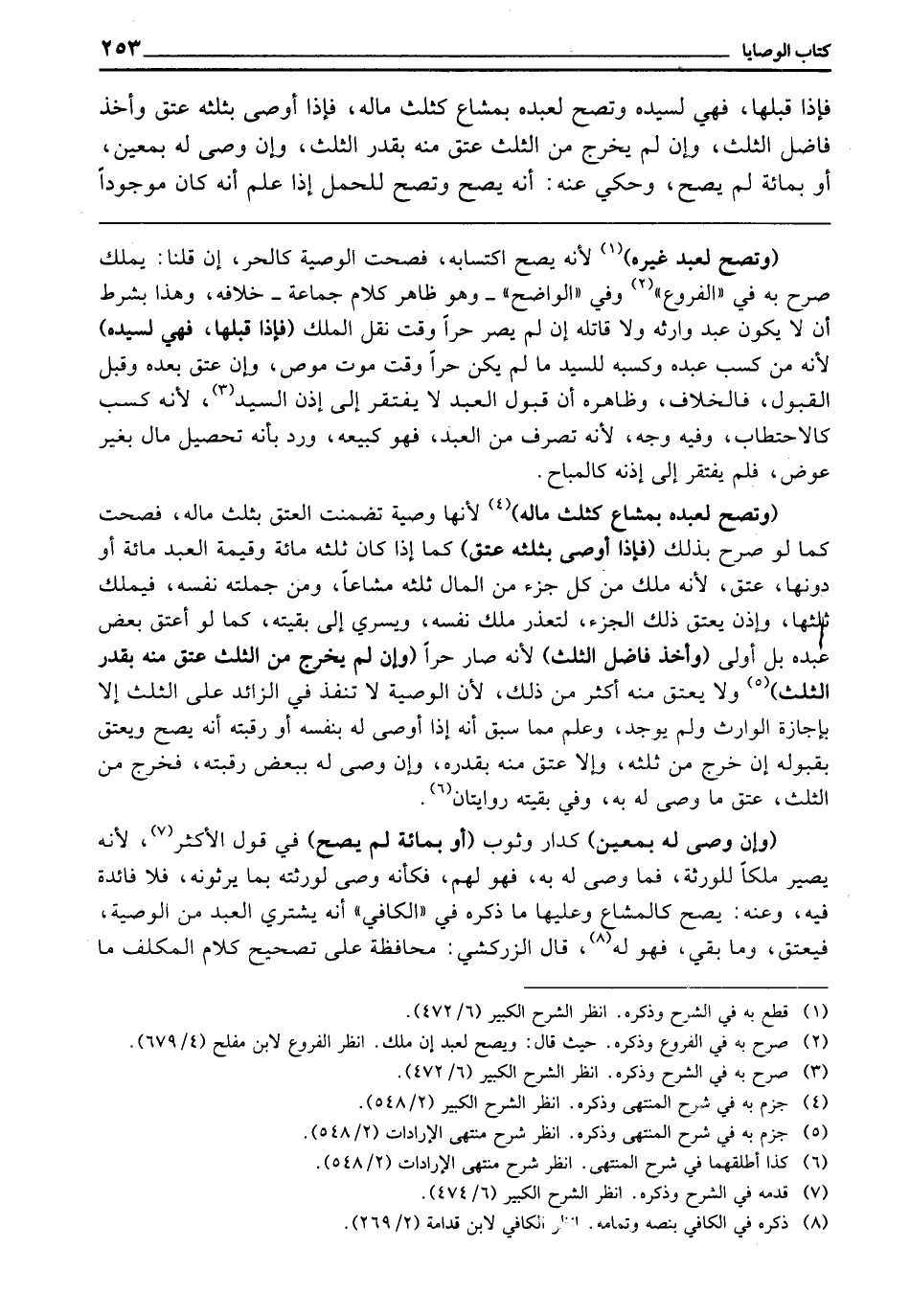 (وَتَصِحُّ لِعَبْدِهِ بِمَشَاعٍ كَثُلُثِ مَالِهِ) لِأَنَّهَا وَصِيَّةٌ تَضَمَّنَتِ الْعِتْقَ بِثُلُثِ مَالِهِ فَصَحَّتْ، كَمَا لَوْ صَرَّحَ بِذَلِكَ (فَإِذَا أَوْصَى بِثُلُثِهِ عَتَقَ) كَمَا إِذَا كَانَ ثُلُثُهُ مِائَةً، وَقِيمَةُ الْعَبْدِ مِائَةً أَوْ دُونَهَا، عَتَقَ؛ لِأَنَّهُ مَلَكَ مِنْ كُلِّ جُزْءٍ مِنَ الْمَالِ ثُلُثَهُ مَشَاعًا، وَمِنْ جُمْلَتِهِ نَفْسُهُ، فَيَمْلِكُ ثُلُثَهَا، وَإِذَنْ يَعْتِقُ ذَلِكَ الْجُزْءُ لِتَعَذُّرِ مِلْكِ نَفْسِهِ، وَيَسْرِي إِلَى بَقِيَّتِهِ، كَمَا لَوْ أَعْتَقَ بَعْضَ عَبْدِهِ، بَلْ أَوْلَى (وَأَخَذَ فَاضِلَ الثُّلُثِ) لِأَنَّهُ صَارَ حُرًّا (وَإِنْ لَمْ يَخْرُجْ مِنَ الثُّلُثِ عَتَقَ مِنْهُ بِقَدْرِ الثُّلُثِ) وَلَا يَعْتِقُ مِنْهُ أَكْثَرُ مِنْ ذَلِكَ؛ لِأَنَّ الْوَصِيَّةَ لَا تُنَفَّذُ فِي الزَّائِدِ عَلَى الثُّلُثِ، إِلَّا بِإِجَازَةِ الْوَارِثِ، وَلَمْ يُوجَدْ، وَعُلِمَ مِمَّا سَبَقَ أَنَّهُ إِذَا أَوْصَى لَهُ بِنَفْسِهِ، أَوْ رَقَبَتِهِ أَنَّهُ يَصِحُّ وَيَعْتِقُ بِقَبُولِهِ إِنْ خَرَجَ مِنْ ثُلُثِهِ، وَإِلَّا عَتَقَ مِنْهُ بِقَدْرِهِ، وَإِنْ وَصَّى لَهُ بِبَعْضِ رَقَبَتِهِ، فَخَرَجَ مِنَ الثُّلُثِ، عَتَقَ مَا وَصَّى لَهُ بِهِ، وَفِي بَقِيَّتِهِ رِوَايَتَانِ.