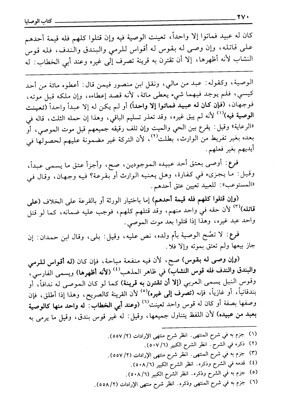 كَانَ لَهُ عَبِيدٌ فَمَاتُوا إِلَّا وَاحِدًا، تَعَيَّنَتِ الْوَصِيَّةُ فِيهِ، فَإِنْ قُتِلُوا كُلُّهُمْ، فَلَهُ قِيمَةُ أَحَدِهِمْ عَلَى قَاتِلِهِ، وَإِنْ وَصَّى لَهُ بِقَوْسٍ وَلَهُ أَقْوَاسٌ لِلرَّمْيِ وَالْبُنْدُقِ وَالنَّدْفِ، فَلَهُ قَوْسُ النِّشَابِ؛ لِأَنَّهُ أَظْهَرُهَا، إِلَّا أَنْ تَقْتَرِنَ بِهِ قَرِينَةٌ تَصْرِفُ إِلَى غَيْرِهِ، وَعِنْدَ أَبِي الْخَطَّابِ: لَهُ