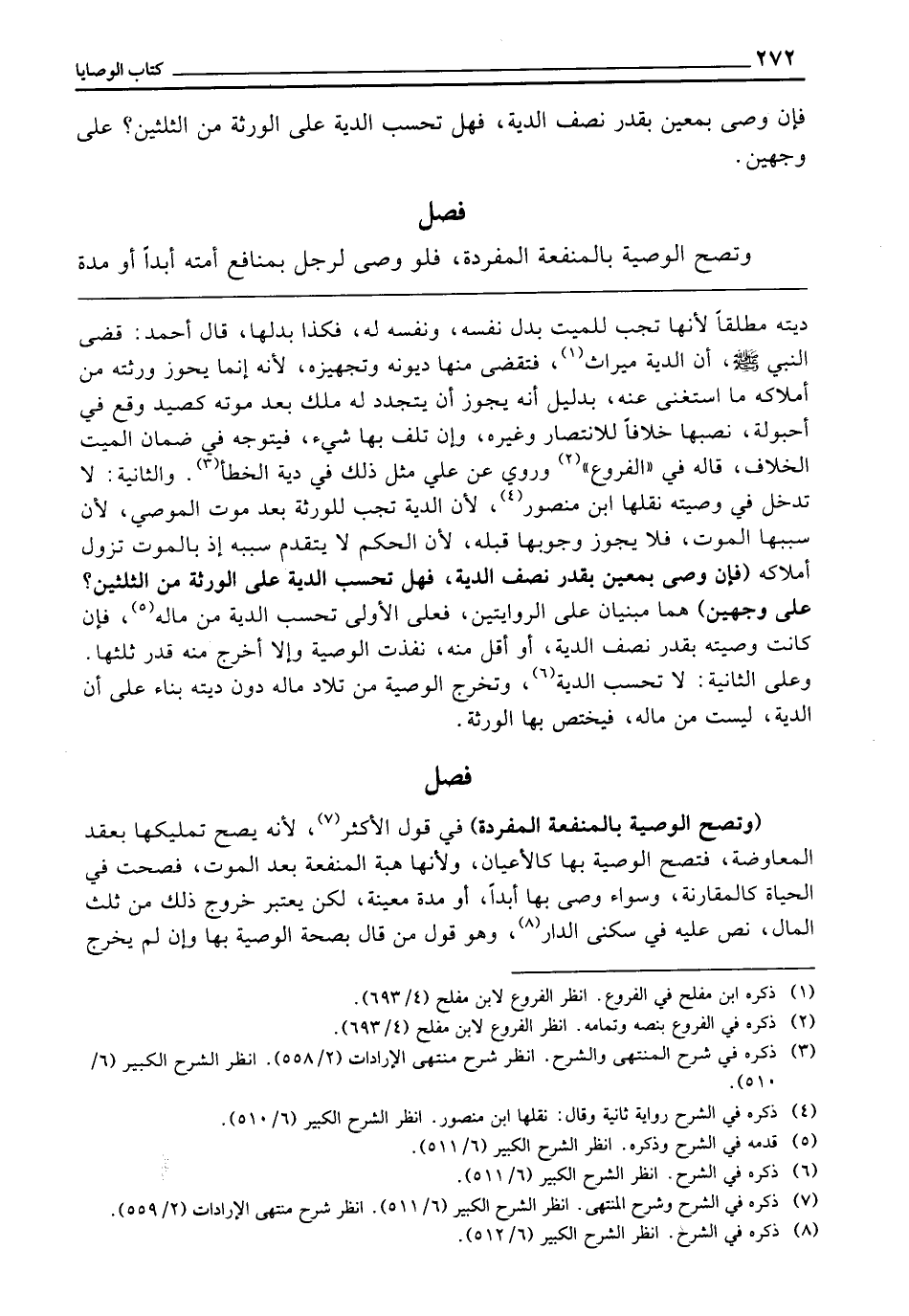 فَصْلٌ (وَتَصِحُّ الْوَصِيَّةُ بِالْمَنْفَعَةِ الْمُفْرَدَةِ) فِي قَوْلِ الْأَكْثَرِ؛ لِأَنَّهُ يَصِحُّ تَمْلِيكُهَا بِعَقْدِ الْمُعَاوَضَةِ، فَتَصِحُّ الْوَصِيَّةُ بِهَا كَالْأَعْيَانِ، وَلِأَنَّهَا هِبَةُ الْمَنْفَعَةِ بَعْدَ الْمَوْتِ، فَصَحَّتْ فِي الْحَيَاةِ كَالْمُقَارَنَةِ، وَسَوَاءٌ وَصَّى بِهَا أَبَدًا، أَوْ مُدَّةً مُعَيَّنَةً، لَكِنْ يُعْتَبَرُ خُرُوجُ ذَلِكَ مِنْ ثُلُثِ الْمَالِ، نَصَّ عَلَيْهِ فِي سُكْنَى الدَّارِ، وَهُوَ قَوْلُ مَنْ قَالَ بِصِحَّةِ الْوَصِيَّةِ بِهَا، وَإِنْ لَمْ يَخْرُجْ