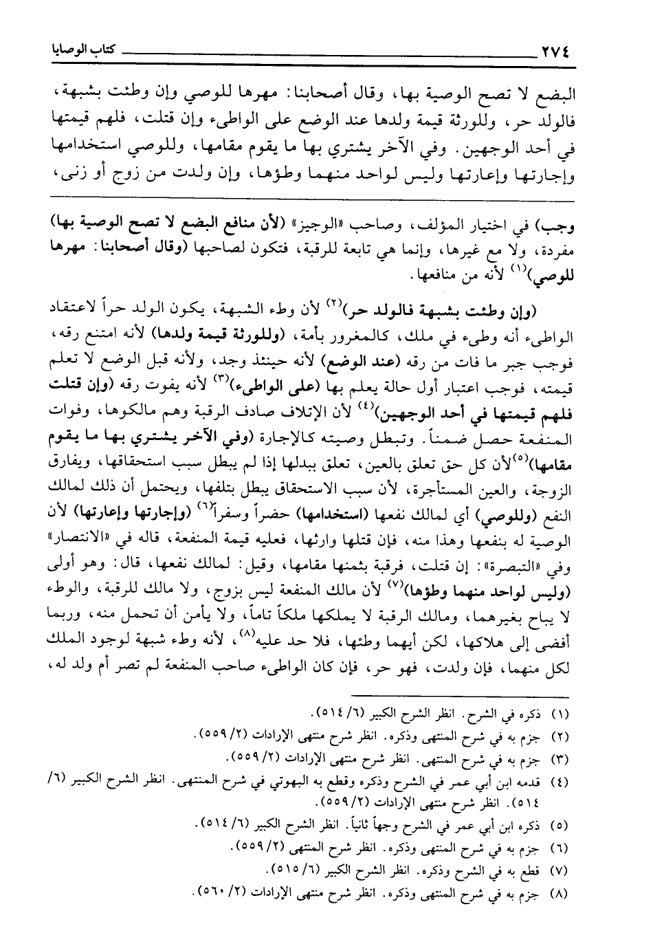 الْبِضْعِ لَا تَصِحُّ الْوَصِيَّةُ بِهَا، وَقَالَ أَصْحَابُنَا: مَهْرُهَا لِلْوَصِيِّ، وَإِنْ وُطِئَتْ بِشُبْهَةٍ، فَالْوَلَدُ حُرٌّ، وَلِلْوَرَثَةِ قِيمَةُ وَلَدِهَا عِنْدَ الْوَضْعِ عَلَى الْوَاطِئِ، وَإِنْ قُتِلَتْ، فَلَهُمْ قِيمَتُهَا فِي أَحَدِ الْوَجْهَيْنِ، وَفِي الْآخَرِ يَشْتَرِي بِهَا مَا يَقُومُ مَقَامَهَا، وَلِلْوَصِيِّ اسْتِخْدَامُهَا وَإِجَارَتُهَا وَإِعَارَتُهَا، وَلَيْسَ لِوَاحِدٍ مِنْهُمَا وَطْؤُهَا، وَإِنْ وَلَدَتْ مِنْ زَوْجٍ أَوْ زِنًى،