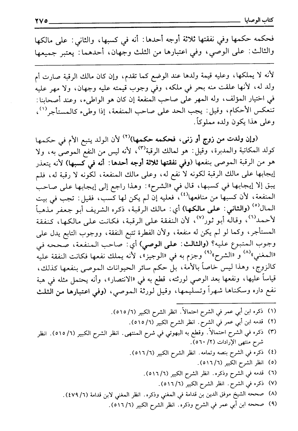 فَحُكْمُهُ حُكْمُهَا وَفِي نَفَقَتِهَا ثَلَاثَةُ أَوْجُهٍ، أَحَدُهَا: أَنَّهُ فِي كَسْبِهَا، وَالثَّانِي: عَلَى مَالِكِهَا، وَالثَّالِثُ: عَلَى الْوَصِيِّ، وَفِي اعْتِبَارِهَا مِنَ الثُّلُثِ وَجْهَانِ، أَحَدُهُمَا: يُعْتَبَرُ جَمِيعُهَا