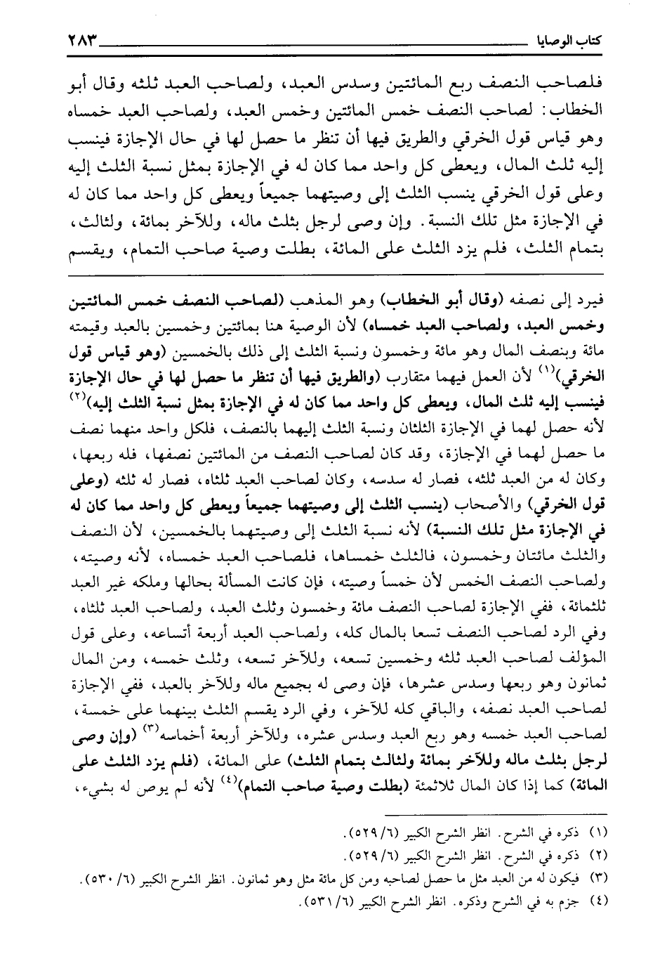 فَلِصَاحِبِ النِّصْفِ رُبُعُ الْمِائَتَيْنِ وَسُدُسُ الْعَبْدِ، وَلِصَاحِبِ الْعَبْدِ ثُلُثُهُ، وَقَالَ أَبُو الْخَطَّابِ: لِصَاحِبِ النِّصْفِ خُمْسُ الْمِائَتَيْنِ وَخُمْسُ الْعَبْدِ، وَلِصَاحِبِ الْعَبْدِ خُمْسَاهُ، وَهُوَ قِيَاسُ قَوْلِ الْخِرَقِيِّ، وَالطَّرِيقُ فِيهَا أَنْ تَنْظُرَ مَا حَصَلَ لَهَا فِي حَالِ الْإِجَازَةِ، فَيُنْسَبُ إِلَيْهِ ثُلُثُ الْمَالِ، وَيُعْطَى كُلُّ وَاحِدٍ مِمَّا كَانَ لَهُ فِي الْإِجَازَةِ بِمِثْلِ نِسْبَةِ الثُّلُثِ إِلَيْهِ وَعَلَى قَوْلِ الْخِرَقِيِّ يُنْسَبُ الثُّلُثُ إِلَى وَصِيَّتِهِمَا جَمِيعًا، وَيُعْطَى كُلُّ وَاحِدٍ مِمَّا كان لَهُ فِي الْإِجَازَةِ مِثْلَ تِلْكَ النِّسْبَةِ وَإِنْ وَصَّى لِرَجُلٍ بِثُلُثِ مَالِهِ، وَلِلْآخَرِ بِمِائَةٍ، وَلِثَالِثٍ بِتَمَامِ الثُّلُثِ، فَلَمْ يَزِدِ الثُّلُثُ عَلَى الْمِائَةِ، بَطَلَتْ وَصِيَّةُ صَاحِبِ التَّمَامِ، وَيُقْسَمُ