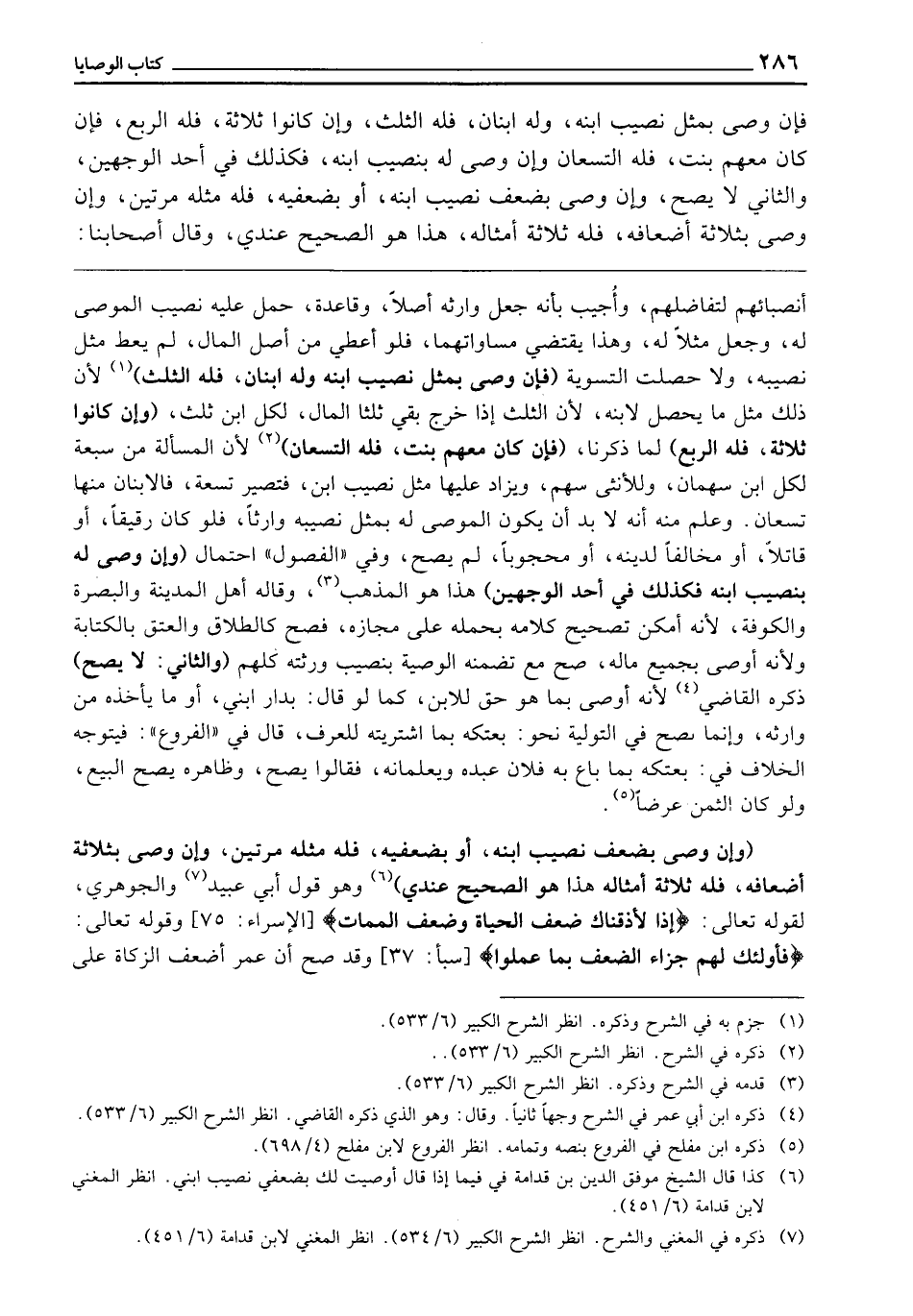 (وَإِنْ وَصَّى بِضِعْفِ نَصِيبِ ابْنِهِ، أَوْ بِضِعْفَيْهِ، فَلَهُ مِثْلُهُ مَرَّتَيْنِ، وَإِنْ وَصَّى بِثَلَاثَةِ أَضْعَافِهِ، فَلَهُ ثَلَاثَةُ أَمْثَالِهِ، هَذَا هُوَ الصَّحِيحُ عِنْدِي) وَهُوَ قَوْلُ أَبِي عُبَيْدٍ، وَالْجَوْهَرِيِّ، لِقَوْلِهِ تَعَالَى: {إِذًا لأَذَقْنَاكَ ضِعْفَ الْحَيَاةِ وَضِعْفَ الْمَمَاتِ} [الإسراء: 75] ، وقَوْله تَعَالَى: {فَأُولَئِكَ لَهُمْ جَزَاءُ الضِّعْفِ بِمَا عَمِلُوا} [سبأ: 37] ، وَقَدْ صَحَّ أَنَّ عُمَرَ أَضْعَفَ الزَّكَاةَ عَلَى