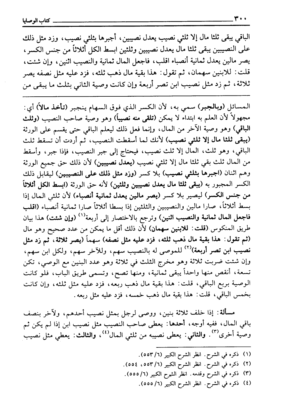 ـــــــــــــــــــــــــــــQالْمَسَائِلِ، (وَبِالْجَبْرِ) سُمِّيَ بِهِ؛ لِأَنَّ الْكَسْرَ الَّذِي فَوْقَ السِّهَامِ يَنْجَبِرُ (تَأْخُذُ مَالًا) أَيْ مَجْهُولًا؛ لِأَنَّ الْعِلْمَ بِهِ ابْتِدَاءً لَا يُمْكِنُ (تُلْقِي مِنْهُ نَصِيبًا) وَهُوَ وَصِيَّةُ صَاحِبِ النَّصِيبِ (وَثُلُثَ الْبَاقِي) وَهُوَ وَصِيَّةُ الْآخَرِ مِنَ الْمَالِ، وَإِنَّمَا فُعِلَ ذَلِكَ لِيُعْلَمَ الْبَاقِي حَتَّى يُقَسَّمَ عَلَى الْوَرَثَةِ (يَبْقَى ثُلُثَا مَالٍ إِلَّا ثُلُثَيْ نَصِيبٍ) لِأَنَّكَ لَمَّا أَسْقَطْتَ النَّصِيبَ، ثُمَّ أَرَدْتَ أَنْ تُسْقِطَ ثُلُثَ الْبَاقِي، وَهُوَ ثُلُثُ الْمَالِ إِلَّا ثُلُثَ نَصِيبٍ فَيَحْتَاجُ إِلَى جَبْرِ النَّصِيبِ، فَإِذَا جُبِرَ، وَأُسْقِطَ مِنَ الْمَالِ ثُلُثٌ بَقِيَ ثُلُثَا مَالٍ إِلَّا ثُلُثَيْ نَصِيبٍ (يَعْدِلُ نَصِيبَيْنِ) لِأَنَّ ذَلِكَ حَقُّ جَمِيعِ الْوَرَثَةِ، وَهُمُ اثْنَانِ (اجْبُرْهَا بِثُلُثَيْ نَصِيبٍ) بِلَا كَسْرٍ، (وَزِدْ مِثْلَ ذَلِكَ عَلَى النَّصِيبَيْنِ) لِيُقَابِلَ ذَلِكَ الْكَسْرَ الْمَجْبُورَ بِهِ (يَبْقَى ثُلُثَا مَالٍ يَعْدِلُ نَصِيبَيْنِ وَثُلُثَيْنِ) لِأَنَّهُ حَقُّ الْوَرَثَةِ (ابْسُطِ الْكُلَّ أَثْلَاثًا مِنْ جِنْسِ الْكَسْرِ) لِيَصِيرَ بِلَا كَسْرٍ (يَصِرْ مَالَيْنِ يَعْدِلُ ثَمَانِيَةَ أَنْصِبَاءَ) لِأَنَّ ثُلُثَيِ الْمَالِ إِذَا بُسِطَ أَثْلَاثًا، صَارَا مَالَيْنِ وَالنَّصِيبَيْنِ وَالثُّلُثَيْنِ إِذَا بُسِطَا أَثْلَاثًا صَارَا ثَمَانِيَةَ أَنْصِبَاءَ (اقْلِبْ فَاجْعَلِ الْمَالَ ثَمَانِيَةً، وَالنَّصِيبَ اثْنَيْنِ) وَتَرْجِعُ بِالِاخْتِصَارِ إِلَى أَرْبَعَةٍ، (وَإِنْ شِئْتَ) هَذَا بَيَانُ طَرِيقِ الْمَنْكُوسِ (قُلْتَ: لِلِابْنَيْنِ سَهْمَانِ) لِأَنَّ ذَلِكَ أَقَلُّ مَا يُمْكِنُ مِنْ عَدَدٍ صَحِيحٍ، وَهُوَ مَالٌ (ثُمَّ تَقُولُ: هَذَا بَقِيَّةُ مَالٍ ذَهَبَ ثُلُثُهُ، فَزِدْ عَلَيْهِ مِثْلَ نِصْفِهِ) سَهْمًا (يَصِرْ ثَلَاثَةً، ثُمَّ زِدْ مِثْلَ نَصِيبِ ابْنٍ تَصِرْ أَرْبَعَةً) لِلْمُوصَى لَهُ بِالنَّصِيبِ سَهْمٌ، وَلِلْآخَرِ سَهْمٌ، وَلِكُلِّ ابْنٍ سَهْمٌ، وَإِنْ شِئْتَ ضَرَبْتَ ثَلَاثَةً، وَهُوَ مُخْرَجُ الثُّلُثِ فِي ثَلَاثَةٍ، وَهُوَ عَدَدُ الْبَنِينَ مَعَ الْوَصِيِّ، تَكُنْ تِسْعَةً، انْقُصْ مِنْهَا وَاحِدًا يَبْقَى ثَمَانِيَةٌ، وَمِنْهَا تَصِحُّ، وَتُسَمَّى طَرِيقَ الْبَابِ، فَلَوْ كَانَتِ الْوَصِيَّةُ بِرُبُعِ الْبَاقِي، قُلْتَ هَذَا بَقِيَّةُ مَالٍ ذَهَبَ رُبُعُهُ فَزِدْ عَلَيْهِ مِثْلَ ثُلُثِهِ، وَإِنْ كَانَتْ بِخُمْسِ الْبَاقِي، قُلْتَ: هَذَا بَقِيَّةُ مَالٍ ذَهَبَ خُمْسُهُ، فَزِدْ عَلَيْهِ مِثْلَ رُبُعِهِ.