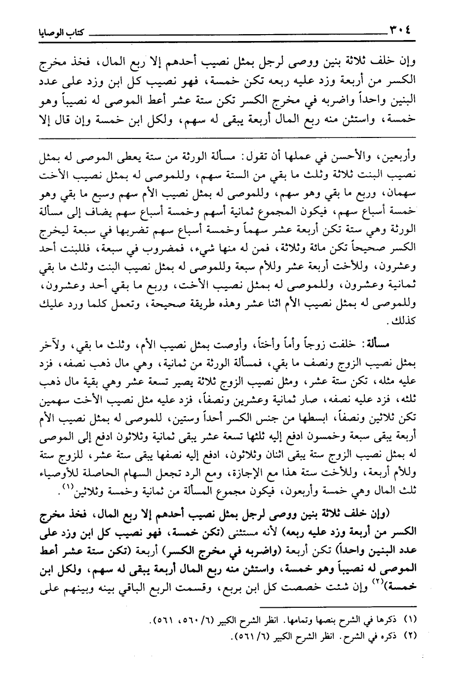 ـــــــــــــــــــــــــــــQوَأَرْبَعِينَ، وَالْأَحْسَنُ فِي عَمَلِهَا أَنْ تَقُولَ: مَسْأَلَةُ الْوَرَثَةِ مِنْ سِتَّةٍ يُعْطَى الْمُوصَى لَهُ بِمِثْلِ نَصِيبِ الْبِنْتِ ثَلَاثَةً وَثُلُثَ مَا بَقِيَ مِنَ السِّتَّةِ سَهْمٌ، وَلِلْمُوصَى لَهُ بِمِثْلِ نَصِيبِ الْأُخْتِ سَهْمَانِ وَرُبُعُ مَا بَقِيَ وَهُوَ سَهْمٌ، وَلِلْمُوصَى لَهُ بِمِثْلِ نَصِيبِ الْأُمِّ سَهْمٌ وَسُبُعُ مَا بَقِيَ وَهُوَ خَمْسَةُ أَسْبَاعِ سَهْمٍ، فَيَكُونُ الْمَجْمُوعُ ثَمَانِيَةَ أَسْهُمٍ، وَخَمْسَةُ أَسْبَاعِ سَهْمٍ يُضَافُ إِلَى مَسْأَلَةِ الْوَرَثَةِ، وَهِيَ سِتَّةٌ تَكُنْ أَرْبَعَةَ عَشَرَ سَهْمًا، وَخَمْسَةُ أَسْبَاعِ سَهْمٍ تَضْرِبُهَا فِي سَبْعَةٍ لِيَخْرُجَ الْكَسْرُ صَحِيحًا تَكُنْ مِائَةً وَثَلَاثَةً، فَمَنْ لَهُ مِنْهَا شَيْءٌ فَمَضْرُوبٌ فِي سَبْعَةٍ، فَلِلْبِنْتِ أَحَدٌ وَعِشْرُونَ، وَلِلْأُخْتِ أَرْبَعَةَ عَشَرَ، وَلِلْأُمِّ سَبْعَةٌ وَلِلْمُوصَى لَهُ بِمِثْلِ نَصِيبِ الْبِنْتِ وَثُلُثِ مَا بَقِيَ ثَمَانِيَةٌ وَعِشْرُونَ، وَلِلْمُوصَى لَهُ بِمِثْلِ نَصِيبِ الْأُخْتِ وَرُبُعِ مَا بَقِيَ أَحَدٌ وَعِشْرُونَ، وَلِلْمُوصَى لَهُ بِمِثْلِ نَصِيبِ الْأُمِّ اثْنَا عَشَرَ، وَهَذِهِ طَرِيقَةٌ صَحِيحَةٌ، وَتَعْمَلُ كُلَّمَا وَرَدَ عَلَيْكَ كَذَلِكَ.