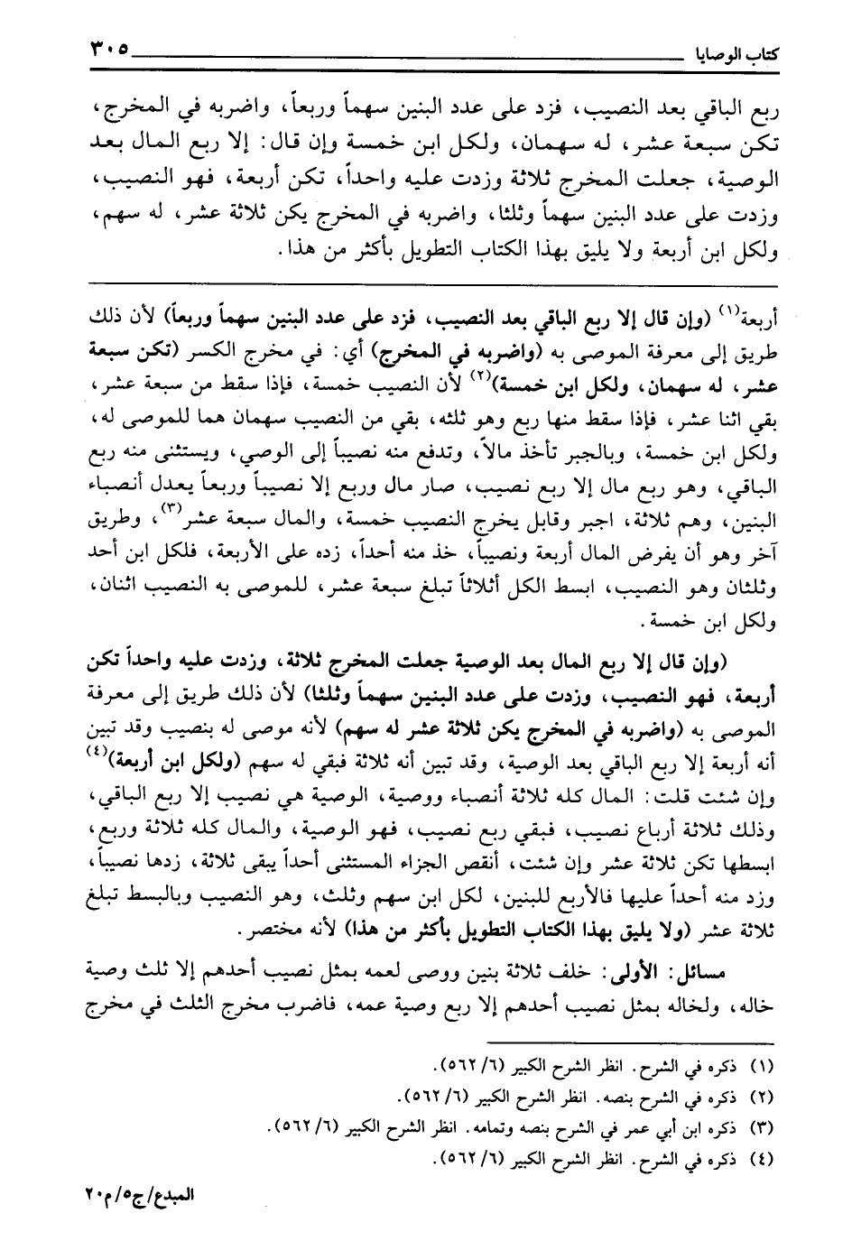 رُبُعَ الْبَاقِي بَعْدَ النَّصِيبِ، فَزِدْ عَلَى عَدَدِ الْبَنِينَ سَهْمًا وَرُبُعًا، وَاضْرِبْهُ فِي الْمُخْرَجِ، تَكُنْ سَبْعَةَ عَشَرَ، لَهُ سَهْمَانِ، وَلِكُلِّ ابْنٍ خَمْسَةٌ، وَإِنْ قَالَ: إِلَّا رُبُعَ الْمَالِ بَعْدَ الْوَصِيَّةِ، جَعَلْتَ الْمُخْرَجَ ثَلَاثَةً، وَزِدْتَ عَلَيْهِ وَاحِدًا، تَكُنْ أَرْبَعَةً، فَهُوَ النَّصِيبُ، وَزِدْ عَلَى عدد الْبَنِينَ سَهْمًا وَثُلُثًا، اضْرِبْهُ فِي الْمَخْرَجِ يَكُنْ ثَلَاثَةَ عَشَرَ، لَهُ سَهْمٌ وَلِكُلِّ ابْنٍ أَرْبَعَةٌ وَلَا يَلِيقُ بِهَذَا الْكِتَابِ التَّطْوِيلُ بِأَكْثَرَ مِنْ هَذَا.