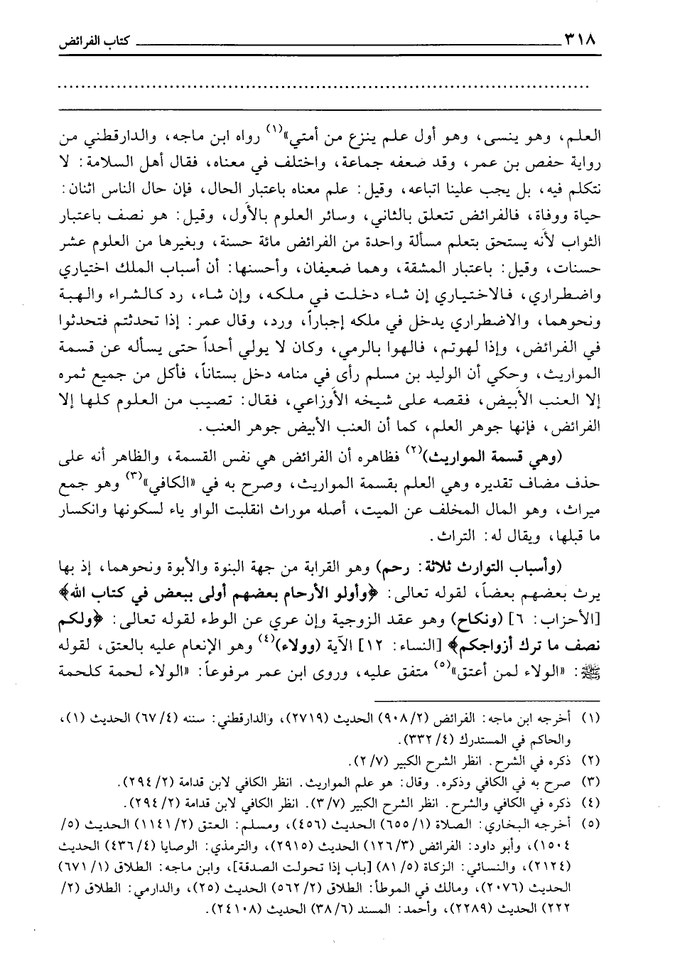 ـــــــــــــــــــــــــــــQالْعِلْمِ، وَهُوَ يُنْسَى، وَهُوَ أَوَّلُ عِلْمٍ يُنْزَعُ مِنْ أُمَّتِي» رَوَاهُ ابْنُ مَاجَهْ، وَالدَّارَقُطْنِيُّ مِنْ رِوَايَةِ حَفْصِ بْنِ عُمَرَ، وَقَدْ ضَعَّفَهُ جَمَاعَةٌ، وَاخْتُلِفَ فِي مَعْنَاهُ، فَقَالَ أَهْلُ السَّلَامَةِ: لَا نَتَكَلَّمُ فِيهِ، بَلْ يَجِبُ عَلَيْنَا اتِّبَاعُهُ، وَقِيلَ: عُلِمَ مَعْنَاهُ بِاعْتِبَارِ الْحَالِ، فَإِنَّ حَالَ النَّاسِ اثْنَانِ، حَيَاةٌ وَوَفَاةٌ، فَالْفَرَائِضُ تَتَعَلَّقُ بِالثَّانِي، وَسَائِرُ الْعُلُومِ بِالْأَوَّلِ، وَقِيلَ: هُوَ نِصْفٌ بِاعْتِبَارِ الثَّوَابِ؛ لِأَنَّهُ يَسْتَحِقُّ بِتَعَلُّمِ مَسْأَلَةٍ وَاحِدَةٍ مِنَ الْفَرَائِضِ مِائَةَ حَسَنَةٍ، وَبِغَيْرِهَا مِنَ الْعُلُومِ عَشْرَ حَسَنَاتٍ، وَقِيلَ بِاعْتِبَارِ الْمَشَقَّةِ، وَهُمَا ضَعِيفَانِ، وَأَحْسَنُهَا أَنَّ أَسْبَابَ الْمِلْكِ اخْتِيَارِيٌّ وَاضْطِرَارِيٌّ، فَالِاخْتِيَارِيُّ إِنْ شَاءَ دَخَلْتَ فِي مِلْكِهِ، وَإِنْ شَاءَ رُدَّ كَالشِّرَاءِ وَالْهِبَةِ وَنَحْوِهِمَا، وَالِاضْطِرَارِيُّ يُدْخَلُ فِي مِلْكِهِ إِجْبَارًا، وَرُدَّ، وَقَالَ عُمَرُ: إِذَا تَحَدَّثْتُمْ فَتَحَدَّثُوا فِي الْفَرَائِضِ، وَإِذَا لَهَوْتُمْ فَالْهَوْا بِالرَّمْيِ، وَكَانَ لَا يُوَلِّي أَحَدًا حَتَّى يَسْأَلَهُ عَنْ قِسْمَةِ الْمَوَارِيثِ، وَحُكِيَ أَنَّ الْوَلِيدَ بْنَ مُسْلِمٍ رَأَى فِي مَنَامِهِ دَخَلَ بُسْتَانًا، فَأَكَلَ مِنْ جَمِيعِ ثَمَرِهِ إِلَّا الْعِنَبَ الْأَبْيَضَ، فَقَصَّهُ عَلَى شَيْخِهِ الْأَوْزَاعِيِّ، فَقَالَ: تُصِيبُ مِنَ الْعُلُومِ كُلِّهَا إِلَّا الْفَرَائِضَ، فَإِنَّهَا جَوْهَرُ الْعِلْمِ، كَمَا أَنَّ الْعِنَبَ الْأَبْيَضَ جَوْهَرُ الْعِنَبِ.