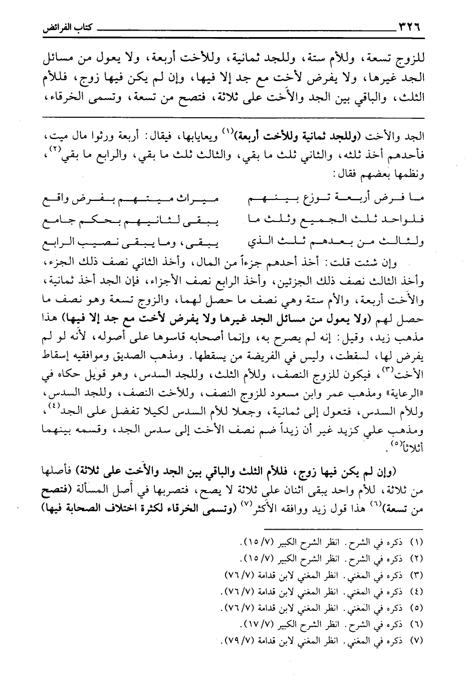 لِلزَّوْجِ تِسْعَةٌ، وَلِلْأُمِّ سِتَّةٌ، وَلِلْجَدِّ ثَمَانِيَةٌ، وَلِلْأُخْتِ أَرْبَعَةٌ، وَلَا يَعُولُ مِنْ مَسَائِلِ الْجَدِّ غَيْرُهَا، وَلَا يُفْرَضُ لِأُخْتٍ مَعَ جَدٍّ إِلَّا فِيهَا، وَإِنْ لَمْ يَكُنْ فِيهَا زَوْجٌ، فَلِلْأُمِّ الثُّلُثُ، وَالْبَاقِي بَيْنَ الْجَدِّ وَالْأُخْتِ عَلَى ثَلَاثَةٍ، فَتَصِحُّ مِنْ تِسْعَةٍ، وَتُسَمَّى الْخَرْقَاءَ؛