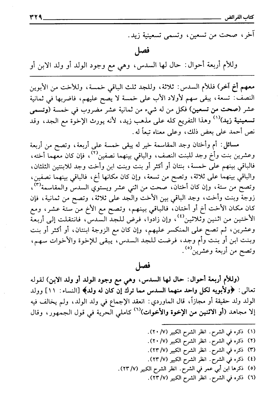 ـــــــــــــــــــــــــــــQمَعَهُمْ أَخٌ آخَرُ) فَلِلْأُمِّ السُّدُسُ: ثَلَاثَةٌ، وَلِلْجَدِّ ثُلُثُ الْبَاقِي: خَمْسَةٌ، وَلِلْأُخْتِ مِنَ الْأَبَوَيْنِ النِّصْفُ: تِسْعَةٌ، يَبْقَى سَهْمٌ لِأَوْلَادِ الْأَبِ عَلَى خَمْسَةٍ لَا يَصِحُّ عَلَيْهِمْ، فَاضْرِبْهَا فِي ثَمَانِيَةَ عَشَرَ (صَحَّتْ مِنْ تِسْعِينَ) فَكُلُّ مَنْ لَهُ شَيْءٌ مِنْ ثَمَانِيَةَ عَشَرَ مَضْرُوبٌ فِي خَمْسَةٍ (وَتُسَمَّى تِسْعِينِيَّةَ زَيْدٍ) وَهَذَا التَّفْرِيعُ كُلُّهُ عَلَى مَذْهَبِ زَيْدٍ؛ لِأَنَّهُ يُوَرِّثُ الْإِخْوَةَ مَعَ الْجَدِّ، وَقَدْ نَصَّ أَحْمَدُ عَلَى بَعْضِ ذَلِكَ، وَعَلَى مَعْنَاهُ تَبَعًا لَهُ.