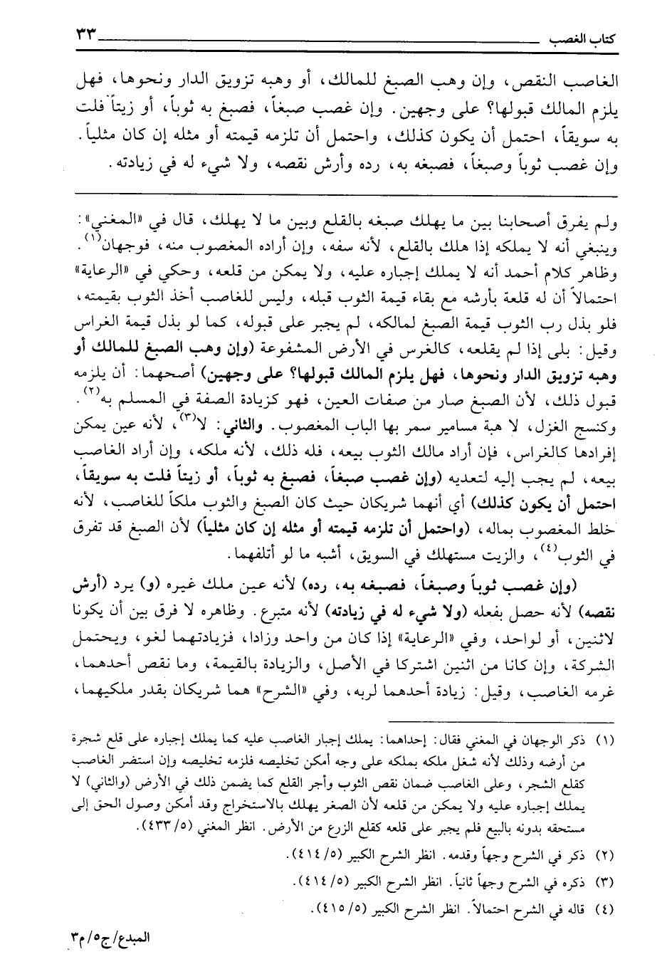 الْغَاصِبُ النَّقْصَ، وَإِنْ وَهَبَ الصِّبْغَ لِلْمَالِكِ أَوْ وَهَبَهُ تَزْوِيقَ الدَّارِ وَنَحْوِهَا، فَهَلْ يَلْزَمُ الْمَالِكَ قَبُولُهَا؟ عَلَى وَجْهَيْنِ، وَإِنْ غَصَبَ صِبْغًا فَصَبَغَ بِهِ ثَوْبًا، أَوْ زَيْتًا فَلَتَّ بِهِ سَوِيقًا، احْتَمَلَ أَنْ يَكُونَ كَذَلِكَ، وَاحْتَمَلَ أَنْ تَلْزَمَهُ قِيمَتُهُ أَوْ مِثْلُهُ إِنْ كَانَ مِثْلِيًّا، وَإِنْ غَصَبَ ثَوْبًا وَصِبْغَا، فَصَبَغَهُ بِهِ رَدَّهُ وَأَرْشَ نَقْصِهِ وَلَا شَيْءَ لَهُ فِي زِيَادَتِهِ.