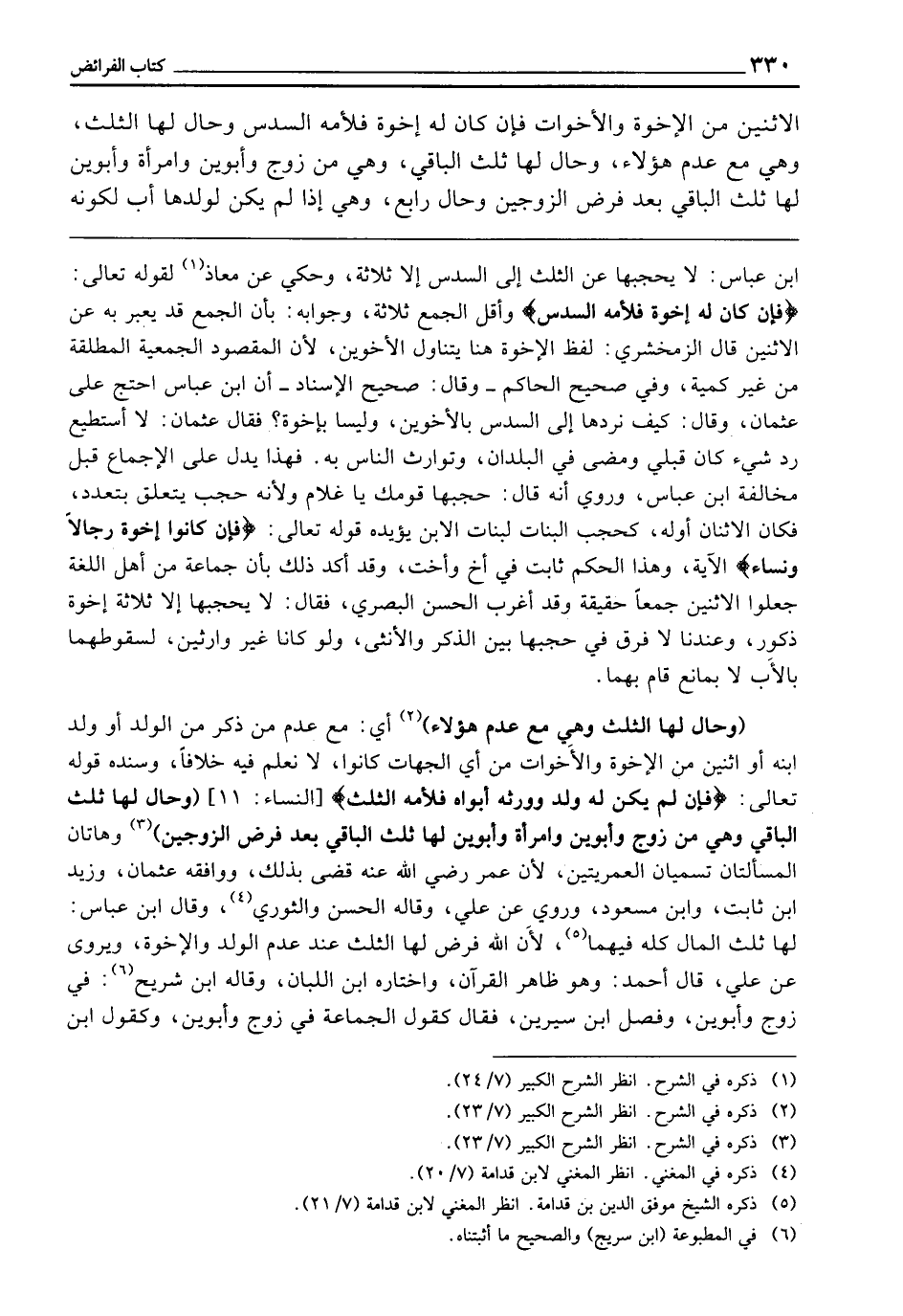 ـــــــــــــــــــــــــــــQابْنُ عَبَّاسٍ: لَا يَحْجُبُهَا عَنِ الثُّلُثِ إِلَى السُّدُسِ إِلَّا ثَلَاثَةٌ، وَحُكِيَ عَنْ مُعَاذٍ: لِقَوْلِهِ تَعَالَى: {فَإِنْ كَانَ لَهُ إِخْوَةٌ فَلأُمِّهِ السُّدُسُ} [النساء: 11] وَأَقَلُّ الْجَمْعِ ثَلَاثَةٌ، وَجَوَابُهُ: بِأَنَّ الْجَمْعَ قَدْ يُعَبَّرُ بِهِ عَنِ الِاثْنَيْنِ، قَالَ الزَّمَخْشَرِيُّ: لَفْظُ الْإِخْوَةِ هُنَا يَتَنَاوَلُ الْأَخَوَيْنِ؛ لِأَنَّ الْمَقْصُودَ الْجَمْعِيَّةُ الْمُطْلَقَةُ مِنْ غَيْرِ كَمِّيَّةٍ. وَفِي صَحِيحِ الْحَاكِمِ - وَقَالَ: صَحِيحُ الْإِسْنَادِ - إِنَّ ابْنَ عَبَّاسٍ احْتَجَّ عَلَى عُثْمَانَ، وَقَالَ: كَيْفَ نَرُدُّهَا إِلَى السُّدُسِ بِالْأَخَوَيْنِ، وَلَيْسَا بِإِخْوَةٍ؟ فَقَالَ عُثْمَانُ: لَا أَسْتَطِيعُ رَدَّ شَيْءٍ كَانَ قَبْلِي، وَمَضَى فِي الْبُلْدَانِ، وَتَوَارَثَ النَّاسُ بِهِ، فَهَذَا يَدُلُّ عَلَى الْإِجْمَاعِ قَبْلَ مُخَالَفَةِ ابْنِ عَبَّاسٍ، وَرُوِيَ أَنَّهُ قَالَ: حَجَبَهَا قَوْمُكَ يَا غُلَامُ، وَلِأَنَّهُ حَجْبٌ يَتَعَلَّقُ بِتَعَدُّدٍ، فَكَانَ الِاثْنَانِ أَوَّلَهُ، كَحَجْبِ الْبَنَاتِ لِبَنَاتِ الِابْنِ، يُؤَيِّدُهُ قَوْله تَعَالَى: {وَإِنْ كَانُوا إِخْوَةً رِجَالا وَنِسَاءً} [النساء: 176] الْآيَةَ، وَهَذَا الْحُكْمُ ثَابِتٌ فِي أَخٍ وَأُخْتٍ، وَقَدْ أُكِّدَ ذَلِكَ بِأَنَّ جَمَاعَةً مِنْ أَهْلِ اللُّغَةِ جَعَلُوا الِاثْنَيْنِ جَمْعًا حَقِيقَةً وَقَدْ أَغْرَبَ الْحَسَنُ الْبَصْرِيُّ، فَقَالَ: لَا يَحْجُبُهَا إِلَّا ثَلَاثَةُ إِخْوَةٍ ذُكُورٍ، وَعِنْدَنَا لَا فَرْقَ فِي حَجْبِهَا بَيْنَ الذَّكَرِ وَالْأُنْثَى، وَلَوْ كَانَا غَيْرَ وَارِثِينَ، لِسُقُوطِهِمَا بِالْأَبِ، لَا بِمَانِعٍ قَامَ بِهِمَا.
