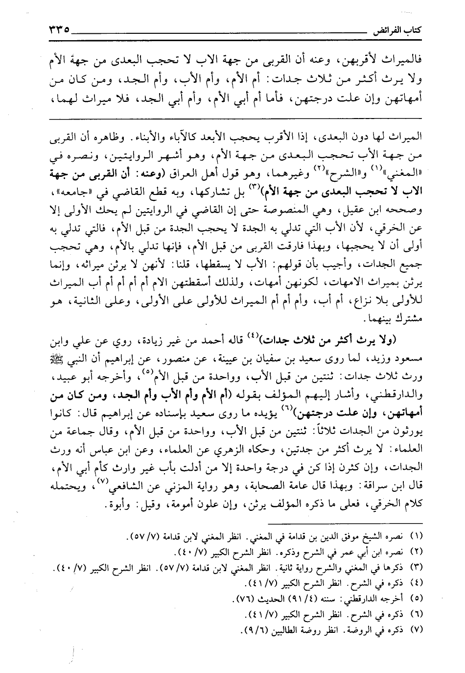 (وَلَا يَرِثُ أَكْثَرُ مِنْ ثَلَاثِ جَدَّاتٍ) قَالَهُ أَحْمَدُ فِي غَيْرِ زِيَادَةٍ، رُوِيَ عَنْ عَلِيٍّ، وَابْنِ مَسْعُودٍ، وَزَيْدٍ، لِمَا رَوَى سَعِيدٌ عَنْ سُفْيَانَ بْنِ عُيَيْنَةَ عَنْ مَنْصُورٍ عَنْ إِبْرَاهِيمَ «أَنَّ النَّبِيَّ - صَلَّى اللَّهُ عَلَيْهِ وَسَلَّمَ - وَرَّثَ ثَلَاثَ جَدَّاتٍ: ثِنْتَيْنِ مِنْ قِبَلِ الْأَبِ، وَوَاحِدَةً مِنْ قِبَلِ الْأُمِّ» وَأَخْرَجَهُ أَبُو عُبَيْدٍ وَالدَّارَقُطْنِيُّ، وَأَشَارَ إِلَيْهِمُ الْمُؤَلِّفُ بِقَوْلِهِ: (أُمُّ الْأُمِّ، وَأُمُّ الْأَبِ، وَأُمُّ الْجَدِّ، وَمَنْ كَانَ مِنْ أُمَّهَاتِهِنَّ، وَإِنْ عَلَتْ دَرَجَتُهُنَّ) يُؤَيِّدُهُ مَا رَوَى سَعِيدٌ بِإِسْنَادِهِ عَنْ إِبْرَاهِيمَ، قَالَ: كَانُوا يُوَرِّثُونَ مِنَ الْجَدَّاتِ ثَلَاثًا: ثِنْتَيْنِ مِنْ قِبَلِ الْأَبِ، وَوَاحِدَةٌ مِنْ قِبَلِ الْأُمِّ، وَقَالَ جَمَاعَةٌ مِنَ الْعُلَمَاءِ: لَا يَرِثُ أَكْثَرُ مِنْ جَدَّتَيْنِ، وَحَكَاهُ الزُّهْرِيُّ عَنِ الْعُلَمَاءِ، وَعَنِ ابْنِ عَبَّاسٍ: أَنَّهُ وَرَّثَ الْجَدَّاتِ وَإِنْ كَثُرْنَ، إِذَا كُنَّ فِي دَرَجَةٍ وَاحِدَةٍ، إِلَّا مَنْ أَدْلَتْ بِأَبٍ غَيْرِ وَارِثٍ كَأُمِّ أَبِي الْأُمِّ، قَالَ ابْنُ سُرَاقَةَ: وَبِهَذَا قَالَ عَامَّةُ الصَّحَابَةِ، وَهُوَ رِوَايَةُ الْمُزَنِيِّ عَنِ الشَّافِعِيِّ، وَيَحْتَمِلُهُ كَلَامُ الْخِرَقِيِّ، فَعَلَى مَا ذَكَرَهُ الْمُؤَلِّفُ يَرِثْنَ، وَإِنْ عَلَوْنَ أُمُومَةً، وَقِيلَ: وَأُبُوَّةً.