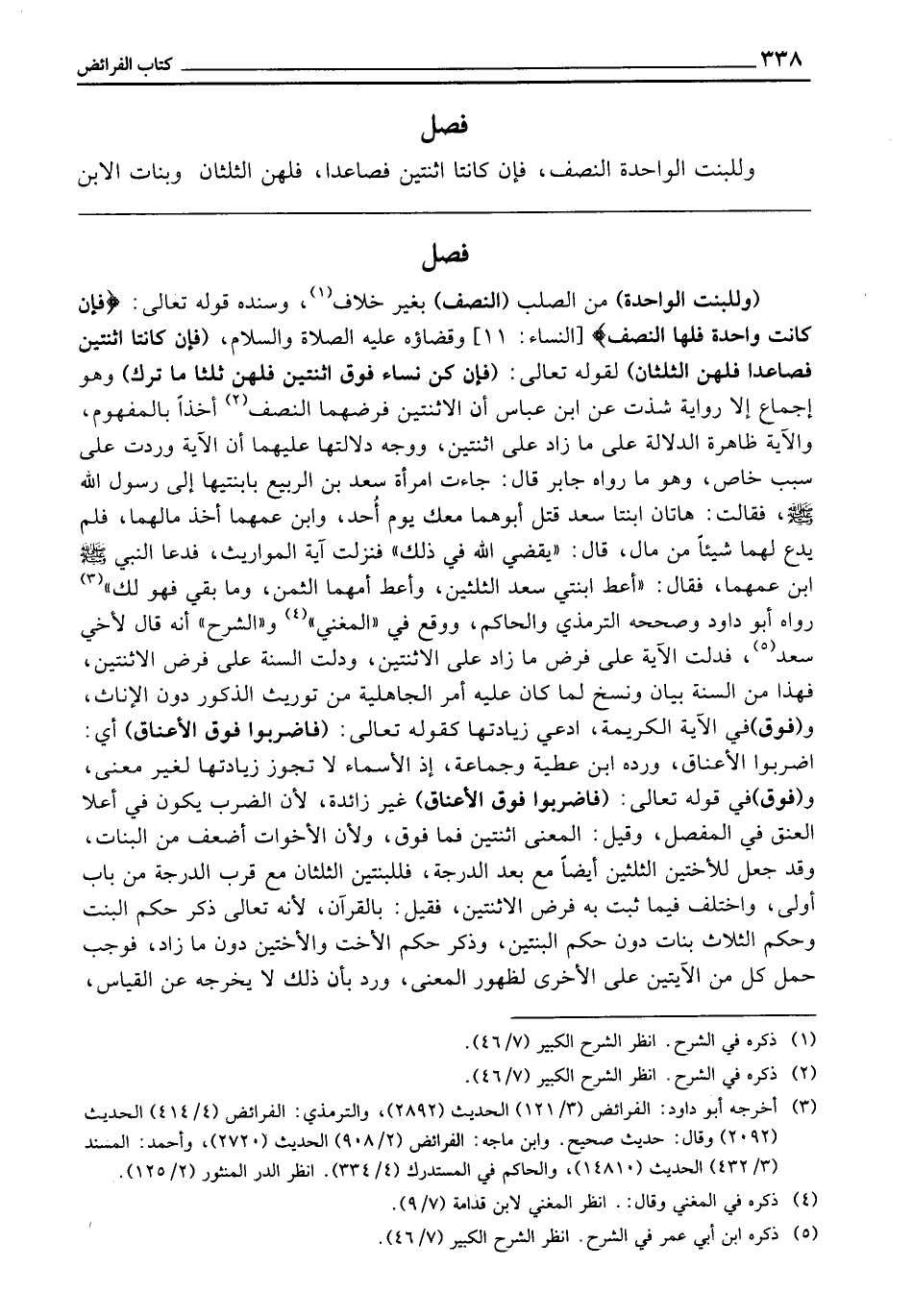 فَصْلٌ (وَلِلْبِنْتِ الْوَاحِدَةِ) مِنَ الصُّلْبِ (النِّصْفُ) بِغَيْرِ خِلَافٍ، وَسَنَدُهُ قَوْله تَعَالَى: {وَإِنْ كَانَتْ وَاحِدَةً فَلَهَا النِّصْفُ} [النساء: 11] وَقَضَاؤُهُ - عَلَيْهِ الصَّلَاةُ وَالسَّلَامُ -: (فَإِنْ كَانَتَا اثْنَتَيْنِ فَصَاعِدًا فَلَهُنَّ الثُّلُثَانِ) لِقَوْلِهِ تَعَالَى: {فَإِنْ كُنَّ نِسَاءً فَوْقَ اثْنَتَيْنِ فَلَهُنَّ ثُلُثَا مَا تَرَكَ} [النساء: 11] وَهُوَ إِجْمَاعٌ إِلَّا رِوَايَةً شَذَّتْ عَنِ ابْنِ عَبَّاسٍ: أَنَّ الِاثْنَتَيْنِ فَرْضُهُمَا النِّصْفُ أَخْذًا بِالْمَفْهُومِ، وَالْآيَةُ ظَاهِرَةُ الدَّلَالَةِ عَلَى مَا زَادَ عَلَى اثْنَتَيْنِ، وَوَجْهُ دَلَالَتِهَا عَلَيْهِمَا أَنَّ الْآيَةَ وَرَدَتْ عَلَى سَبَبٍ خَاصٍّ، وَهُوَ مَا رَوَاهُ جَابِرٌ، قَالَ: «جَاءَتِ امْرَأَةُ سَعْدِ بْنِ الرَّبِيعِ بِابْنَتَيْهَا إِلَى رَسُولِ اللَّهِ - صَلَّى اللَّهُ عَلَيْهِ وَسَلَّمَ -، فَقَالَتْ: هَاتَانِ ابْنَتَا سَعْدٍ، قُتِلَ أَبُوهُمَا مَعَكَ يَوْمَ أُحُدٍ، وَابْنُ عَمِّهِمَا أَخَذَ مَالَهُمَا، فَلَمْ يَدَعْ لَهُمَا شَيْئًا مِنْ مَالٍ، قَالَ: " يَقْضِي اللَّهُ فِي ذَلِكَ "، فَنَزَلَتْ آيَةُ الْمَوَارِيثِ، فَدَعَا النَّبِيُّ - صَلَّى اللَّهُ عَلَيْهِ وَسَلَّمَ - ابْنَ عَمِّهِمَا، فَقَالَ: أَعْطِ ابْنَتَيْ سَعْدٍ الثُّلُثَيْنِ، وَأَعْطِ أُمَّهُمَا الثُّمُنَ، وَمَا بَقِيَ فَهُوَ لَكَ» . رَوَاهُ أَبُو دَاوُدَ وَصَحَّحَهُ التِّرْمِذِيُّ، وَالْحَاكِمُ، وَوَقَعَ فِي " الْمُغْنِي "، وَ " الشَّرْحِ " أَنَّهُ قَالَ لِأَخِي سَعْدٍ، فَدَلَّتِ الْآيَةُ عَلَى فَرْضِ مَا زَادَ عَلَى الِاثْنَتَيْنِ، وَدَلَّتِ السُّنَّةُ عَلَى فَرْضِ الِاثْنَتَيْنِ، فَهَذَا مِنَ السُّنَّةِ بَيَانٌ وَنَسْخٌ لِمَا كَانَ عَلَيْهِ أَمْرُ الْجَاهِلِيَّةِ مِنْ تَوْرِيثِ الذُّكُورِ دُونَ الْإِنَاثِ، وَ {فَوْقَ} [النساء: 11] فِي الْآيَةِ الْكَرِيمَةِ، ادُّعِيَ زِيَادَتُهَا، كَقَوْلِهِ تَعَالَى: {فَاضْرِبُوا فَوْقَ الأَعْنَاقِ} [الأنفال: 12] أَيْ: اضْرِبُوا الْأَعْنَاقَ، وَرَدَّهُ ابْنُ عَطِيَّةَ وَجَمَاعَةٌ، إِذِ الْأَسْمَاءُ لَا تَجُوزُ زِيَادَتُهَا لِغَيْرِ مَعْنًى، وَ (فَوْقَ) فِي قَوْله تَعَالَى: {فَاضْرِبُوا فَوْقَ الأَعْنَاقِ} [الأنفال: 12] غَيْرُ زَائِدَةٍ؛ لِأَنَّ الضَّرْبَ يَكُونُ فِي أَعْلَى الْعُنُقِ فِي الْمَفْصِلِ، وَقِيلَ: الْمَعْنَى اثْنَتَيْنِ فَمَا فَوْقَ، وَلِأَنَّ الْأَخَوَاتِ أَضْعَفُ مِنَ الْبَنَاتِ، وَقَدْ جَعَلَ لِلْأُخْتَيْنِ الثُّلُثَيْنِ أَيْضًا مَعَ بُعْدِ الدَّرَجَةِ، فَلِلْبِنْتَيْنِ الثُّلُثَانِ مَعَ قُرْبِ الدَّرَجَةِ مِنْ بَابِ أَوْلَى، وَاخْتُلِفَ فِيمَا ثَبَتَ بِهِ فَرْضُ الِاثْنَتَيْنِ، فَقِيلَ: بِالْقُرْآنِ؛ لِأَنَّهُ تَعَالَى ذَكَرَ حُكْمَ الْبِنْتِ وَحُكْمَ الثَّلَاثِ بَنَاتٍ دُونَ حُكْمِ الْبِنْتَيْنِ، وَذَكَرَ حُكْمَ الْأُخْتِ وَالْأُخْتَيْنِ دُونَ مَا زَادَ، فَوَجَبَ حَمْلُ كُلٍّ مِنَ الْآيَتَيْنِ عَلَى الْأُخْرَى لِظُهُورِ الْمَعْنَى، وَرُدَّ بِأَنَّ ذَلِكَ لَا يُخْرِجُهُ عَنِ الْقِيَاسِ،