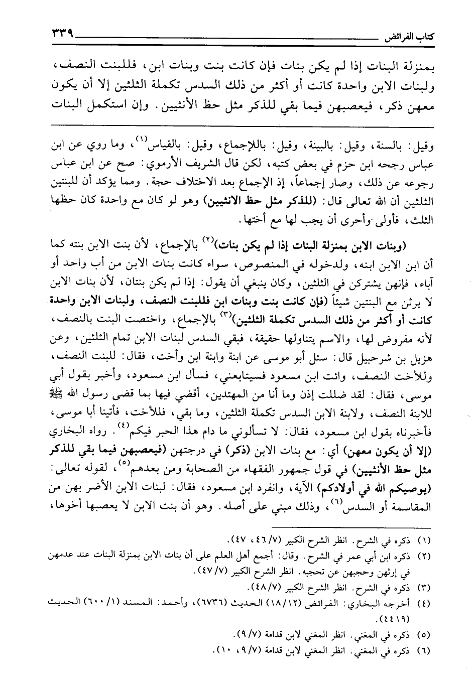 (وَبَنَاتُ الِابْنِ بِمَنْزِلَةِ الْبَنَاتِ إِذَا لَمْ يَكُنْ بَنَاتٌ) بِالْإِجْمَاعِ لِأَنَّ بِنْتَ الِابْنِ بِنْتُهُ، كَمَا أَنَّ ابْنَ الِابْنِ ابْنُهُ، وَلِدُخُولِهِ فِي الْمَنْصُوصِ، سَوَاءً كَانَتْ بَنَاتُ الِابْنِ مِنْ أَبٍ وَاحِدٍ أَوْ آبَاءٍ، فَإِنَّهُنَّ يَشْتَرِكْنَ فِي الثُّلُثَيْنِ، وَكَانَ يَنْبَغِي أَنْ يَقُولَ: إِذَا لَمْ يَكُنْ بِنْتَانِ؛ لِأَنَّ بَنَاتَ الِابْنِ لَا يَرِثْنَ مَعَ الْبِنْتَيْنِ شَيْئًا، (فَإِنْ كَانَتْ بِنْتٌ وَبَنَاتُ ابْنٍ، فَلِلْبِنْتِ النِّصْفُ، وَلِبَنَاتِ الِابْنِ وَاحِدَةً كَانَتْ أَوْ أَكْثَرَ مِنْ ذَلِكَ السُّدُسُ تَكْمِلَةَ الثُّلُثَيْنِ) ، بِالْإِجْمَاعِ، وَاخْتَصَّتِ الْبِنْتُ بِالنِّصْفِ؛ لِأَنَّهُ مَفْرُوضٌ لَهَا، وَالِاسْمُ يَتَنَاوَلُهَا حَقِيقَةً فَبَقِيَ السُّدُسُ لِبَنَاتِ الِابْنِ تَمَامَ الثُّلُثَيْنِ وَعَنْ هُزَيْلِ بْنِ شُرَحْبِيلَ، قَالَ: «سُئِلَ أَبُو مُوسَى عَنِ ابْنَةٍ، وَابْنَةِ ابْنٍ، وَأُخْتٍ، فَقَالَ: لِلْبِنْتِ النِّصْفُ، وَلِلْأُخْتِ النِّصْفُ، وَائْتِ ابْنَ مَسْعُودٍ فَسَيُتَابِعُنِي، فَسَأَلَ ابْنَ مَسْعُودٍ، وَأُخْبِرَ بِقَوْلِ أَبِي مُوسَى، فَقَالَ: لَقَدْ ضَلَلْتُ إِذَنْ، وَمَا أَنَا مِنَ الْمُهْتَدِينَ، أَقْضِي فِيهَا بِمَا قَضَى رَسُولُ اللَّهِ - صَلَّى اللَّهُ عَلَيْهِ وَسَلَّمَ - لِلِابْنَةِ النِّصْفُ، وَلِابْنَةِ الِابْنِ السُّدُسُ تَكْمِلَةَ الثُّلُثَيْنِ، وَمَا بَقِيَ، فَلِلْأُخْتِ، فَأَتَيْنَا أَبَا مُوسَى، فَأَخْبَرْنَاهُ بِقَوْلِ ابْنِ مَسْعُودٍ، فَقَالَ: لَا تَسْأَلُونِي مَا دَامَ هَذَا الْحَبْرُ فِيكُمْ» ، رَوَاهُ الْبُخَارِيُّ (إِلَّا أَنْ يَكُونَ مَعَهُنَّ) أَيْ: مَعَ بَنَاتِ الِابْنِ (ذَكَرٌ) فِي دَرَجَتِهِنَّ (فَيُعَصِّبُهُنَّ فِيمَا بَقِيَ لِلذَّكَرِ مِثْلُ حَظِّ الْأُنْثَيَيْنِ) فِي قَوْلِ جُمْهُورِ الْفُقَهَاءِ مِنَ الصَّحَابَةِ، وَمَنْ بَعْدَهُمْ لِقَوْلِهِ تَعَالَى: {يُوصِيكُمُ اللَّهُ فِي أَوْلادِكُمْ} [النساء: 11] الْآيَةَ، وَانْفَرَدَ ابْنُ مَسْعُودٍ، فَقَالَ: لِبَنَاتِ الِابْنِ الْأَضَرُّ بِهِنَّ مِنَ الْمُقَاسَمَةِ أَوِ السُّدُسِ، وَذَلِكَ مَبْنِيٌّ عَلَى أَصْلِهِ، وَهُوَ أَنَّ بِنْتَ الِابْنِ لَا يُعَصِّبُهَا أَخُوهَا،