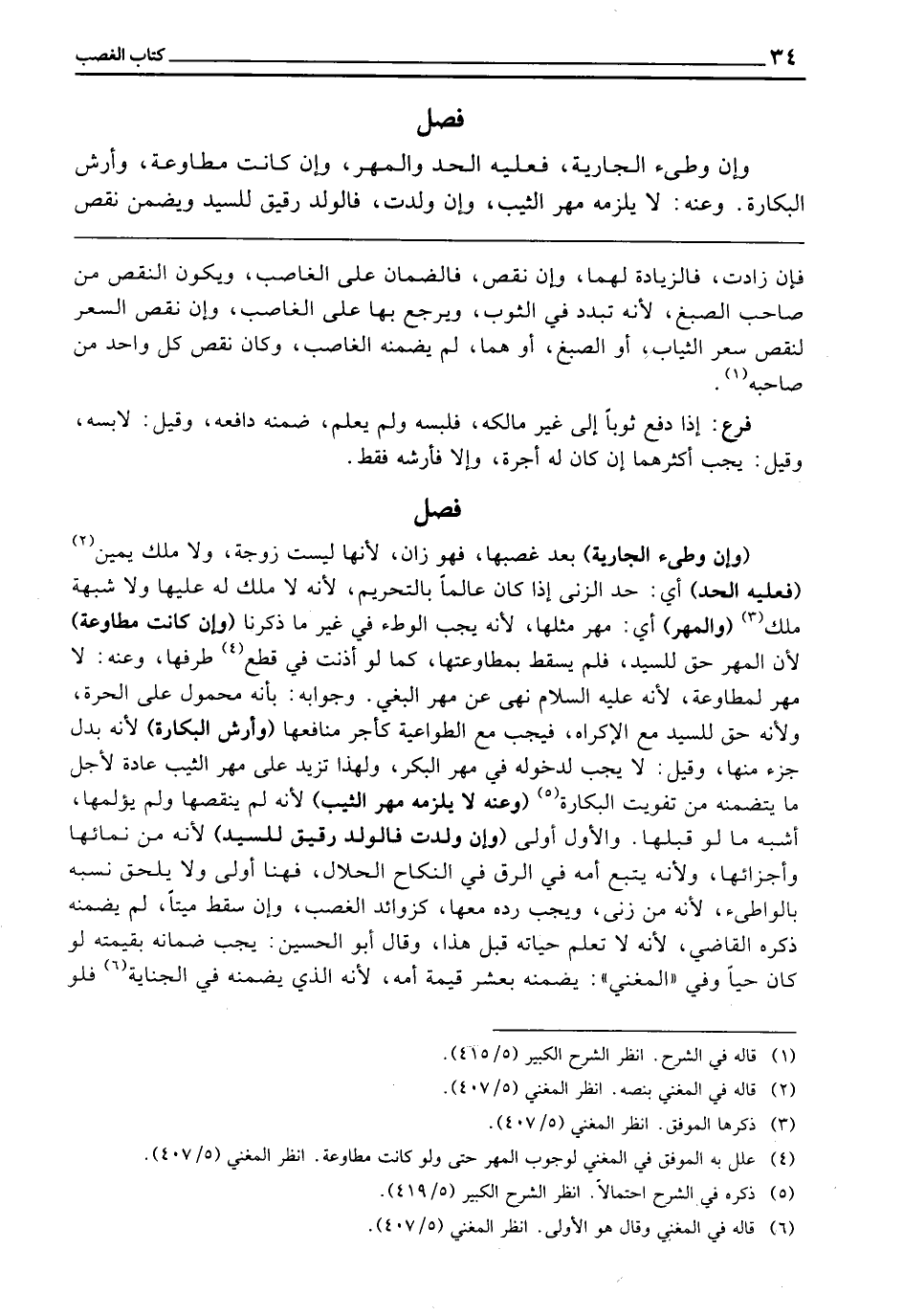 فَصْلٌ (وَإِنْ وَطِئَ الْجَارِيَةَ) بَعْدَ غَصْبِهَا فَهُوَ زَانٍ؛ لِأَنَّهَا لَيْسَتْ زَوْجَةً، وَلَا مِلْكَ يَمِينٍ (فَعَلَيْهِ الْحَدُّ) أَيْ: حَدُّ الزِّنَى، إِذَا كَانَ عَالِمًا بِالتَّحْرِيمِ؛ لِأَنَّهُ لَا مِلْكَ لَهُ عَلَيْهَا، وَلَا شُبْهَةَ مِلْكٍ (وَالْمَهْرُ) أَيْ: مَهْرُ مِثْلِهَا؛ لِأَنَّهُ يَجِبُ بِالْوَطْءِ فِي غَيْرِ مَا ذَكَرْنَا (وَإِنْ كَانَتْ مُطَاوِعَةً) لِأَنَّ الْمَهْرَ حَقٌّ لِلسَّيِّدِ، فَلَمْ يَسْقُطْ بِمُطَاوَعَتِهَا كَمَا لَوْ أَذِنَتْ فِي قَطْعِ طَرَفِهَا، وَعَنْهُ: لَا مَهْرَ لِمُطَاوِعَةٍ؛ لِأَنَّهُ - عَلَيْهِ السَّلَامُ - «نَهَى عَنْ مَهْرِ الْبَغِيِّ» ، وَجَوَابُهُ: بِأَنَّهُ مَحْمُولٌ عَلَى الْحُرَّةِ، وَلِأَنَّهُ حَقٌّ لِلسَّيِّدِ مَعَ الْإِكْرَاهِ، فَيَجِبُ مَعَ الطَّوَاعِيَةِ كَأَجْرِ مَنَافِعِهَا (وَأَرْشُ الْبَكَارَةِ) لِأَنَّهُ بَدَلُ جُزْءٍ مِنْهَا، وَقِيلَ: لَا يَجِبُ لِدُخُولِهِ فِي مَهْرِ الْبِكْرِ، وَلِهَذَا تَزِيدُ عَلَى مَهْرِ الثَّيِّبِ عَادَةً لِأَجْلِ مَا يَتَضَمَّنُهُ مِنْ تَفْوِيتِ الْبَكَارَةِ (وَعَنْهُ: لَا يَلْزَمُهُ مَهْرُ الثَّيِّبِ) لِأَنَّهُ لَمْ يَنْقُصْهَا وَلَمْ يُؤْلِمْهَا أَشْبَهَ مَا لَوْ قَبَّلَهَا، وَالْأَوَّلُ أَوْلَى (وَإِنْ وَلَدَتِ فَالْوَلَدُ رَقِيقٌ لِلسَّيِّدِ) لِأَنَّهُ مِنْ نَمَائِهَا وَأَجْزَائِهَا، وَلِأَنَّهُ يَتْبَعُ أُمَّهُ فِي الرِّقِّ فِي النِّكَاحِ الْحَلَالِ فَهُنَا أَوْلَى، وَلَا يَلْحَقُ نَسَبُهُ بِالْوَاطِئِ؛ لِأَنَّهُ مِنْ زِنًى، وَيَجِبُ رَدُّهُ مَعَهَا كَزَوَائِدِ الْغَصْبِ، وَإِنْ سَقَطَ مَيِّتًا لَمْ يَضْمَنْهُ، ذَكَرَهُ الْقَاضِي؛ لِأَنَّهُ لَا تُعْلَمُ حَيَاتُهُ قَبْلَ هَذَا، وَقَالَ أَبُو الْحُسَيْنِ: يَجِبُ بِقِيمَتِهِ لَوْ كَانَ حَيًّا، وَفِي " الْمُغْنِي " يَضْمَنُهُ بِعُشْرِ قِيمَةِ أُمِّهِ؛ لِأَنَّهُ الَّذِي يَضْمَنُهُ فِي الْجِنَايَةِ، فَلَوْ