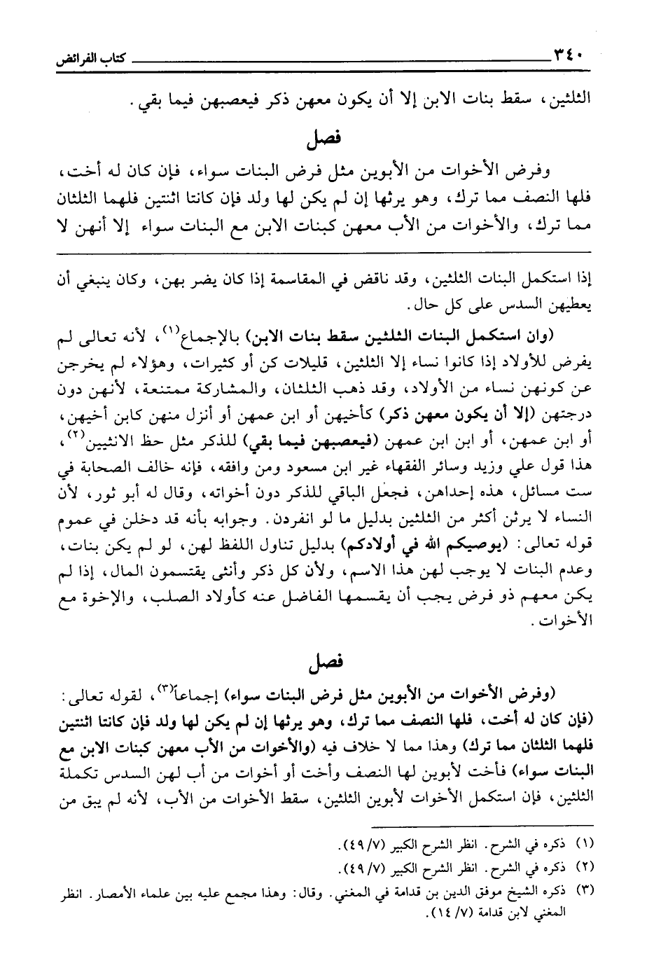 فَصْلٌ (وَفَرْضُ الْأَخَوَاتِ مِنَ الْأَبَوَيْنِ مِثْلُ فَرْضِ الْبَنَاتِ سَوَاءً) إِجْمَاعًا؛ لِقَوْلِهِ تَعَالَى: {إِنِ امْرُؤٌ هَلَكَ لَيْسَ لَهُ وَلَدٌ وَلَهُ أُخْتٌ فَلَهَا نِصْفُ مَا تَرَكَ وَهُوَ يَرِثُهَا إِنْ لَمْ يَكُنْ لَهَا وَلَدٌ فَإِنْ كَانَتَا اثْنَتَيْنِ فَلَهُمَا الثُّلُثَانِ مِمَّا تَرَكَ} [النساء: 176] وَهَذَا مِمَّا لَا خِلَافَ فِيهِ (وَالْأَخَوَاتُ مِنَ الْأَبِ مَعَهُنَّ كَبَنَاتِ الِابْنِ مَعَ الْبَنَاتِ سَوَاءً) فَأُخْتٌ لِأَبَوَيْنِ لَهَا النِّصْفُ، وَأُخْتٌ أَوْ أَخَوَاتٌ مِنْ أَبٍ لَهُنَّ السُّدُسُ تَكْمِلَةَ الثُّلُثَيْنِ، فَإِنِ اسْتَكْمَلَ الْأَخَوَاتُ لِأَبَوَيْنِ الثُّلُثَيْنِ، سَقَطَ الْأَخَوَاتُ مِنَ الْأَبِ؛ لِأَنَّهُ لَمْ يَبْقَ مِنْ