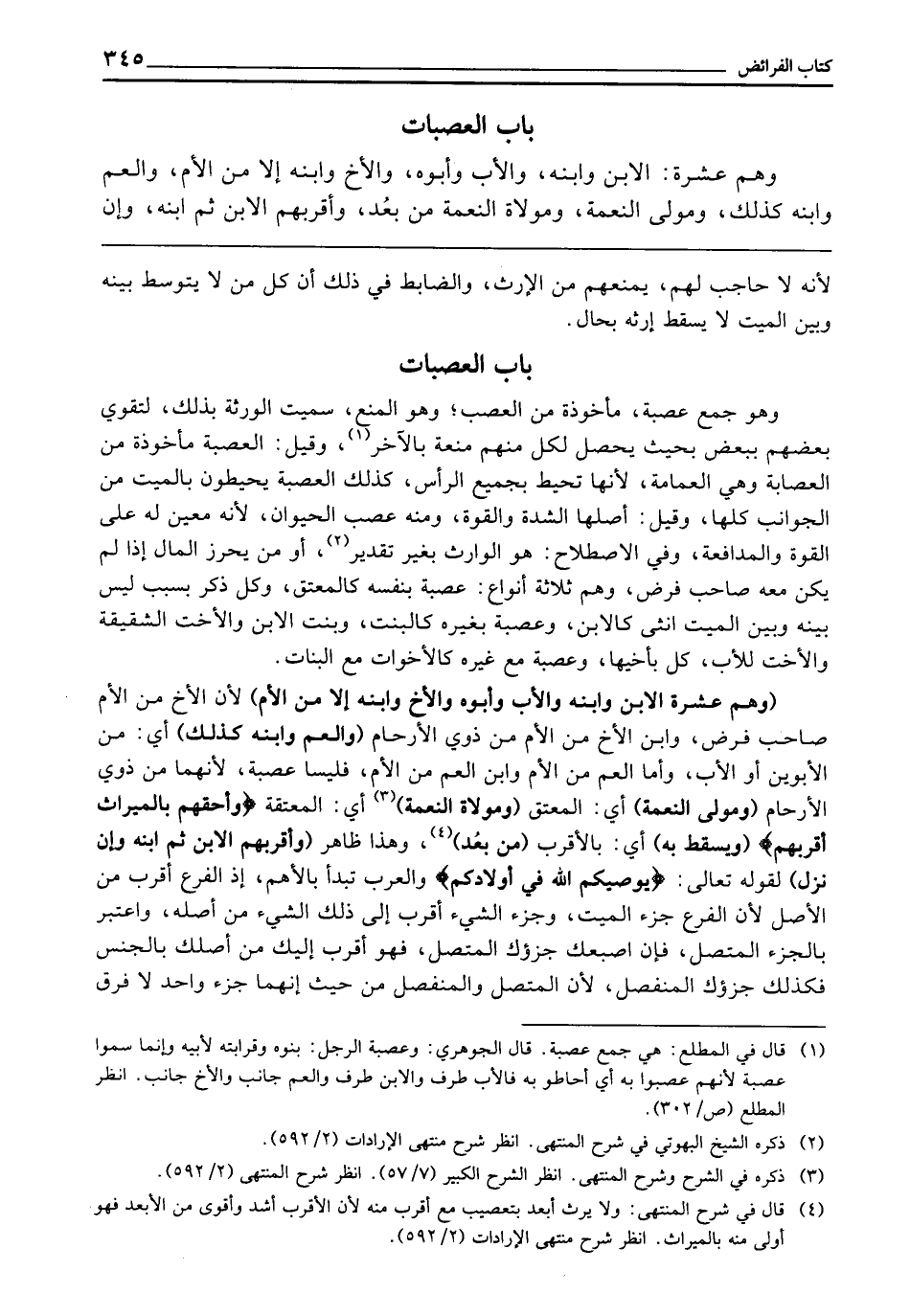 بَابُ الْعَصَبَاتِ وَهُمْ عَشَرَةٌ: الِابْنُ، وَابْنُهُ، وَالْأَبُ، وَأَبُوهُ، وَالْأَخُ، وَابْنُهُ إِلَّا مِنَ الْأُمِّ، وَالْعَمُّ، وَابْنُهُ كَذَلِكَ، وَمَوْلَى النِّعْمَةِ، وَمَوْلَاةُ النِّعْمَةِ، وَأَحَقُّهُمْ بِالْمِيرَاثِ أَقْرَبُهُمْ، وَيَسْقُطُ بِهِ مَنْ بَعُدَ، وَأَقْرَبُهُمُ الِابْنُ ثُمَّ ابْنُهُ، وَإِنْ