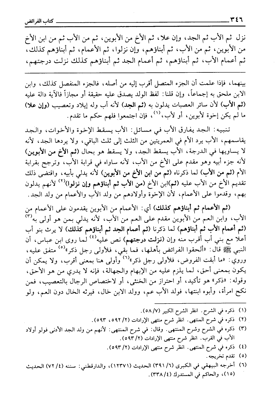 (ثُمَّ الْأَعْمَامُ، ثُمَّ أَبْنَاؤُهُمْ كَذَلِكَ) أَيِ الْأَعْمَامُ مِنَ الْأَبَوَيْنِ يُقَدَّمُونَ عَلَى الْأَعْمَامِ مِنَ الْأَبِ، وَابْنُ الْعَمِّ مِنَ الْأَبَوَيْنِ مُقَدَّمٌ عَلَى الْعَمِّ مِنَ الْأَبِ؛ لِأَنَّهُ يُدْلِي بِمَنْ هُوَ أَوْلَى بِهِ (ثُمَّ أَعْمَامُ الْأَبِ، ثُمَّ أَبْنَاؤُهُمْ) لِمَا ذَكَرْنَا (ثُمَّ أَعْمَامُ الْجَدِّ، ثُمَّ أَبْنَاؤُهُمْ كَذَلِكَ) لَا يَرِثُ بَنُو أَبٍ أَعْلَى مَعَ بَنِي أَبٍ أَقْرَبَ مِنْهُ، وَإِنْ (نَزَلَتْ دَرَجَتُهُمْ) نُصَّ عَلَيْهِ لِمَا رَوَى ابْنُ عَبَّاسٍ، أَنَّ النَّبِيَّ - صَلَّى اللَّهُ عَلَيْهِ وَسَلَّمَ - قَالَ: «أَلْحِقُوا الْفَرَائِضَ بِأَهْلِهَا، فَمَا بَقِيَ، فَلِأَوْلَى رَجُلٍ ذَكَرٍ» مُتَّفَقٌ عَلَيْهِ، وَرُوِيَ: «مَا أَبْقَتِ الْفُرُوضُ، فَلِأَوْلَى رَجُلٍ ذَكَرٍ» وَأَوْلَى هُنَا بِمَعْنَى أَقْرَبَ، وَلَا يُمْكِنُ أَنْ يَكُونَ بِمَعْنَى أَحَقَّ، لِمَا يَلْزَمُ عَلَيْهِ مِنَ الْإِبْهَامِ وَالْجَهَالَةِ، فَإِنَّهُ لَا يَدْرِي مَنْ هُوَ الْأَحَقُّ، وَقَوْلُهُ: " ذَكَرٍ "، هُوَ تَأْكِيدٌ أَوِ احْتِرَازٌ مِنَ الْخُنْثَى، أَوْ لِاخْتِصَاصِ الرِّجَالِ بِالتَّعْصِيبِ، فَمَنْ نَكَحَ امْرَأَةً، وَأَبُوهُ ابْنَتَهَا، فَوَلَدُ الْأَبِ عَمٌّ، وَوَلَدُ الِابْنِ خَالٌ، فَيَرِثُهُ الْخَالُ دُونَ الْعَمِّ، وَلَوْ