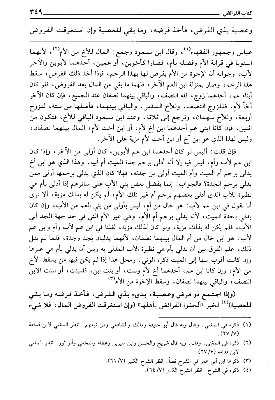 ـــــــــــــــــــــــــــــQعَبَّاسٍ، وَجُمْهُورِ الْفُقَهَاءِ، وَقَالَ ابْنُ مَسْعُودٍ، وَجَمْعٌ: الْمَالُ لِلْأَخِ مِنَ الْأُمِّ؛ لِأَنَّهُمَا اسْتَوَيَا فِي قَرَابَةِ الْأُمِّ، وَفَضَلَهُ بِأُمٍّ، فَصَارَا كَأَخَوَيْنِ، أَوْ عَمَّيْنِ، أَحَدُهُمَا لِأَبَوَيْنِ، وَالْآخَرُ لِأَبٍ، وَجَوَابُهُ: أَنَّ الْإِخْوَةَ مِنَ الْأُمِّ يُفْرَضُ لَهَا بِهَذَا الرَّحِمِ، فَإِذَا أَخَذَ ذَلِكَ الْفَرْضَ، سَقَطَ هَذَا الرَّحِمُ، وَصَارَ بِمَنْزِلَةِ ابْنِ الْعَمِّ الْآخَرِ، فَلَهُمَا مَا بَقِيَ مِنَ الْمَالِ بَعْدَ الْفُرُوضِ، فَلَوْ كَانَ أَبْنَاءُ عَمٍّ، أَحَدُهُمَا زَوْجٌ فَلَهُ النِّصْفُ، وَالْبَاقِي بَيْنَهُمَا نِصْفَانِ عِنْدَ الْجَمِيعِ، فَإِنْ كَانَ الْآخَرُ أَخًا لِأُمٍّ، فَلِلزَّوْجِ النِّصْفُ، وَلِلْأَخِ السُّدُسُ، وَالْبَاقِي بَيْنَهُمَا، فَأَصْلُهَا مِنْ سِتَّةٍ، لِلزَّوْجِ أَرْبَعَةٌ، وَلِلْأَخِ سَهْمَانِ، وَتَرْجِعُ إِلَى ثَلَاثَةٍ، وَعِنْدَ ابْنِ مَسْعُودٍ الْبَاقِي لِلْأَخِ، فَتَكُونُ مِنِ اثْنَيْنِ، فَإِنْ كَانَا ابْنَيْ عَمِّ أَحَدُهُمَا ابْنُ أَخٍ لِأُمٍّ، أَوِ ابْنُ أُخْتٍ لِأُمٍّ، الْمَالُ بَيْنَهُمَا نِصْفَانِ، وَلَيْسَ لِهَذَا الَّذِي هُوَ ابْنُ أَخٍ، أَوِ ابْنُ أُخْتٍ لِأُمٍّ مَزِيَّةٌ عَلَى الْآخَرِ.