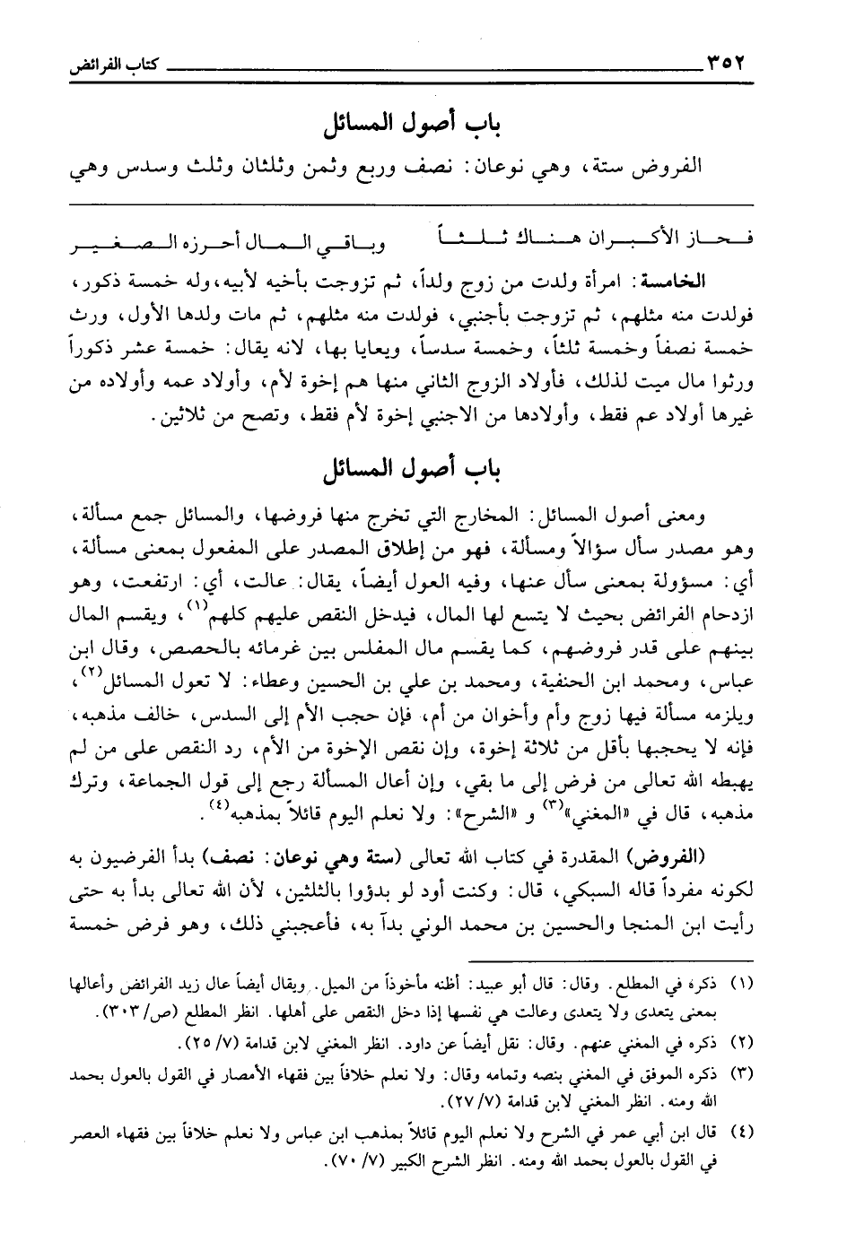 ِ وَمَعْنَى أُصُولِ الْمَسَائِلِ: الْمَخَارِجُ الَّتِي تَخْرُجُ مِنْهَا فُرُوضُهَا، وَالْمَسَائِلُ جَمْعُ مَسْأَلَةٍ، وَهُوَ مَصْدَرُ سَأَلَ سُؤَالًا وَمَسْأَلَةً، فَهُوَ مِنْ إِطْلَاقِ الْمَصْدَرِ عَلَى الْمَفْعُولِ بِمَعْنَى مَسْأَلَةٍ، أَيْ مَسْئُولَةٍ بِمَعْنَى سَأَلَ عَنْهَا، وَفِيهِ الْعَوْلُ أَيْضًا، يُقَالُ: عَالَتْ، أَيْ: ارْتَفَعَتْ، وَهُوَ ازْدِحَامُ الْفَرَائِضِ، بِحَيْثُ لَا يَتَّسِعُ لَهَا الْمَالُ، فَيَدْخُلُ النَّقْصُ عَلَيْهِمْ كُلِّهِمْ، وَيُقَسَّمُ الْمَالُ بَيْنَهُمْ عَلَى قَدْرِ فُرُوضِهِمْ، كَمَا يُقَسَّمُ مَالُ الْمُفْلِسِ بَيْنَ غُرَمَائِهِ بِالْحِصَصِ، وَقَالَ ابْنُ عَبَّاسٍ، وَمُحَمَّدُ ابْنُ الْحَنَفِيَّةِ، وَمُحَمَّدُ بْنُ عَلِيِّ بْنِ الْحُسَيْنِ، وَعَطَاءٌ: لَا تَعُولُ الْمَسَائِلُ، وَيَلْزَمُهُ مَسْأَلَةٌ فِيهَا زَوْجٌ وَأُمٌّ وَأَخَوَانِ مِنْ أُمٍّ، فَإِنْ حَجَبَ الْأُمَّ إِلَى السُّدُسِ، خَالَفَ مَذْهَبَهُ، فَإِنَّهُ لَا يَحْجُبُهَا بِأَقَلَّ مِنْ ثَلَاثَةِ إِخْوَةٍ، وَإِنْ نَقَّصَ الْإِخْوَةَ مِنَ الْأُمِّ، رَدَّ النَّقْصَ عَلَى مَنْ لَمْ يُهْبِطْهُ اللَّهُ تَعَالَى مِنْ فَرْضٍ إِلَى مَا بَقِيَ، وَإِنْ أَعَالَ الْمَسْأَلَةَ رَجَعَ إِلَى قَوْلِ الْجَمَاعَةِ، وَتَرَكَ مَذْهَبَهُ، قَالَ فِي " الْمُغْنِي "، وَ " الشَّرْحِ ": وَلَا نَعْلَمُ الْيَوْمَ قَائِلًا بِمَذْهَبِهِ.