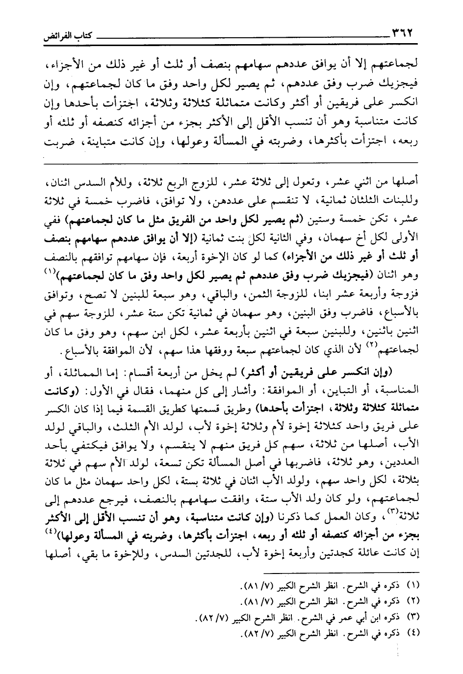 لِجَمَاعَتِهِمْ، إِلَّا أَنْ يُوَافِقَ عَدَدُهُمْ سِهَامَهُمْ بِنِصْفٍ أَوْ ثُلُثٍ أَوْ غَيْرِ ذَلِكَ مِنَ الْأَجْزَاءِ، فَيُجْزِيكَ ضَرْبٌ وَفْقَ عَدَدِهِمْ، ثُمَّ يَصِيرُ لِكُلِّ وَاحِدٍ وَفْقُ مَا كَانَ لِجَمَاعَتِهِمْ، وَإِنِ انْكَسَرَ عَلَى فَرِيقَيْنِ أو أَكْثَرَ، وَكَانَتْ مُتَمَاثِلَةً كَثَلَاثَةٍ وَثَلَاثَةٍ اجْتَزَأْتَ بِأَحَدِهَا، وَإِنْ كَانَتْ مُتَنَاسِبَةً، وَهُوَ أَنْ تَنْسُبَ الْأَقَلَّ إِلَى الْأَكْثَرِ بِجُزْءٍ مِنْ أَجْزَائِهِ كَنِصْفِهِ أَوْ ثُلُثِهِ أَوْ رُبُعِهِ، اجْتَزَأْتَ بِأَكْثَرِهَا، وَضَرَبْتَهُ فِي الْمَسْأَلَةِ وَعَوْلِهَا، وَإِنْ كَانَتْ مُتَبَايِنَةً، ضَرَبْتَ