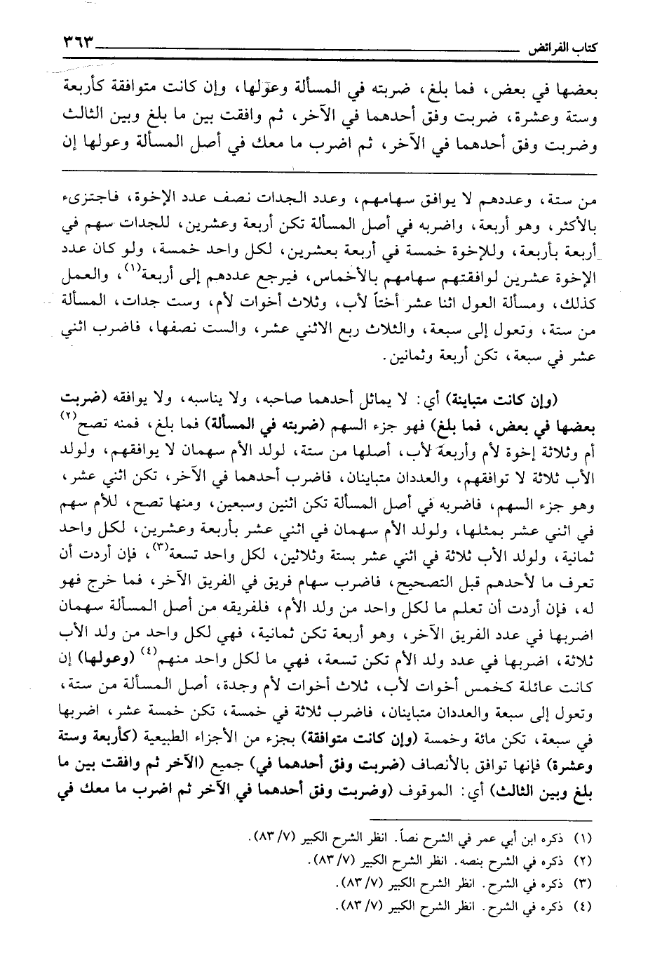 ـــــــــــــــــــــــــــــQمِنْ سِتَّةٍ، وَعَدَدُهُمْ لَا يُوَافِقُ سِهَامَهُمْ، وَعَدَدُ الْجَدَّاتِ نِصْفُ عَدَدِ الْإِخْوَةِ، فَاجْتَزِئْ بِالْأَكْثَرِ، وَهُوَ أَرْبَعَةٌ، وَاضْرِبْهُ فِي أَصْلِ الْمَسْأَلَةِ تَكُنْ أَرْبَعَةً وَعِشْرِينَ، لِلْجَدَّاتِ سَهْمٌ فِي أَرْبَعَةٍ بِأَرْبَعَةٍ، وَلِلْإِخْوَةِ خَمْسَةٌ فِي أَرْبَعَةٍ بِعِشْرِينَ، لِكُلِّ وَاحِدٍ خَمْسَةٌ، وَلَوْ كَانَ عَدَدُ الْإِخْوَةِ عِشْرِينَ لَوَافَقَتْهُمْ سِهَامُهُمْ بِالْأَخْمَاسِ، فَيَرْجِعُ عَدَدُهُمْ إِلَى أَرْبَعَةٍ، وَالْعَمَلُ كَذَلِكَ، وَمَسْأَلَةُ الْعَوْلِ اثْنَا عَشَرَ أُخْتًا لِأَبٍ، وَثَلَاثُ أَخَوَاتٍ لِأُمٍّ، وَسِتُّ جَدَّاتٍ، الْمَسْأَلَةُ مِنْ سِتَّةٍ، وَتَعُولُ إِلَى سَبْعَةٍ، وَالثَّلَاثُ رُبُعُ الِاثْنَيْ عَشَرَ، وَالسِّتُّ نِصْفُهَا، فَاضْرِبِ اثْنَيْ عَشَرَ فِي سَبْعَةٍ، تَكُنْ أَرْبَعَةً وَثَمَانِينَ.