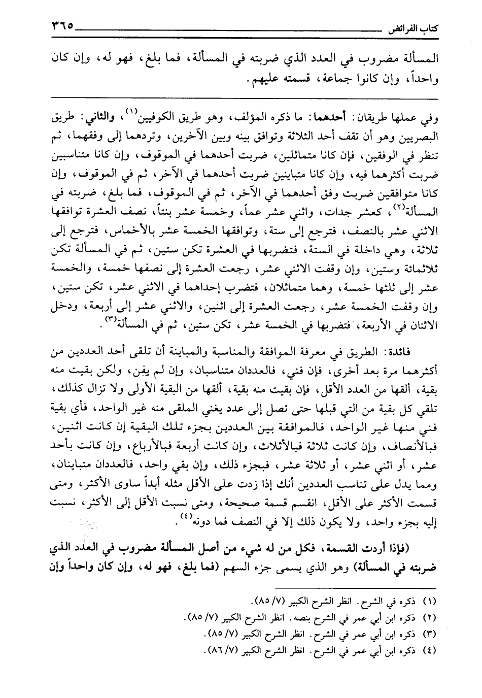 فَائِدَةٌ: الطَّرِيقُ فِي مَعْرِفَةِ الْمُوَافَقَةِ وَالْمُنَاسَبَةِ وَالْمُبَايَنَةِ أَنْ تُلْقِيَ أَحَدَ الْعَدَدَيْنِ مِنْ أَكْثَرِهِمَا مَرَّةً بَعْدَ أُخْرَى، فَإِنْ فَنِيَ، فَالْعَدَدَانِ مُتَنَاسِبَانِ، وَإِنْ لَمْ يَفْنَ، وَلَكِنْ بَقِيَتْ مِنْهُ بَقِيَّةٌ، أَلْقِهَا مِنَ الْعَدَدِ الْأَقَلِّ، فَإِنْ بَقِيَتْ مِنْهُ بَقِيَّةٌ، أَلْقِهَا مِنَ الْبَقِيَّةِ الْأُولَى، وَلَا تَزَالُ كَذَلِكَ تُلْقِي كُلَّ بَقِيَّةٍ مِنَ الَّتِي قَبْلَهَا، حَتَّى تَصِلَ إِلَى عَدَدٍ يُغْنِي الْمُلْقَى مِنْهُ غَيْرُ الْوَاحِدِ، فَأَيُّ بَقِيَّةِ فَنِيَ مِنْهَا غَيْرَ الْوَاحِدِ، فَالْمُوَافَقَةُ بَيْنَ الْعَدَدَيْنِ بِجُزْءِ تِلْكَ الْبَقِيَّةِ إِنْ كَانَتِ اثْنَيْنِ، فَبِالْأَنْصَافِ، وَإِنْ كَانَتْ ثَلَاثَةً فَبِالْأَثْلَاثِ، وَإِنْ كَانَتْ أَرْبَعَةً فَبِالْأَرْبَاعِ، وَإِنْ كَانَتْ بِأَحَدَ عَشَرَ أَوِ اثْنَيْ عَشَرَ أَوْ ثَلَاثَةَ عَشَرَ فَبِجُزْءِ ذَلِكَ، وَإِنْ بَقِيَ وَاحِدٌ، فَالْعَدَدَانِ مُتَبَايِنَانِ، وَمِمَّا يَدُلُّ عَلَى تَنَاسُبِ الْعَدَدَيْنِ أَنَّكَ إِذَا زِدْتَ عَلَى الْأَقَلِّ مِثْلَهُ أَبَدًا سَاوَى الْأَكْثَرَ، وَمَتَى قَسَمْتَ الْأَكْثَرَ عَلَى الْأَقَلِّ، انْقَسَمَ قِسْمَةً صَحِيحَةً، وَمَتَى نَسَبْتَ الْأَقَلَّ إِلَى الْأَكْثَرِ، نَسَبْتَ إِلَيْهِ بِجُزْءٍ وَاحِدٍ، وَلَا يَكُونُ ذَلِكَ إِلَّا فِي النِّصْفِ فَمَا دُونَهُ.