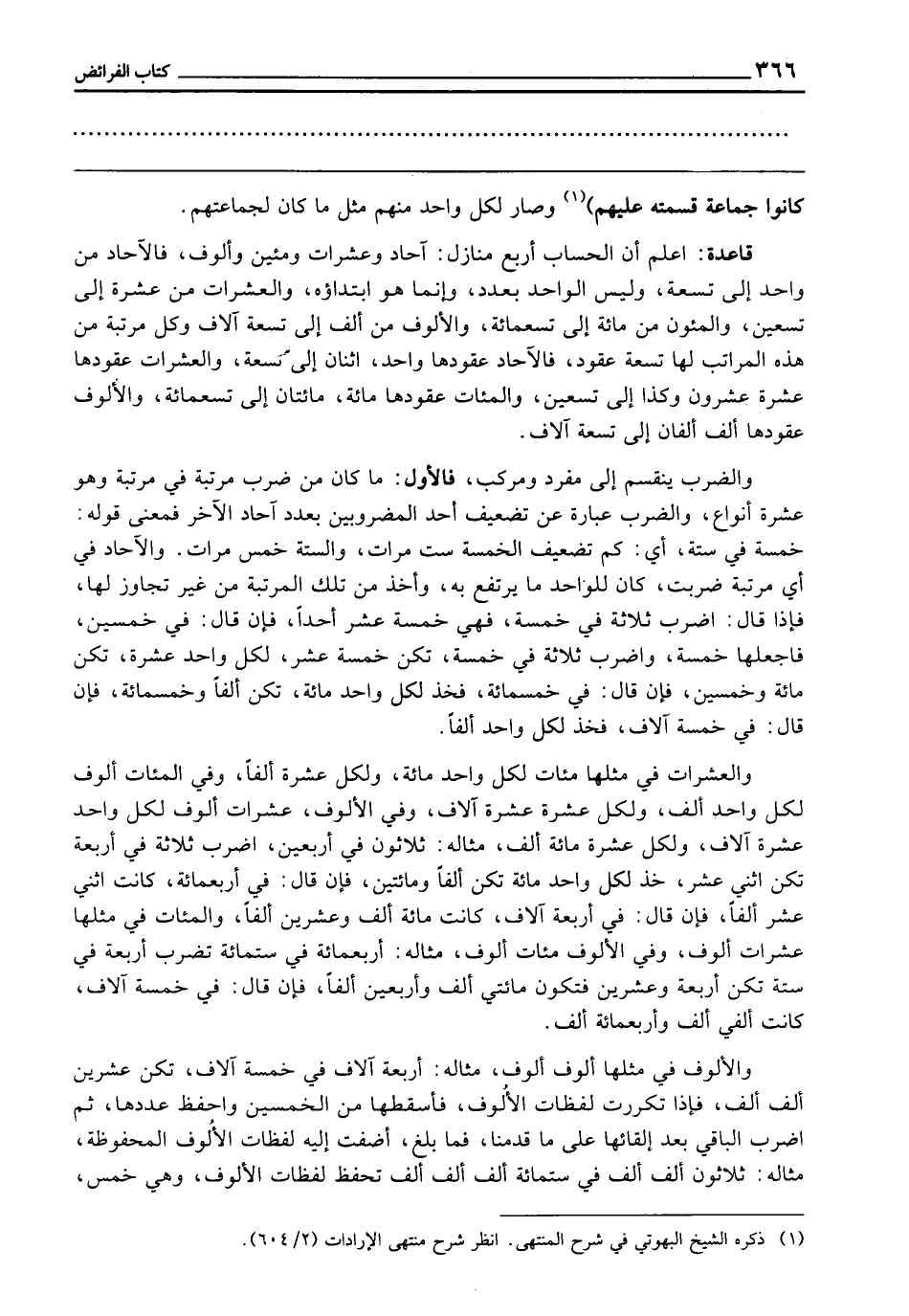 قَاعِدَةٌ: اعْلَمْ أَنَّ الْحِسَابَ أَرْبَعُ مَنَازِلَ: آحَادٌ، وَعَشَرَاتٌ، وَمِئِينَ، وَأُلُوفٌ، فَالْآحَادُ مِنْ وَاحِدٍ إِلَى تِسْعَةٍ، وَلَيْسَ الْوَاحِدُ بِعَدَدٍ، وَإِنَّمَا هُوَ ابْتِدَاؤُهُ، وَالْعَشَرَاتُ مِنْ عَشَرَةٍ إِلَى تِسْعِينَ، وَالْمِئُونَ مِنْ مِائَةٍ إِلَى تِسْعِمِائَةٍ، وَالْأُلُوفُ مِنْ أَلْفٍ إِلَى تِسْعَةِ آلَافٍ، وَكُلُّ مَرْتَبَةٍ مِنْ هَذِهِ الْمَرَاتِبِ لَهَا تِسْعَةُ عُقُودٍ، فَالْآحَادُ عُقُودُهَا وَاحِدٌ، اثْنَانِ إِلَى تِسْعَةٍ، وَالْعَشَرَاتُ عُقُودُهَا عَشَرَةٌ، عِشْرُونَ، وَكَذَا إِلَى تِسْعِينَ، وَالْمِئَاتُ عُقُودُهَا مِائَةٌ، مِائَتَانِ إِلَى تِسْعِمِائَةٍ، وَالْأُلُوفُ عُقُودُهَا أَلْفٌ أَلْفَانِ إِلَى تِسْعَةِ آلَافٍ.