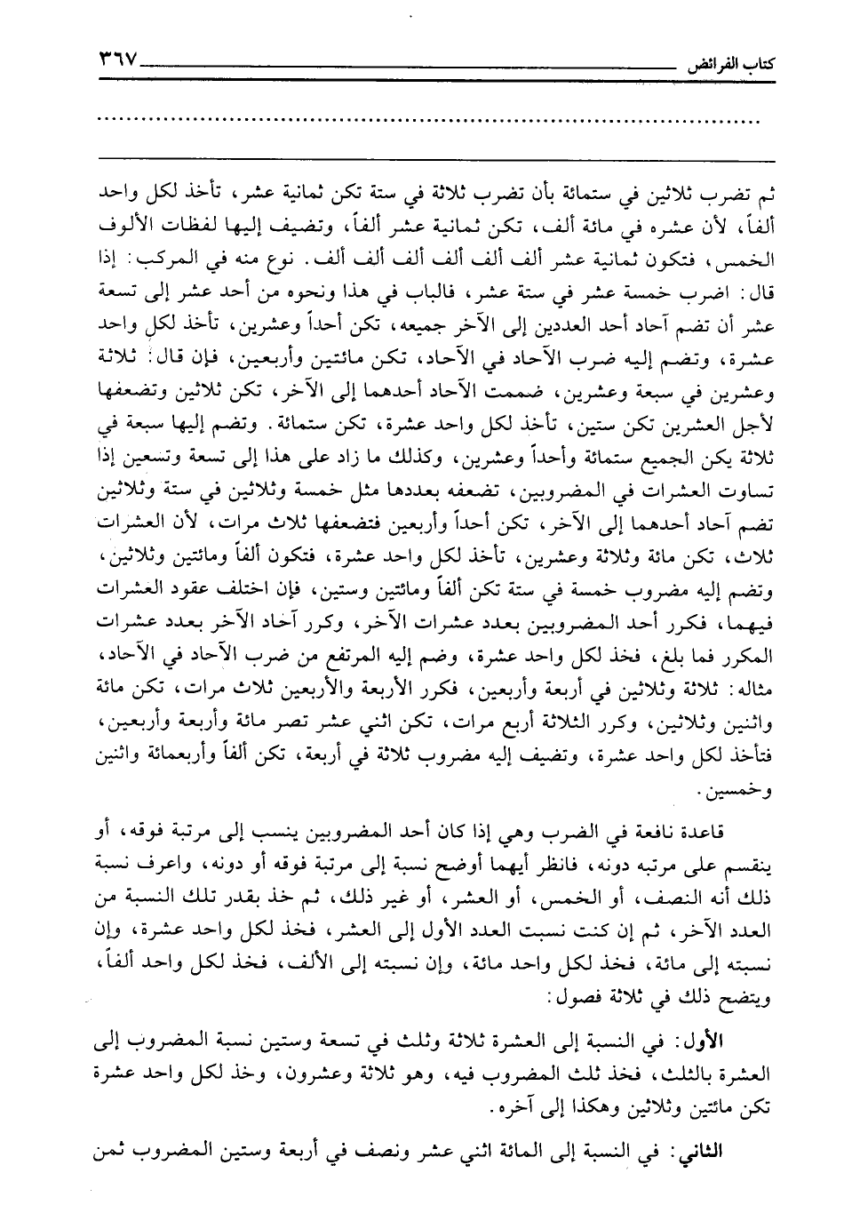 قَاعِدَةٌ نَافِعَةٌ فِي الضَّرْبِ: وَهِيَ إِذَا كَانَ أَحَدُ الْمَضْرُوبَيْنِ يُنْسَبُ إِلَى مَرْتَبَةٍ فَوْقَهُ، أَوْ يَنْقَسِمُ عَلَى مَرْتَبَةٍ دُونَهُ، فَانْظُرْ أَيَّهُمَا أَوْضَحُ نِسْبَةً إِلَى مَرْتَبَةٍ فَوْقَهُ أَوْ دُونَهُ، وَاعْرِفْ نِسْبَةَ ذَلِكَ أَنَّهُ النِّصْفُ، أَوِ الْخُمْسُ، أَوِ الْعُشْرُ، أَوْ غَيْرُ ذَلِكَ، ثُمَّ خُذْ بِقَدْرِ تِلْكَ النِّسْبَةِ مِنَ الْعَدَدِ الْآخَرِ، ثُمَّ إِنْ كُنْتَ نَسَبْتَ الْعَدَدَ الْأَوَّلَ إِلَى الْعُشْرِ، فَخُذْ لِكُلِّ وَاحِدٍ عَشَرَةً، وَإِنْ نَسَبْتَهُ إِلَى مِائَةٍ، فَخُذْ لِكُلِّ وَاحِدٍ مِائَةً، وَإِنْ نَسَبْتَهُ إِلَى الْأَلْفِ، فَخُذْ لِكُلِّ وَاحِدٍ أَلْفًا، وَيَتَّضِحُ ذَلِكَ فِي ثَلَاثَةِ فُصُولٍ: