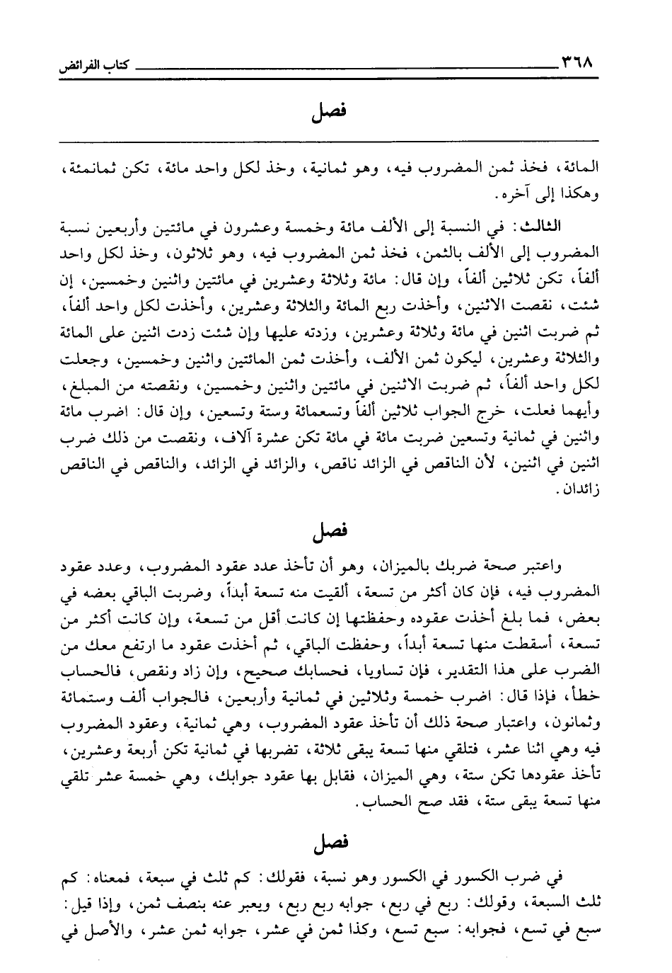 فَصْلٌ فِي ضَرْبِ الْكُسُورِ فِي الْكُسُورِ، وَهُوَ نِسْبَةٌ، فَقَوْلُكَ: كَمْ ثُلُثٌ فِي سَبْعَةٍ؛ فَمَعْنَاهُ: كَمْ ثُلُثُ السَّبْعَةِ؛ وَقَوْلُكَ: رُبُعٌ فِي رُبُعٍ، جَوَابُهُ: رُبُعُ رُبُعٍ، وَيُعَبَّرُ عَنْهُ بِنِصْفِ ثُمُنٍ، وَإِذَا قِيلَ: سُبُعٌ فِي تِسْعٍ، فَجَوَابُهُ: سُبُعُ تِسْعٍ، وَكَذَا: ثُمُنٌ فِي عُشْرٍ، جَوَابُهُ: ثُمُنُ عُشْرٍ، وَالْأَصْلُ فِي