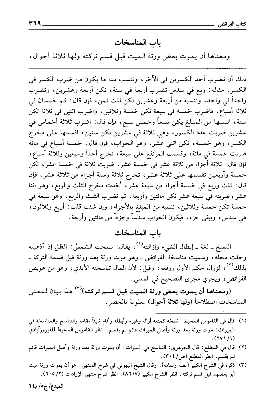 بَابُ الْمُنَاسَخَاتِ وَمَعْنَاهَا أَنْ يَمُوتَ بَعْضُ وَرَثَةِ الْمَيِّتِ قَبْلَ قَسْمِ تَرِكَتِهِ، وَلَهَا ثَلَاثَةُ أَحْوَالٍ،