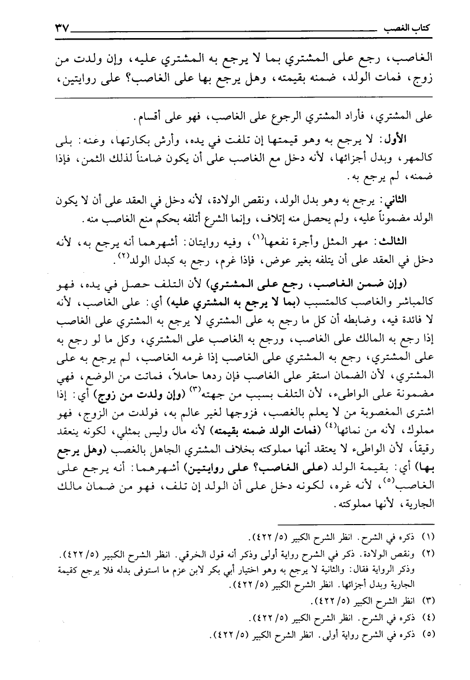 ـــــــــــــــــــــــــــــQعَلَى الْمُشْتَرِي فَأَرَادَ الْمُشْتَرِي الرُّجُوعَ عَلَى الْغَاصِبِ فَهُوَ عَلَى أَقْسَامٍ، الْأَوَّلُ: لَا يَرْجِعُ بِهِ، وَهُوَ قِيمَتُهَا إِنْ تَلِفَتْ فِي يَدِهِ، وَأَرْشُ بَكَارَتِهَا، وَعَنْهُ: بَلَى كَالْمَهْرِ، وَبَدَلِ أَجْزَائِهَا؛ لِأَنَّهُ دَخَلَ مَعَ الْغَاصِبِ عَلَى أَنْ يَكُونَ ضَامِنًا لِذَلِكَ الثَّمَنِ، فَإِذَا ضَمِنَهُ لَمْ يَرْجِعْ بِهِ. الثَّانِي: يَرْجِعُ بِهِ، وَهُوَ بَدَلُ الْوَلَدِ وَنَقْصِ الْوِلَادَةِ؛ لِأَنَّهُ دَخَلَ فِي الْعَقْدِ عَلَى أَنْ لَا يَكُونَ الْوَلَدُ مَضْمُونًا عَلَيْهِ، وَلَمْ يَحْصُلْ مِنْهُ إِتْلَافٌ، وَإِنَّمَا الشَّرْعُ أَتْلَفَهُ بِحُكْمِ مَنْعِ الْغَاصِبِ مِنْهُ. الثَّالِثُ: مَهْرُ الْمِثْلِ وَأُجْرَةُ نَفْعِهَا، وَفِيهِ رِوَايَتَانِ أَشْهَرُهُمَا أَنَّهُ يَرْجِعُ بِهِ؛ لِأَنَّهُ دَخَلَ فِي الْعَقْدِ عَلَى أَنْ يُتْلِفَهُ بِغَيْرِ عِوَضٍ، فَإِذَا غَرِمَ رَجَعَ بِهِ كَبَدَلِ الْوَلَدِ.