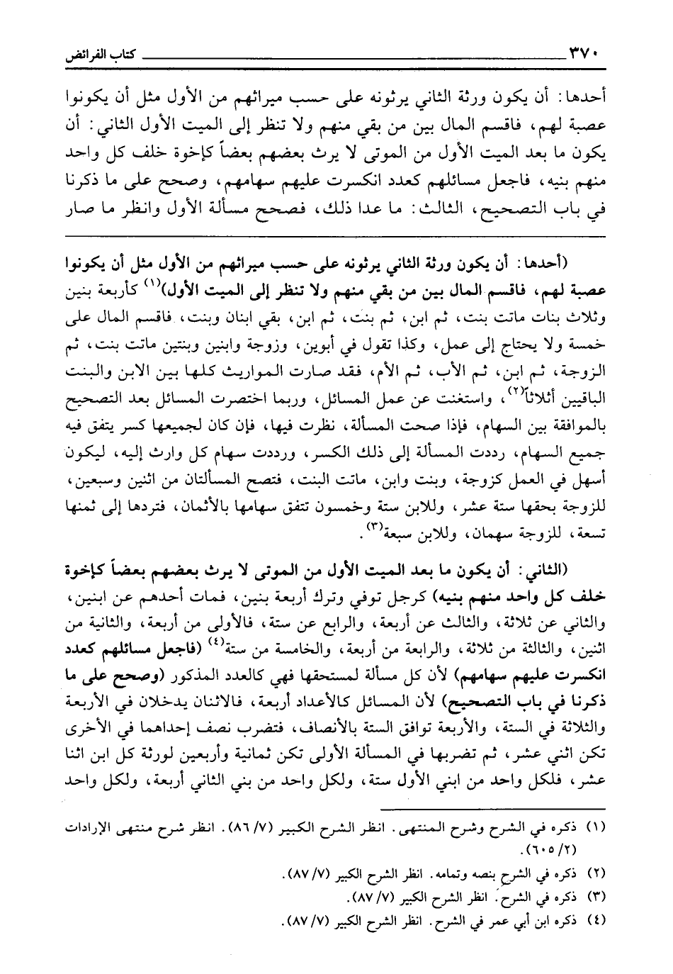 ـــــــــــــــــــــــــــــQ (أَحَدُهَا: أَنْ يَكُونَ وَرَثَةُ الثَّانِي يَرِثُونَهُ عَلَى حَسَبِ مِيرَاثِهِمْ مِنَ الْأَوَّلِ مِثْلَ أَنْ يَكُونُوا عَصَبَةً لَهُمْ، فَاقْسِمِ الْمَالَ بَيْنَ مَنْ بَقِيَ مِنْهُمْ، وَلَا تَنْظُرْ إِلَى الْمَيِّتِ الْأَوَّلِ) كَأَرْبَعَةِ بَنِينَ، وَثَلَاثِ بَنَاتٍ مَاتَتْ بِنْتٌ، ثُمَّ ابْنٌ، ثُمَّ بِنْتٌ، ثُمَّ ابْنٌ، بَقِيَ ابْنَانِ وَبِنْتٌ، فَاقْسِمِ الْمَالَ عَلَى خَمْسَةٍ، وَلَا يَحْتَاجُ إِلَى عَمَلٍ، وَكَذَا تَقُولُ فِي أَبَوَيْنِ وَزَوْجَةٍ وَابْنَيْنِ وَبِنْتَيْنِ، مَاتَتْ بِنْتٌ ثُمَّ الزَّوْجَةُ ثُمَّ ابْنٌ ثُمَّ الْأَبُ ثُمَّ الْأُمُّ، فَقَدْ صَارَتِ الْمَوَارِيثُ كُلُّهَا بَيْنَ الِابْنِ وَالْبِنْتِ الْبَاقِيَيْنِ أَثْلَاثًا، وَاسْتَغْنَتْ عَنْ عَمَلِ الْمَسَائِلِ، وَرُبَّمَا اخْتُصِرَتِ الْمَسَائِلُ بَعْدَ التَّصْحِيحِ بِالْمُوَافَقَةِ بَيْنَ السِّهَامِ، فَإِذَا صَحَّتِ الْمَسْأَلَةُ، نَظَرْتَ فِيهَا، فَإِنْ كَانَ لِجَمِيعِهَا كَسْرٌ يَتَّفِقُ فِيهِ جَمِيعُ السِّهَامِ، رَدَدْتَ الْمَسْأَلَةَ إِلَى ذَلِكَ الْكَسْرِ، وَرَدَدْتَ سِهَامَ كُلِّ وَارِثٍ إِلَيْهِ؛ لِيَكُونَ أَسْهَلَ فِي الْعَمَلِ كَزَوْجَةٍ، وَبِنْتٍ، وَابْنٍ، مَاتَتِ الْبِنْتُ، فَتَصِحُّ الْمَسْأَلَتَانِ مِنِ اثْنَيْنِ وَسَبْعِينَ، لِلزَّوْجَةِ بِحَقِّهَا سِتَّةَ عَشَرَ، وَلِلِابْنِ سِتَّةٌ وَخَمْسُونَ، تَتَّفِقُ سِهَامُهَا بِالْأَثْمَانِ، فَتَرُدُّهَا إِلَى ثُمُنِهَا تِسْعَةً، لِلزَّوْجَةِ سَهْمَانِ، وَلِلِابْنِ سَبْعَةٌ.