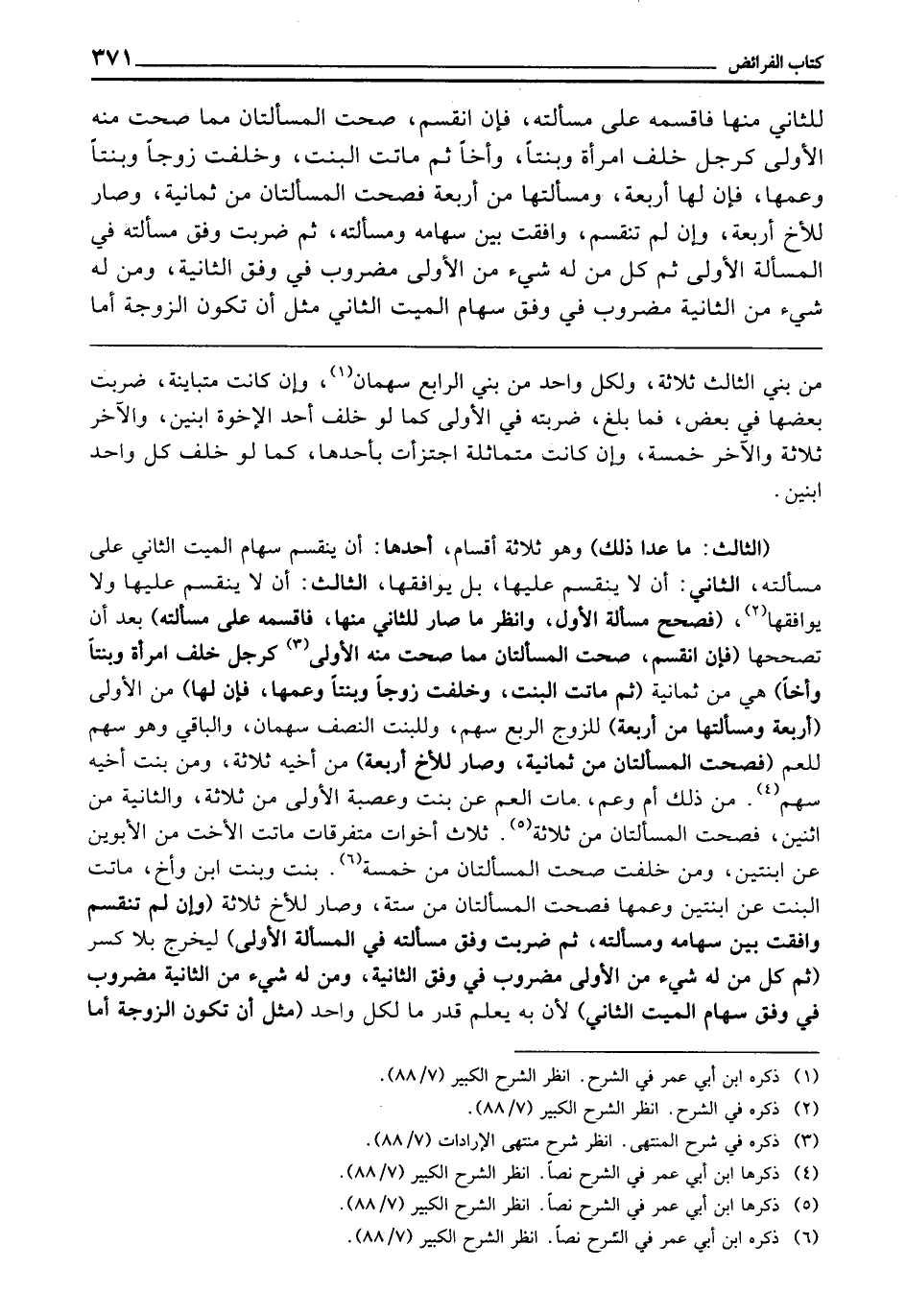 (الثَّالِثُ: مَا عَدَا ذَلِكَ) وَهُوَ ثَلَاثَةُ أَقْسَامٍ، أَحَدُهَا: أَنْ يَنْقَسِمَ سِهَامُ الْمَيِّتِ الثَّانِي عَلَى مَسْأَلَتِهِ، الثَّانِي: أَنْ لَا يَنْقَسِمَ عَلَيْهَا، بَلْ يُوَافِقَهَا، الثَّالِثُ: أَنْ لَا يَنْقَسِمَ عَلَيْهَا، وَلَا يُوَافِقَهَا (فَصَحِّحْ مَسْأَلَةَ الْأَوَّلِ، وَانْظُرْ مَا صَارَ لِلثَّانِي مِنْهَا، فَاقْسِمْهُ عَلَى مَسْأَلَتِهِ) بَعْدَ أَنْ تُصَحِّحَهَا (فَإِنِ انْقَسَمَ، صَحَّتِ الْمَسْأَلَتَانِ مِمَّا صَحَّتْ مِنْهُ الْأُولَى كَرَجُلٍ خَلَّفَ امْرَأَةً، وَبِنْتًا، وَأَخًا) هِيَ مِنْ ثَمَانِيَةٍ (ثُمَّ مَاتَتِ الْبِنْتُ، وَخَلَّفَتْ زَوْجًا وَبِنْتًا وَعَمَّهَا، فَإِنَّ لَهَا) مِنَ الْأُولَى (أَرْبَعَةً وَمَسْأَلَتُهَا مِنْ أَرْبَعَةٍ) لِلزَّوْجِ الرُّبُعُ سَهْمٌ، وَلِلْبِنْتِ النِّصْفُ سَهْمَانِ، وَالْبَاقِي، وَهُوَ سَهْمٌ لِلْعَمِّ (فَصَحَّتِ الْمَسْأَلَتَانِ مِنْ ثَمَانِيَةٍ، وَصَارَ لِلْأَخِ أَرْبَعَةٌ) مِنْ أَخِيهِ ثَلَاثَةٌ، وَمِنْ بِنْتِ أَخِيهِ سَهْمٌ. مِنْ ذَلِكَ أُمٌّ وَعَمٌّ، مَاتَ الْعَمُّ عَنْ بِنْتٍ وَعَصَبَةُ الْأُولَى مِنْ ثَلَاثَةٍ، وَالثَّانِيَةُ مِنِ اثْنَيْنِ، فَصَحَّتِ الْمَسْأَلَتَانِ مِنْ ثَلَاثَةٍ، ثَلَاثُ أَخَوَاتٍ مُتَفَرِّقَاتٍ مَاتَتِ الْأُخْتُ مِنَ الْأَبَوَيْنِ عَنِ ابْنَتَيْنِ، وَمَنْ خَلَّفَتْ صَحَّتِ الْمَسْأَلَتَانِ مِنْ خَمْسَةٍ. بِنْتٌ وَبِنْتُ ابْنٍ وَأَخٌ، مَاتَتِ الْبِنْتُ عَنِ ابْنَتَيْنِ وَعَمِّهَا، فَصَحَّتِ الْمَسْأَلَتَانِ مِنْ سِتَّةٍ، وَصَارَ لِلْأَخِ ثَلَاثَةٌ (وَإِنْ لَمْ تَنْقَسِمْ، وَافَقْتَ بَيْنَ سِهَامِهِ، وَمَسْأَلَتِهِ، ثُمَّ ضَرَبْتَ وَفْقَ مَسْأَلَتِهِ فِي الْمَسْأَلَةِ الْأُولَى) لِيَخْرُجَ بِلَا كَسْرٍ (ثُمَّ كُلُّ مَنْ لَهُ شَيْءٌ مِنَ الْأُولَى مَضْرُوبٌ فِي وَفْقِ الثَّانِيَةِ، وَمَنْ لَهُ شَيْءٌ مِنَ الثَّانِيَةِ مَضْرُوبٌ فِي وَفْقِ سِهَامِ الْمَيِّتِ الثَّانِي) لِأَنَّ بِهِ يُعْلَمُ قَدْرُ مَا لِكُلِّ وَاحِدٍ (مِثْلَ أَنْ تَكُونَ الزَّوْجَةُ أُمًّا